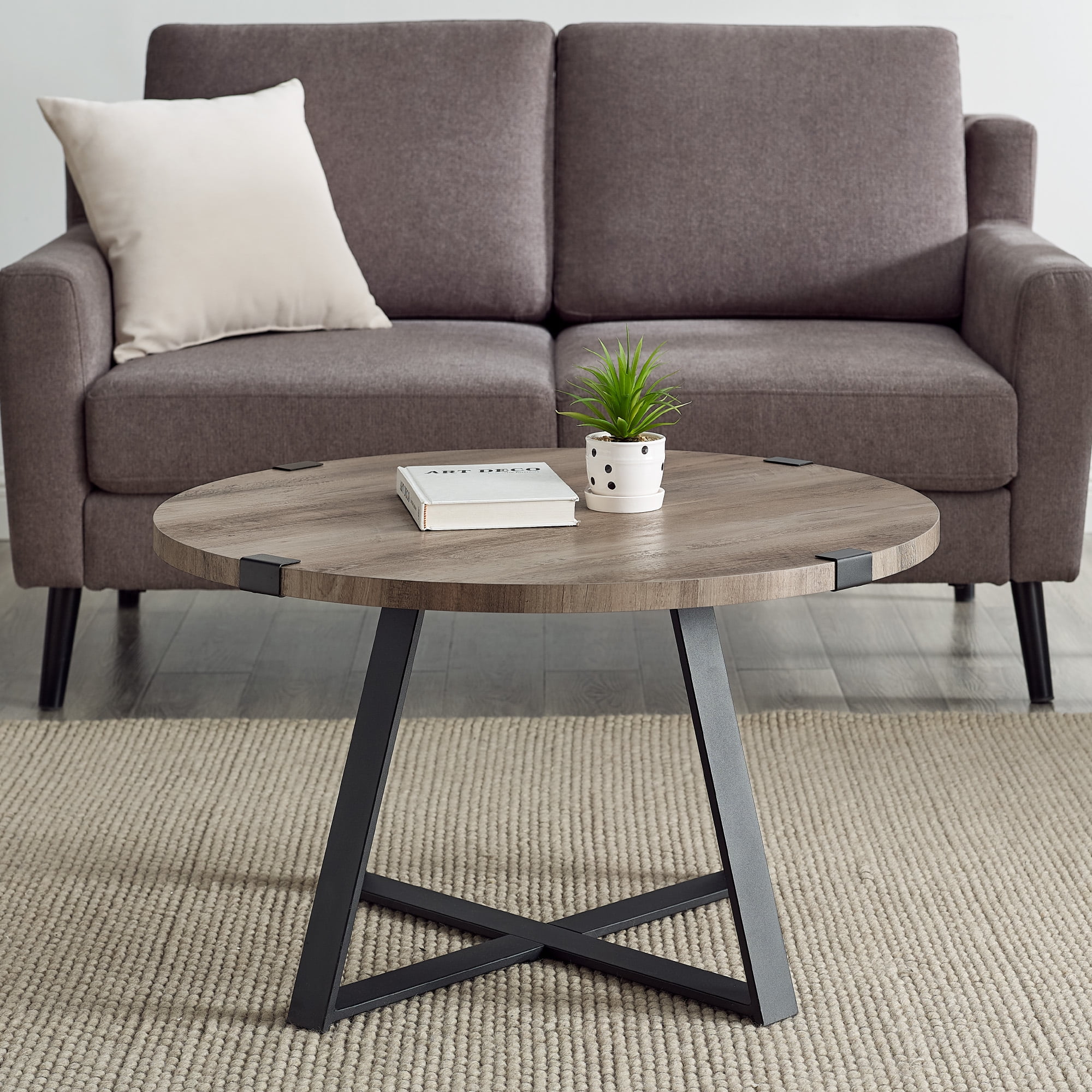 Metal wrap accents Powder-coated X-base Industrial style Circle coffee table Small space friendly Mixed material cocktail table High-quality wood grain laminate table top Assembled Dimensions: 17″ H x 31″ L x 31″ W Packaged dimensions: 5″ H x 33″ L x 33″ W Assembly: Some assembly required Materials: High-grade MDF, premium laminate, painted metal Ships in 1 box