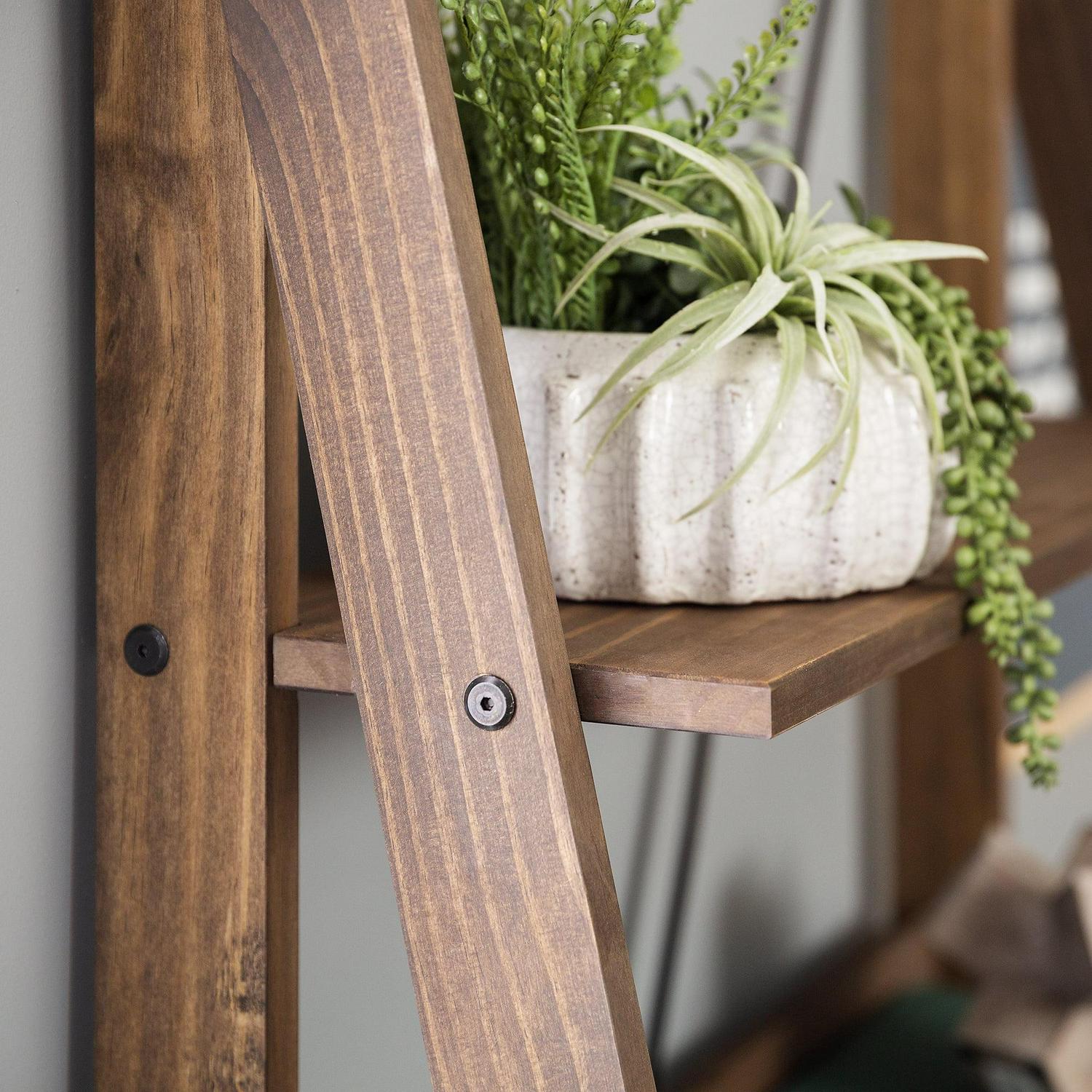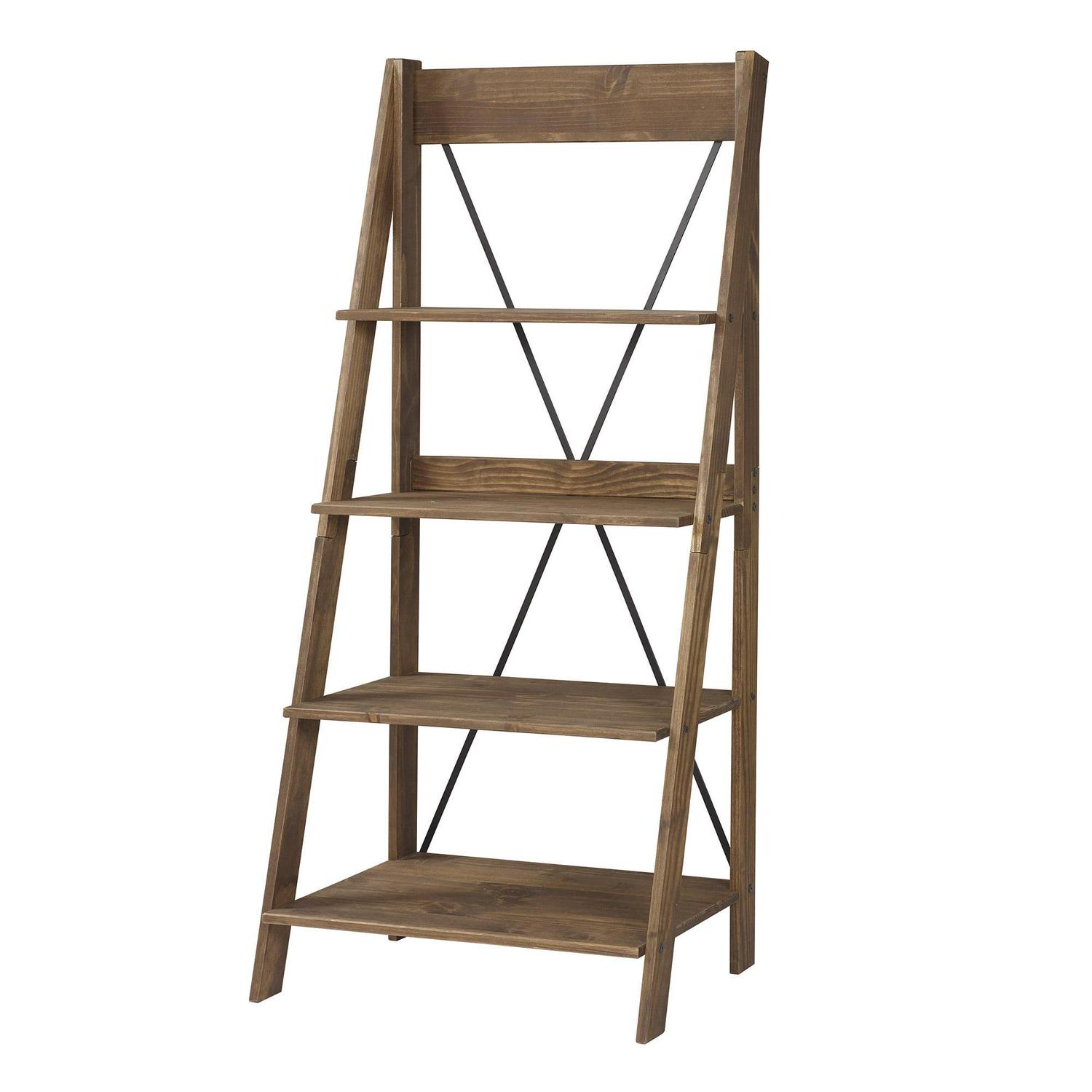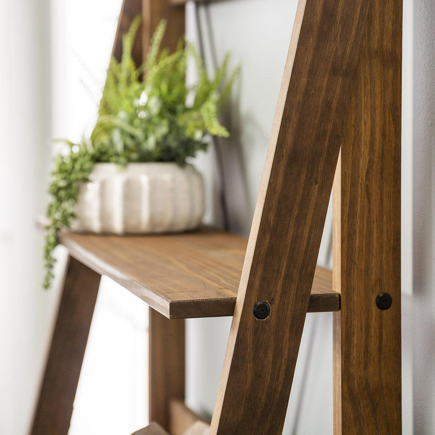 Whether you decide to cascade your growing collection of house plants or show off your personal art gallery on this Farmhouse Brown Solid Wood 4-Shelf Ladder Bookshelf by Walker Edison, its four fixed shelves will support whatever you choose. This straightforward bookshelf blends well with a variety of room styles. Made from pine wood, this durable ladder shelf features a metal X on the back of the unit for an extra design splash.