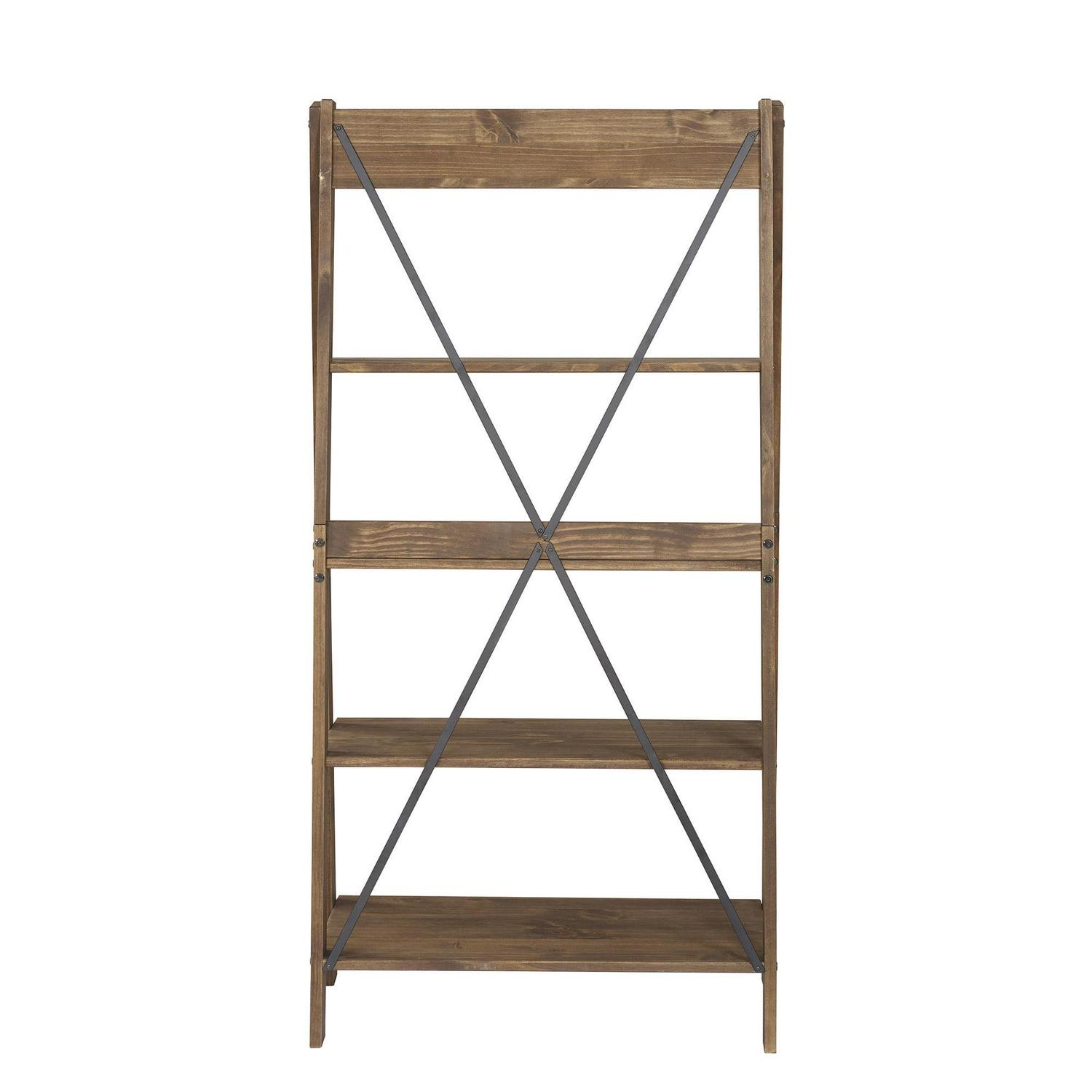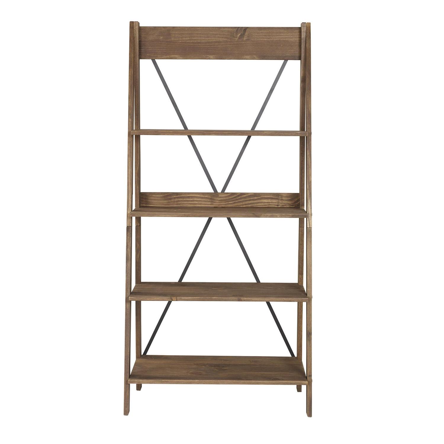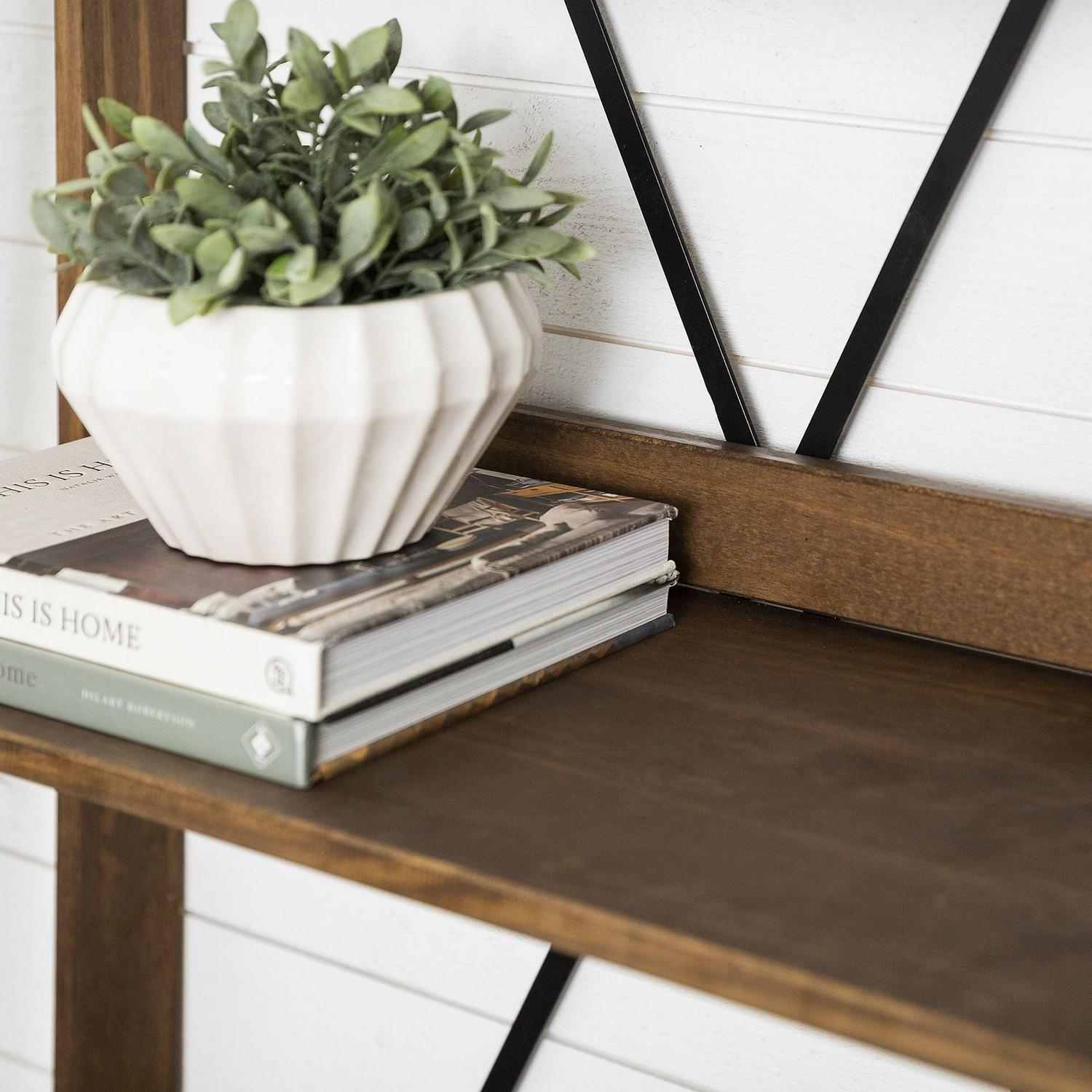 Whether you decide to cascade your growing collection of house plants or show off your personal art gallery on this Farmhouse Brown Solid Wood 4-Shelf Ladder Bookshelf by Walker Edison, its four fixed shelves will support whatever you choose. This straightforward bookshelf blends well with a variety of room styles. Made from pine wood, this durable ladder shelf features a metal X on the back of the unit for an extra design splash.