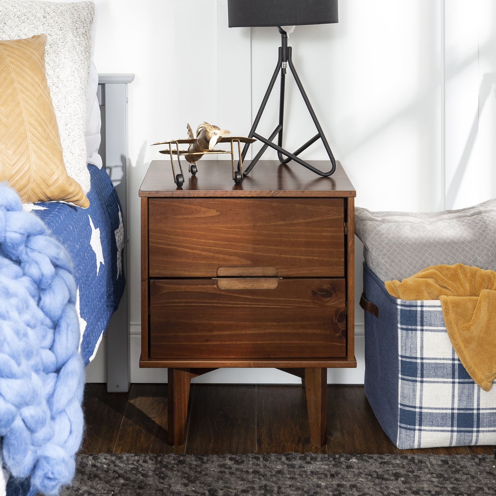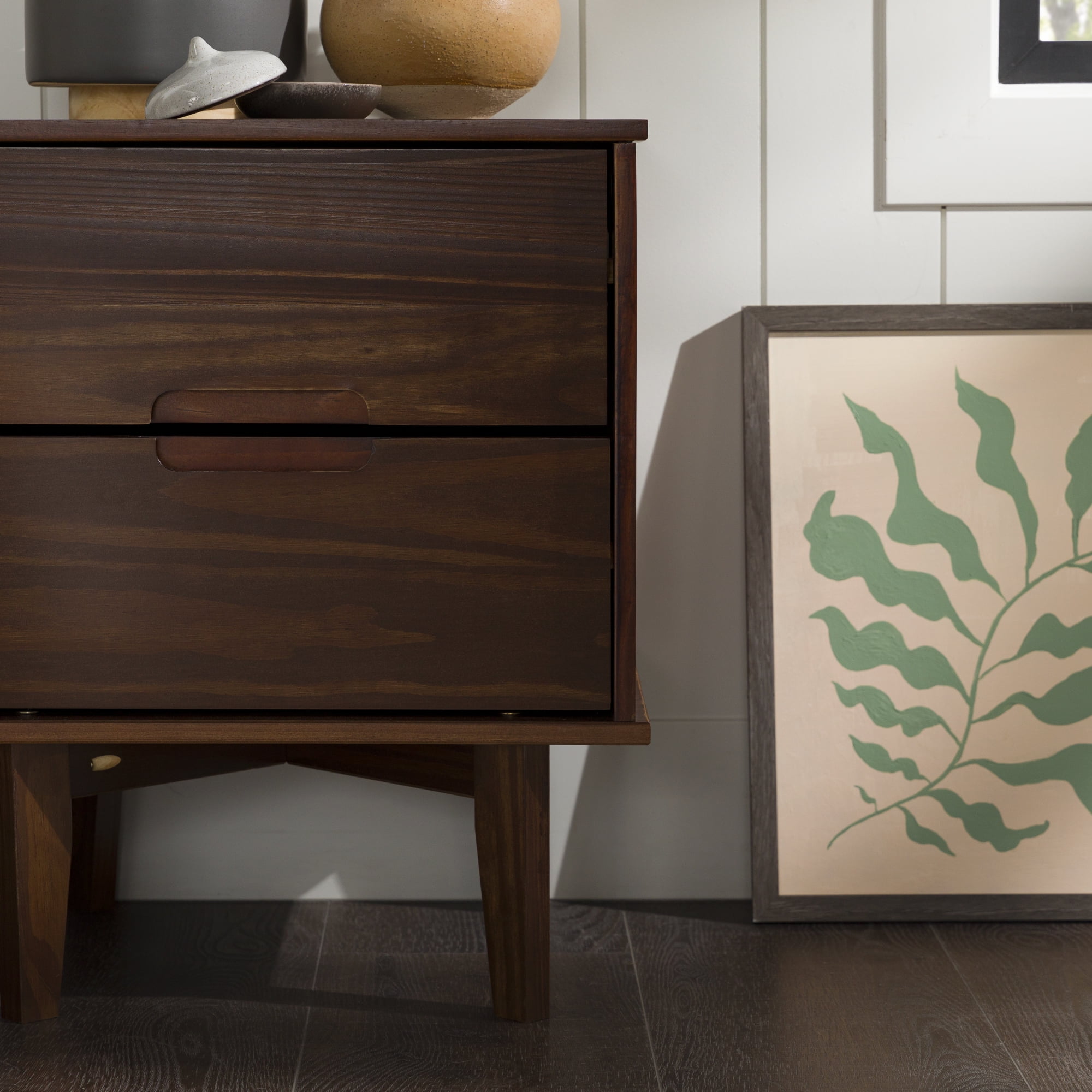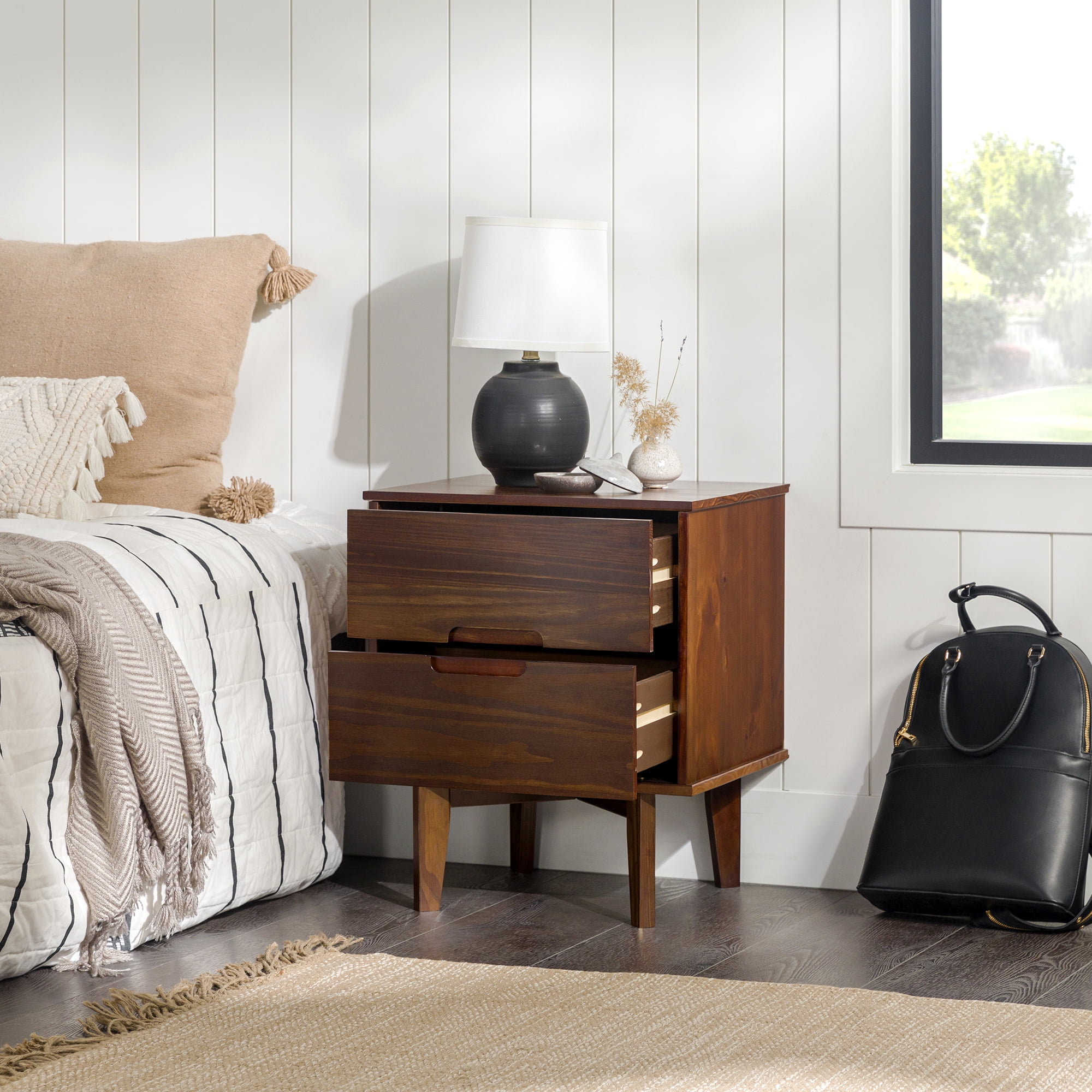 Make a statement with the Sonoma 2-Drawer Nightstand by Walker Edison that will highlight your unique flair as well as your practicality. This solid wood bedside table has two equal sized drawers with sleek cutout handles. The drawers smoothly transition with wood on wood runners, which also means this box frame bedside table looks great from any angle whether the drawers are left open or pushed back in. Closed storage options mean you can conveniently tuck away bedside accessories. The cutout handles, leg design, and solid wood construction of this nightstand create a modern version of the classic mid-century look and feel. This accent table is also functional in living rooms as a side table.