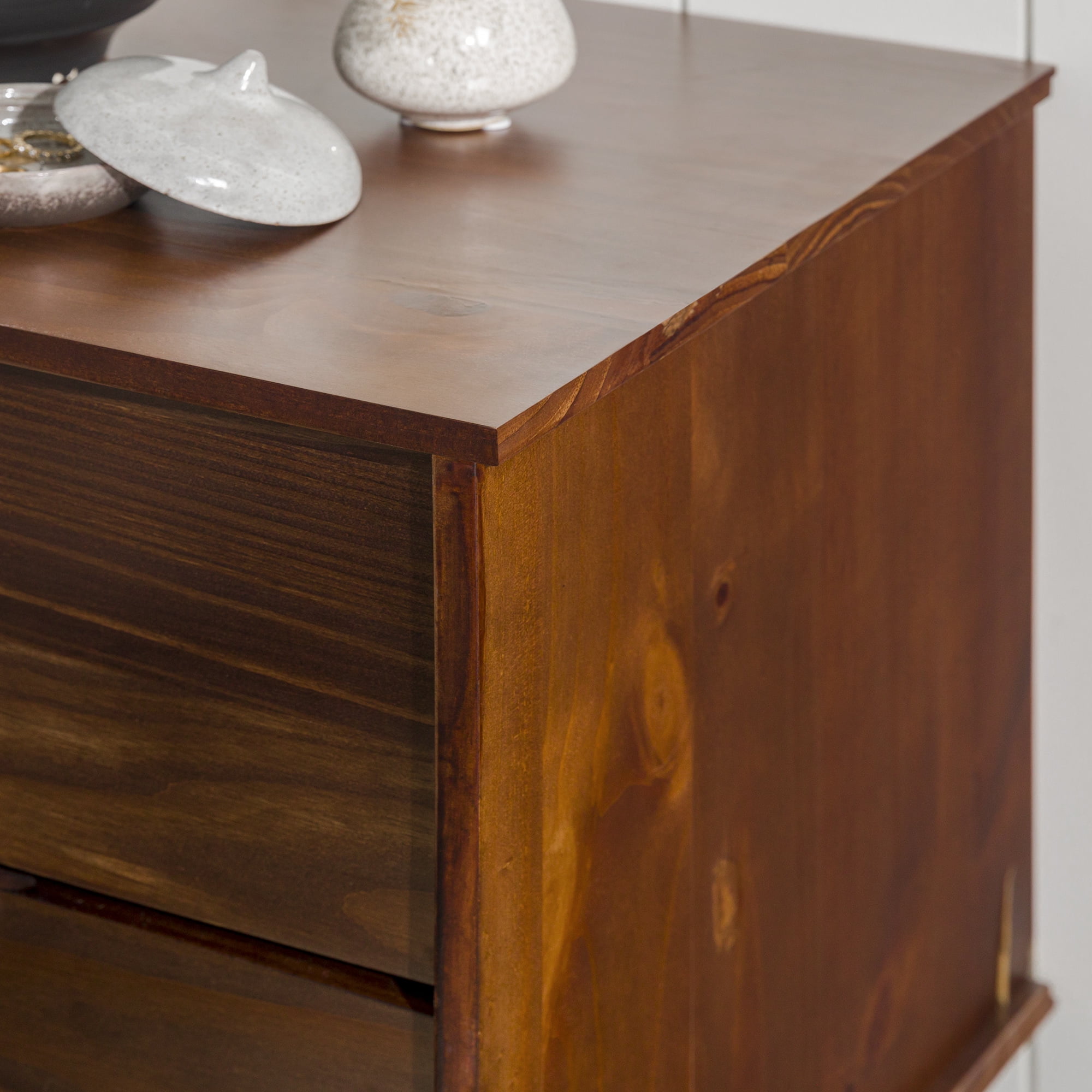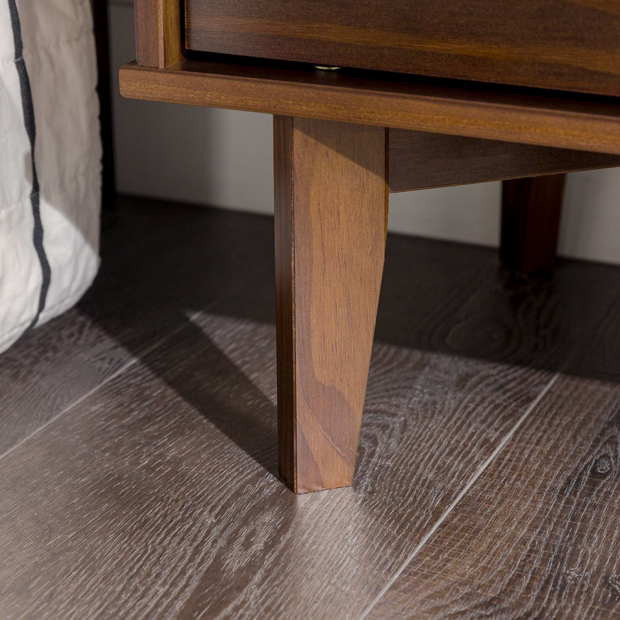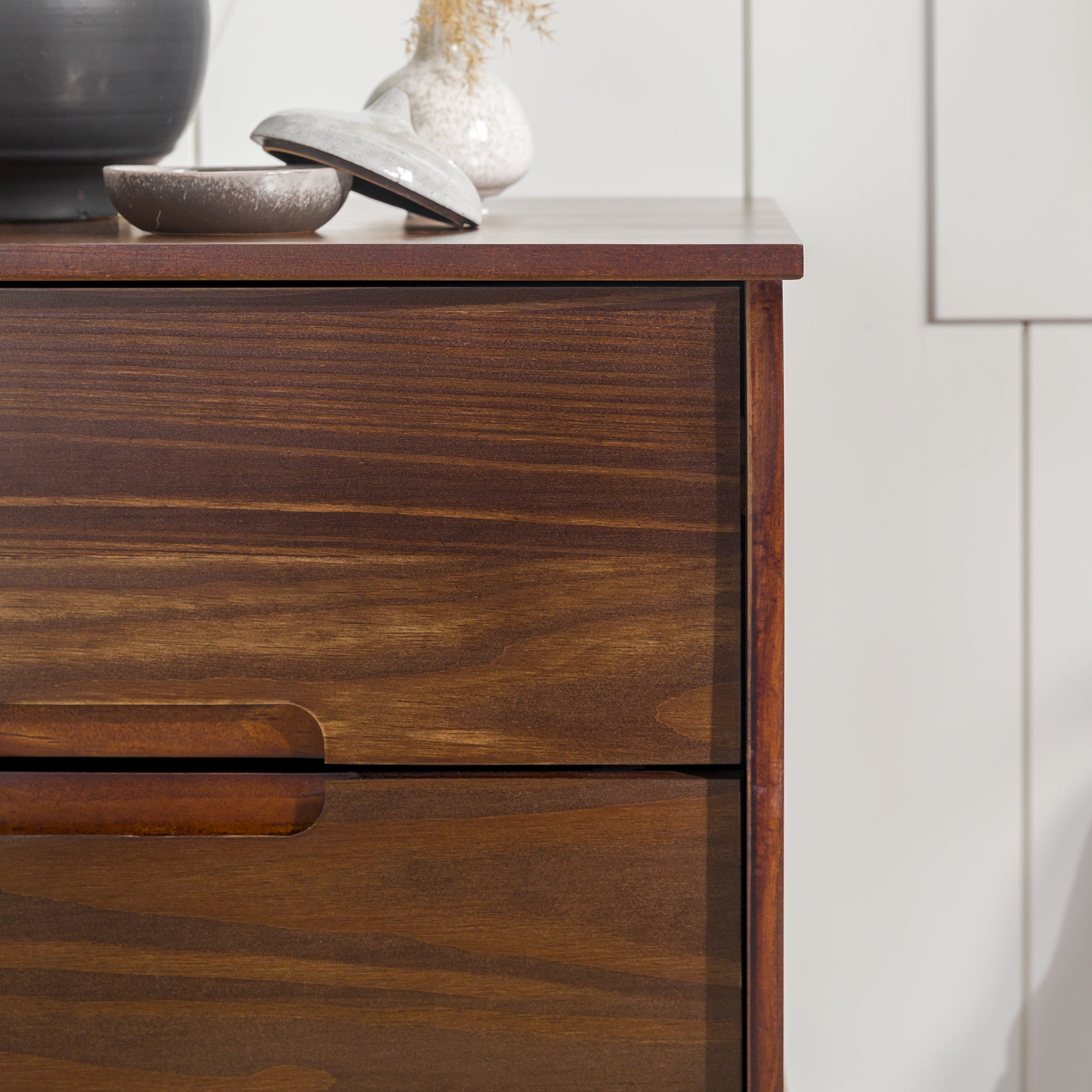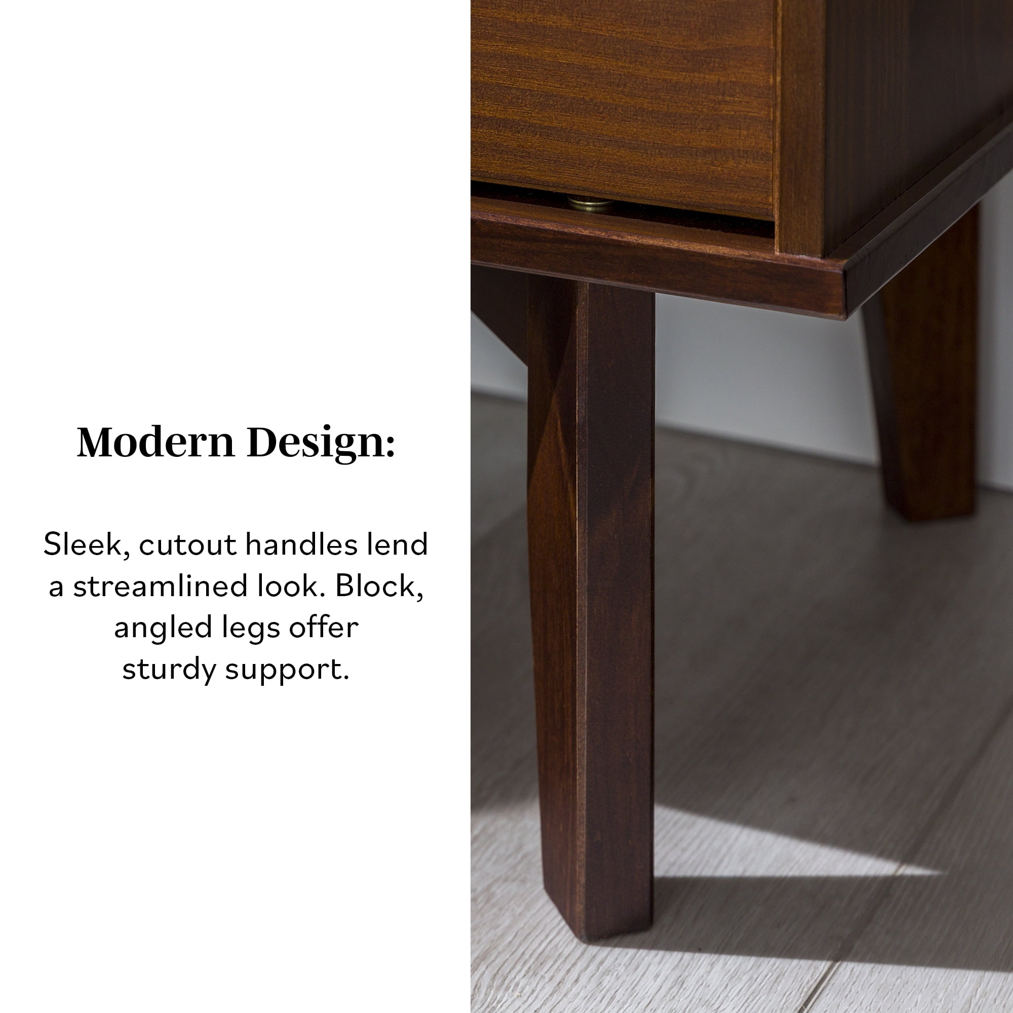 Make a statement with the Sonoma 2-Drawer Nightstand by Walker Edison that will highlight your unique flair as well as your practicality. This solid wood bedside table has two equal sized drawers with sleek cutout handles. The drawers smoothly transition with wood on wood runners, which also means this box frame bedside table looks great from any angle whether the drawers are left open or pushed back in. Closed storage options mean you can conveniently tuck away bedside accessories. The cutout handles, leg design, and solid wood construction of this nightstand create a modern version of the classic mid-century look and feel. This accent table is also functional in living rooms as a side table.