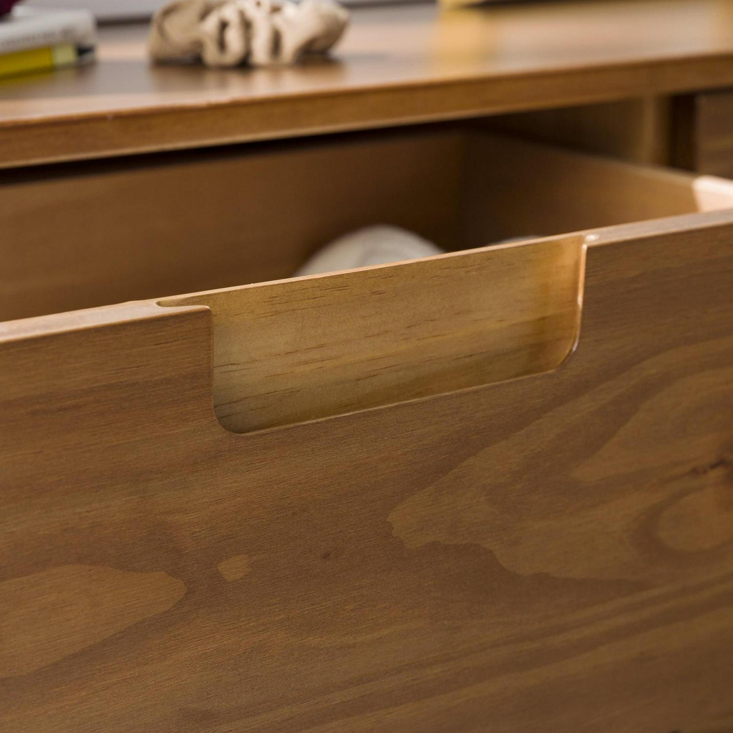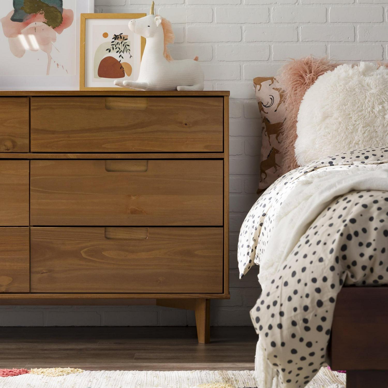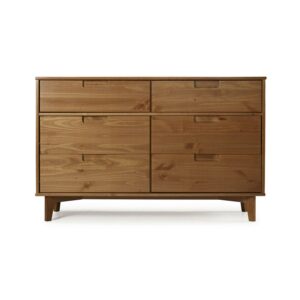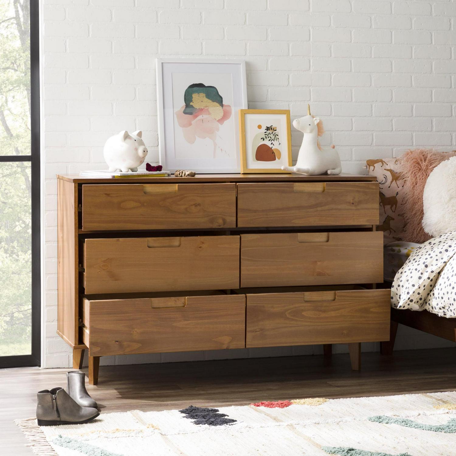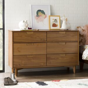 You will never need another dresser after purchasing the Sonoma 6-Drawer Caramel Dresser by Walker Edison because of its timeless flair. Made from solid pine wood, this mid-century chest was created for durability and maximum storage. Hide away valuables and clutter in a closed storage space to create a relaxed, clean space using the six large drawers. Set up is simple because of wooden runners and cutout handles, which also add to the design. The painted finish is sure to fit in with any home decor and will enhance any room, from modern to retro. Upgrade your bedroom vibe today through precise organization with this stylish dresser.