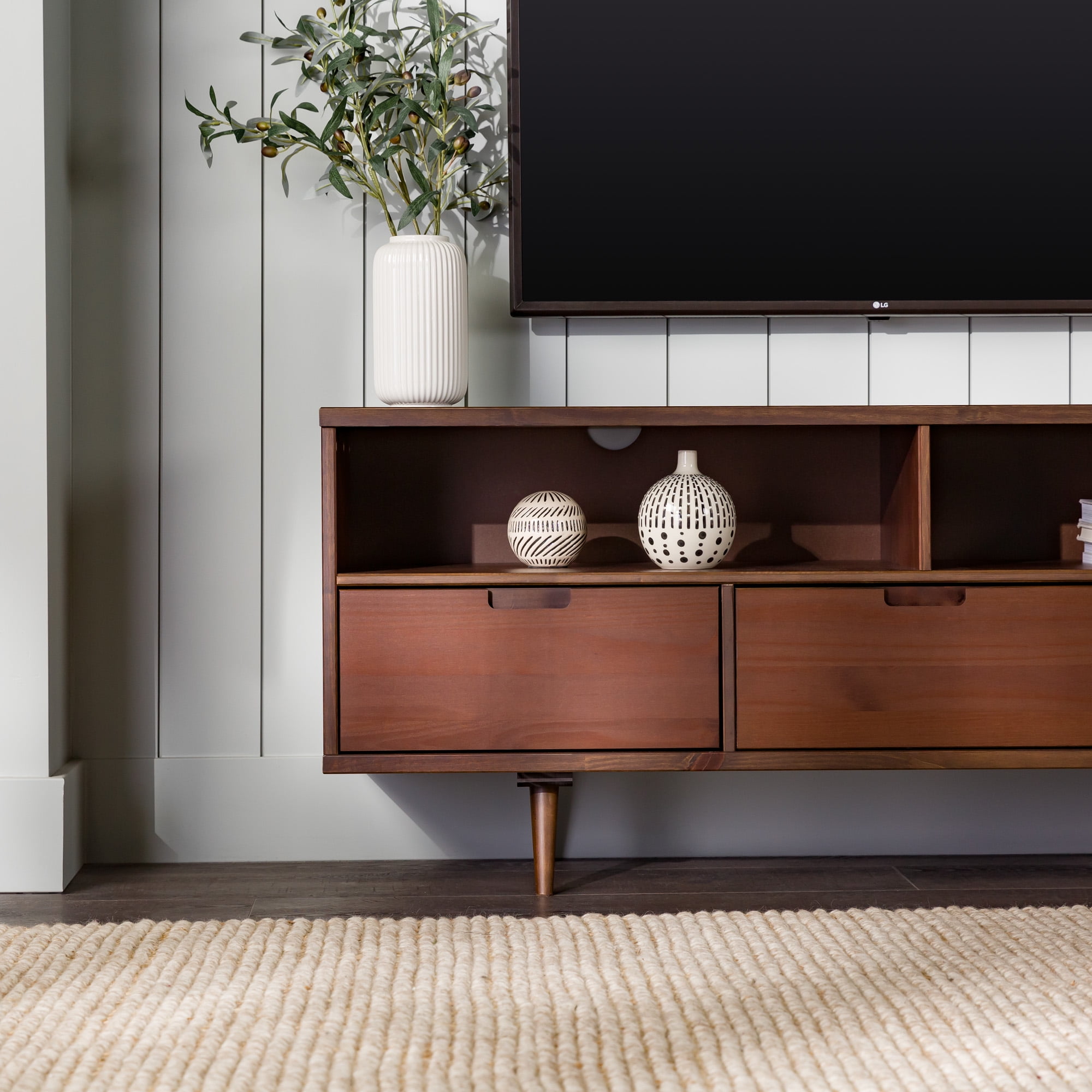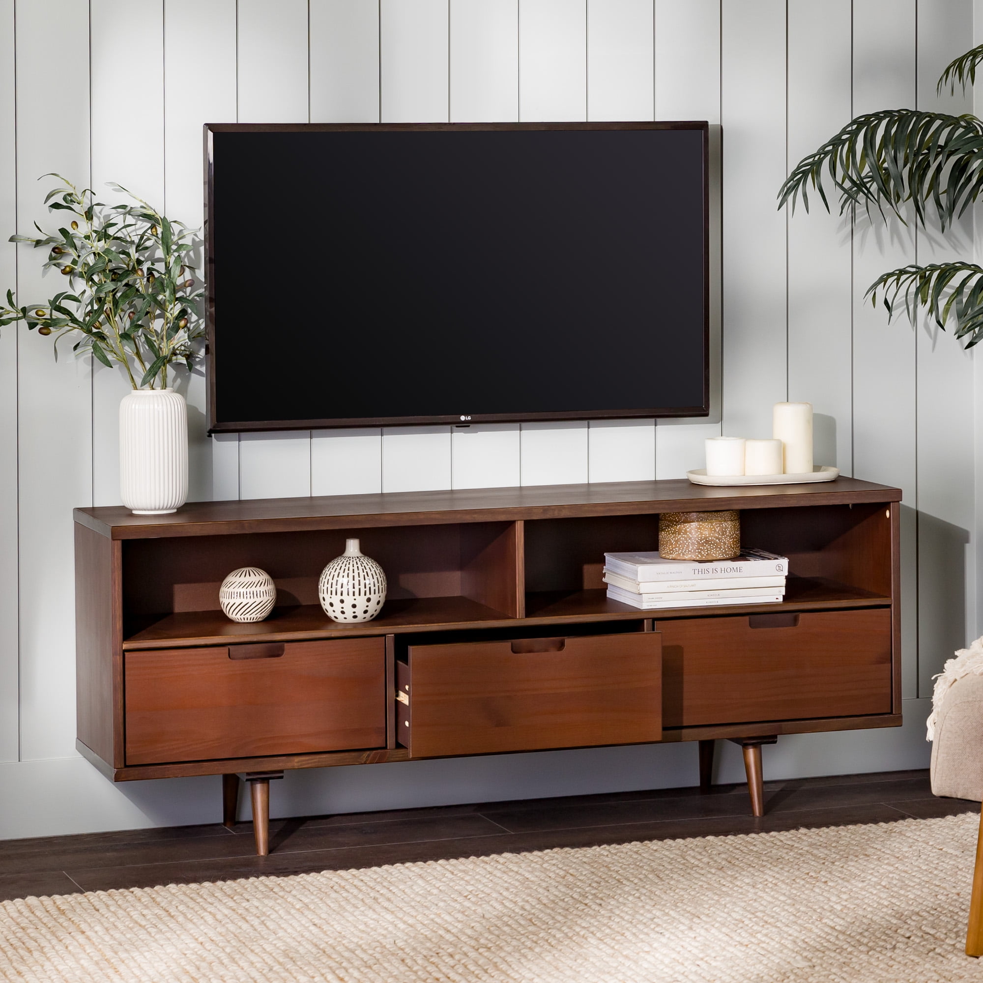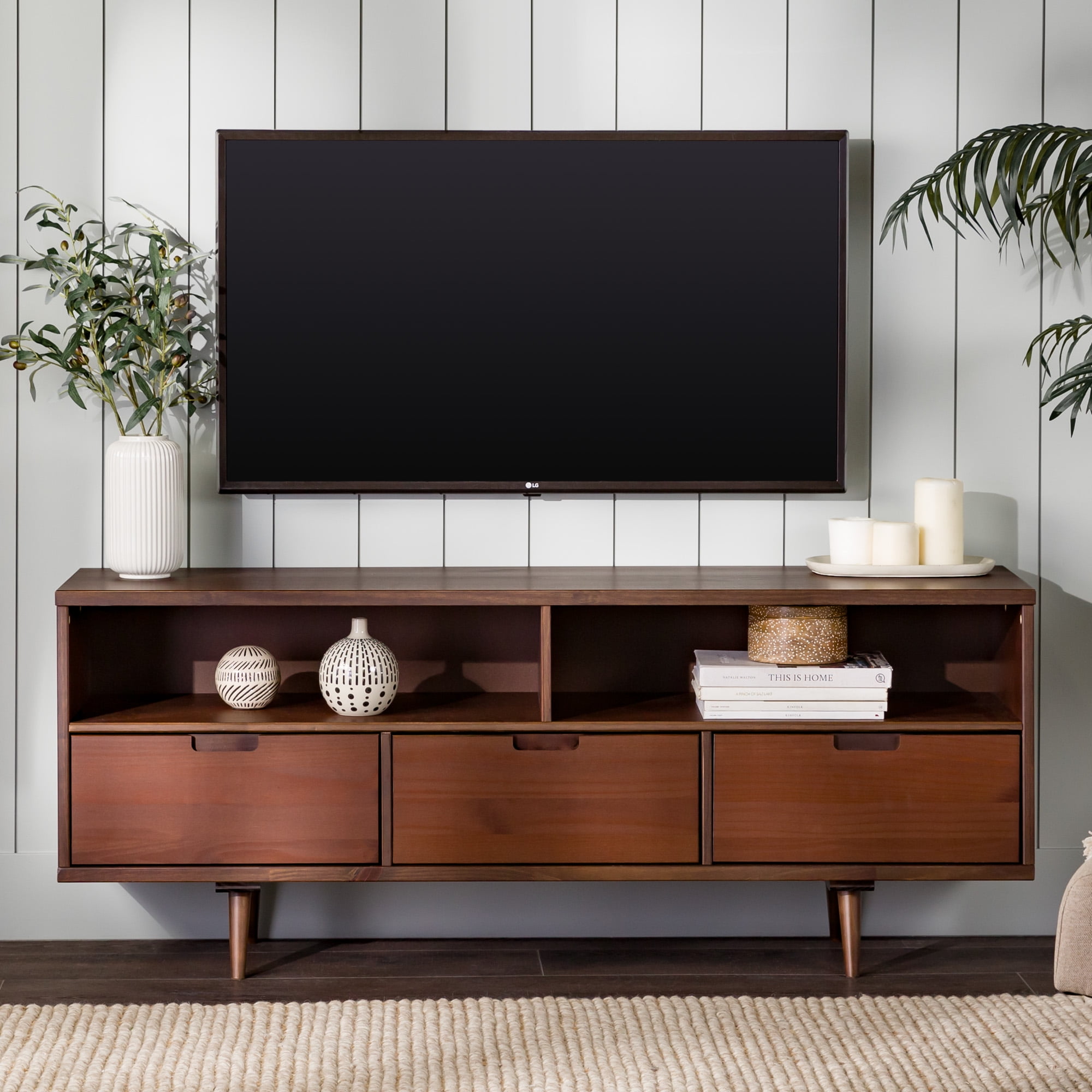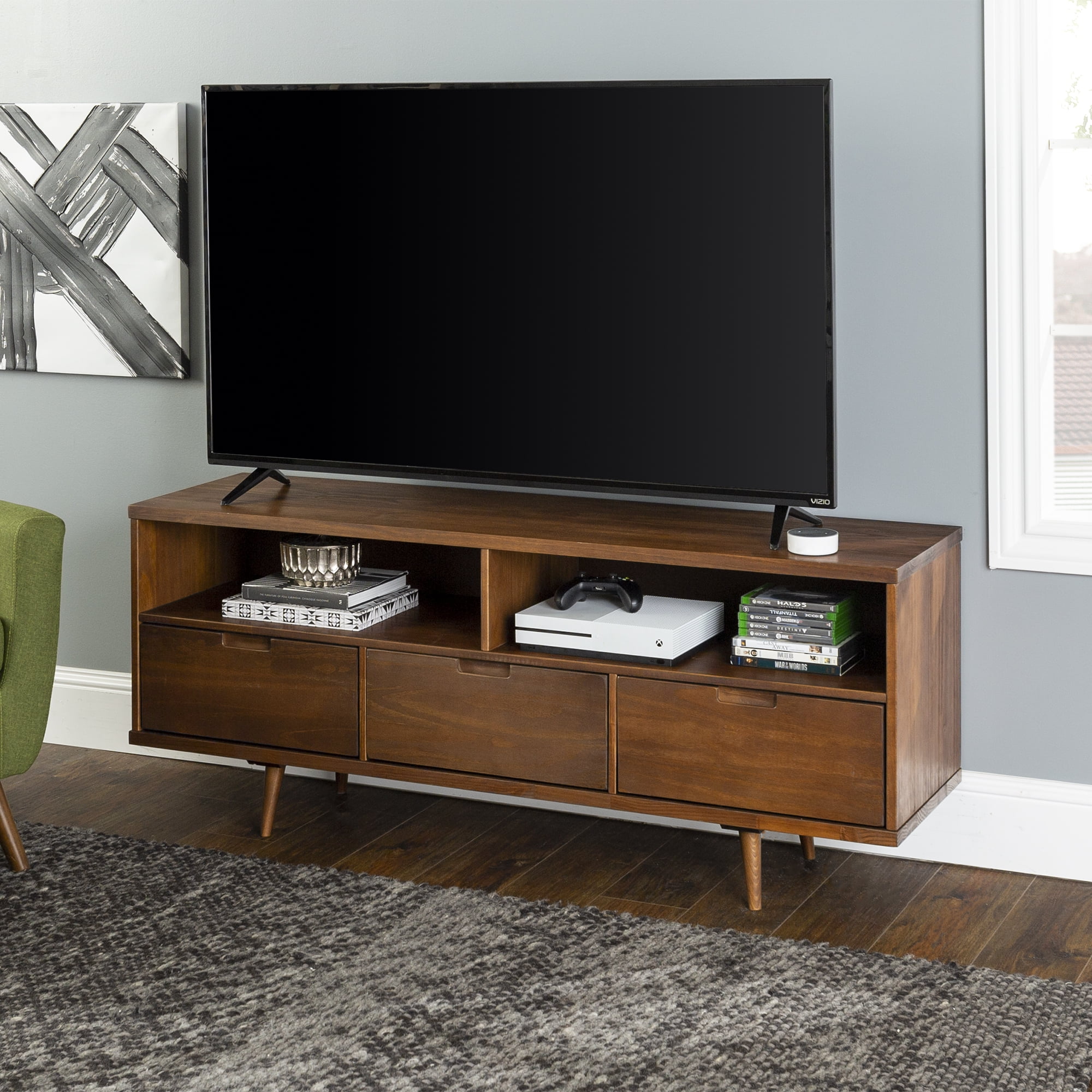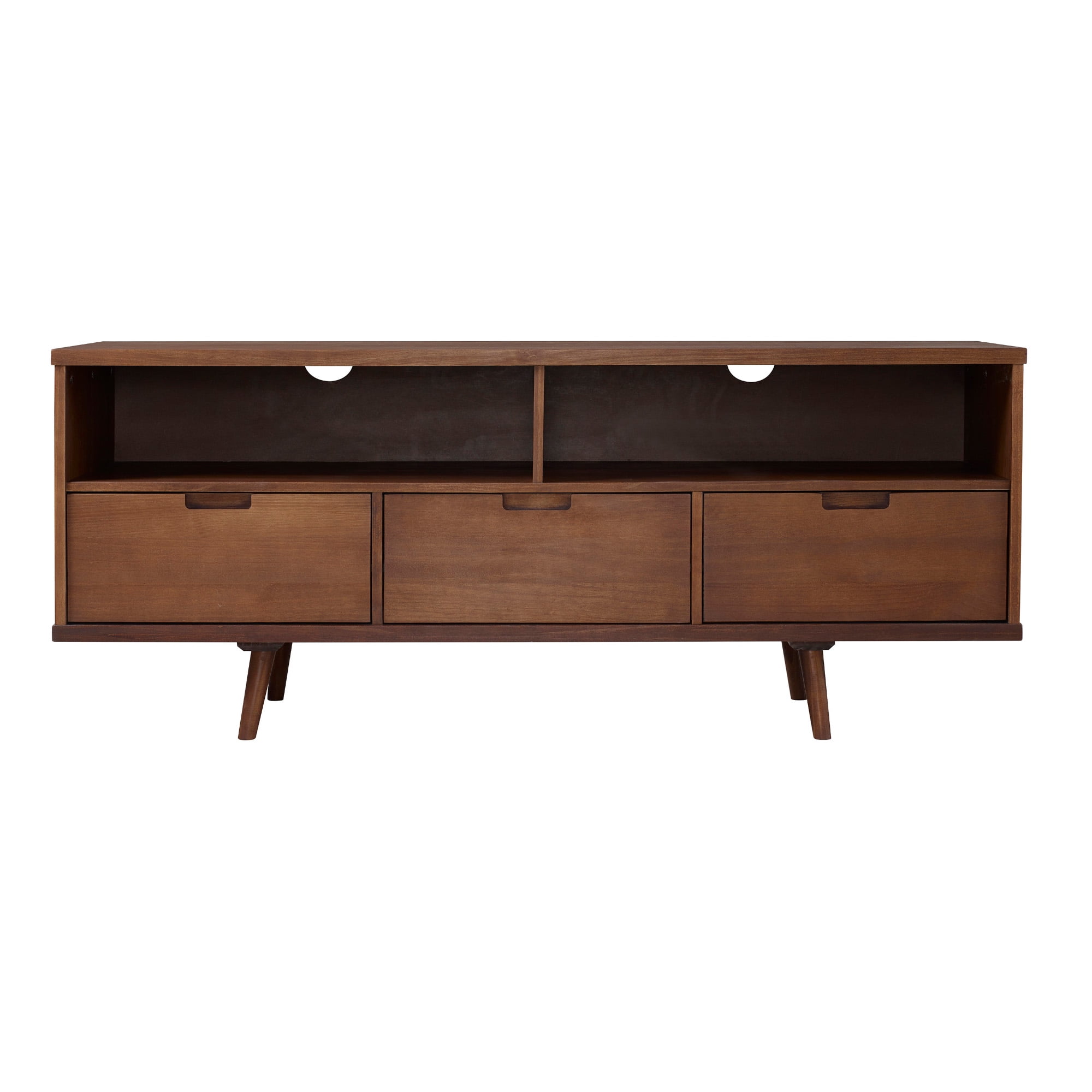 Create the perfect entertainment spot in the comfort of your home with this modern media console by Walker Edison. Three lower drawers with cutout handles provide a spot for movies, blankets, and other watch party essentials. The retro, angled legs and boxy silhouette complement any home decor with its mid-century character. Two open storage cubbies with cord management options allow for gaming systems and other electronic accessories. Place in your bedroom for an intimate entertainment center experience with clothing and towel storage. Put in the living room to become the perfect host and build a homey ambiance. Made from solid pine wood, this TV console will become a staple in your house for years to come.