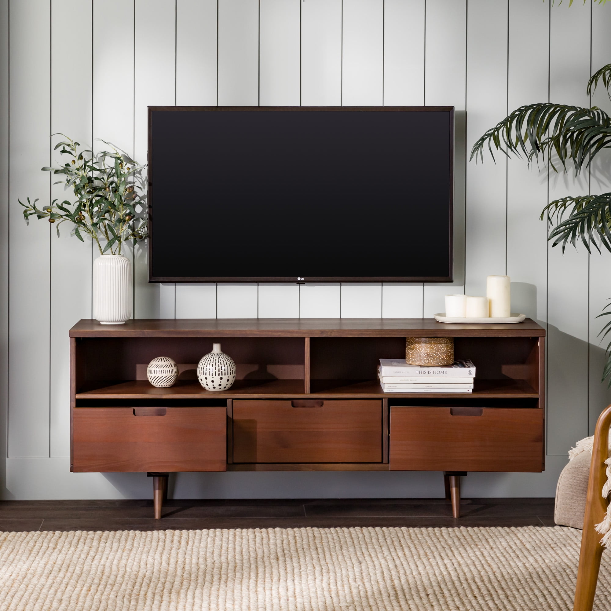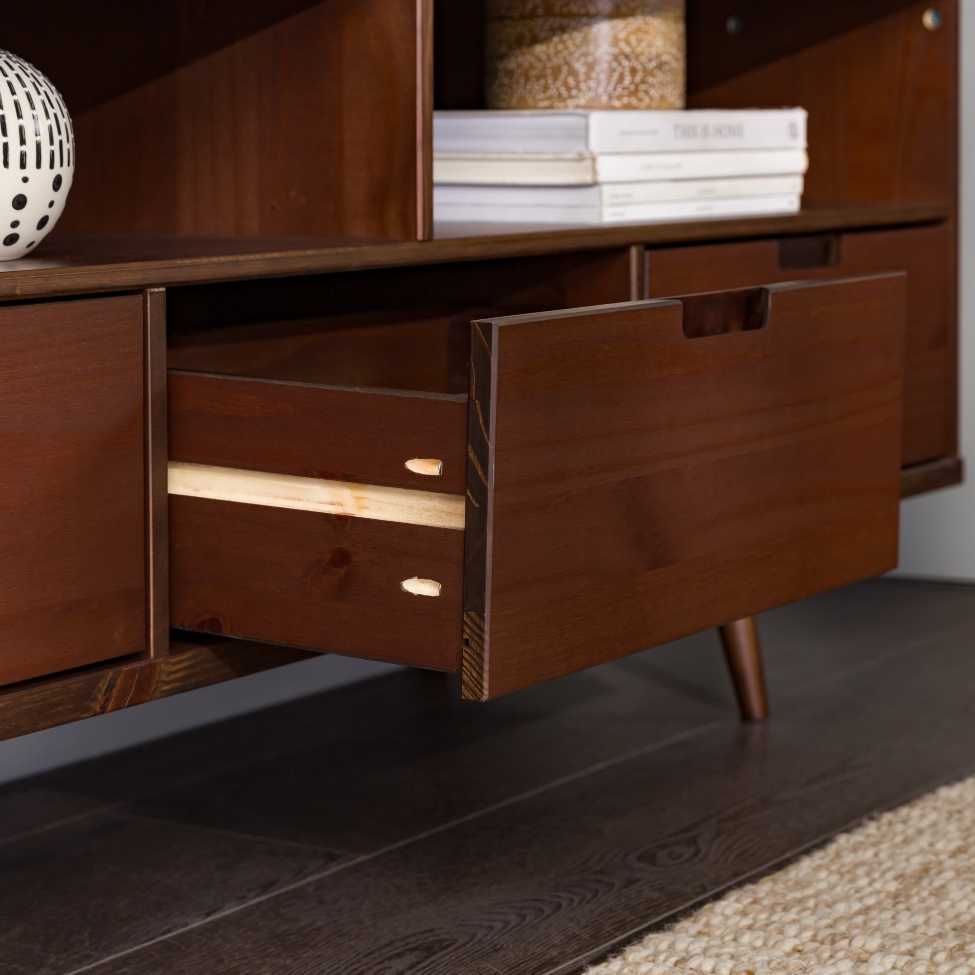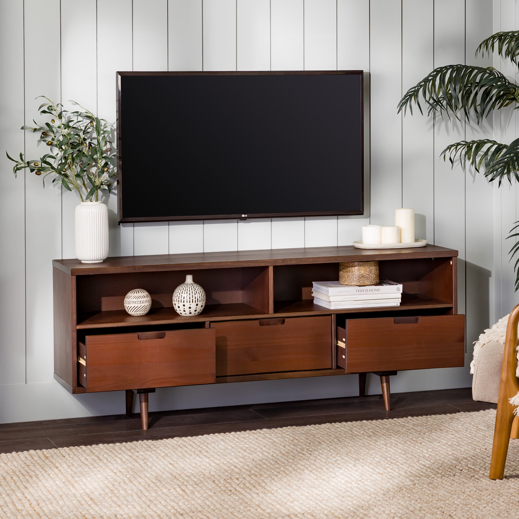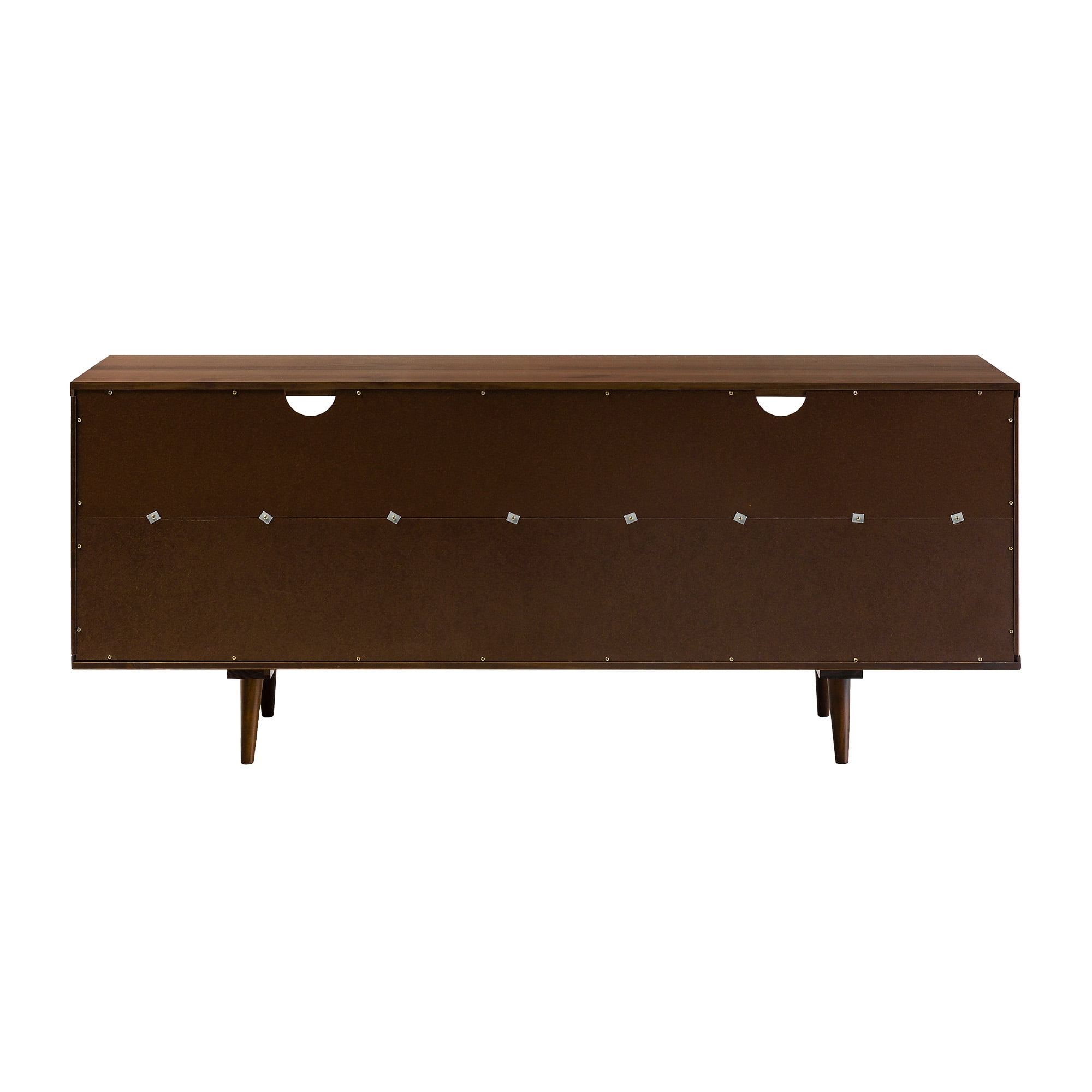 Packaged dimensions: 6″ H x 69″ L x 19″ W Assembled Dimensions: 6″ H x 68.75″ L x 18.5″ W Materials: Solid pine wood Assembly: Some assembly required Walnut finish Mid-century modern accent console 3 lower drawers with cutout handles 4 angled legs 2 open storage cubbies Cord management options Accommodates TVs up to 65”