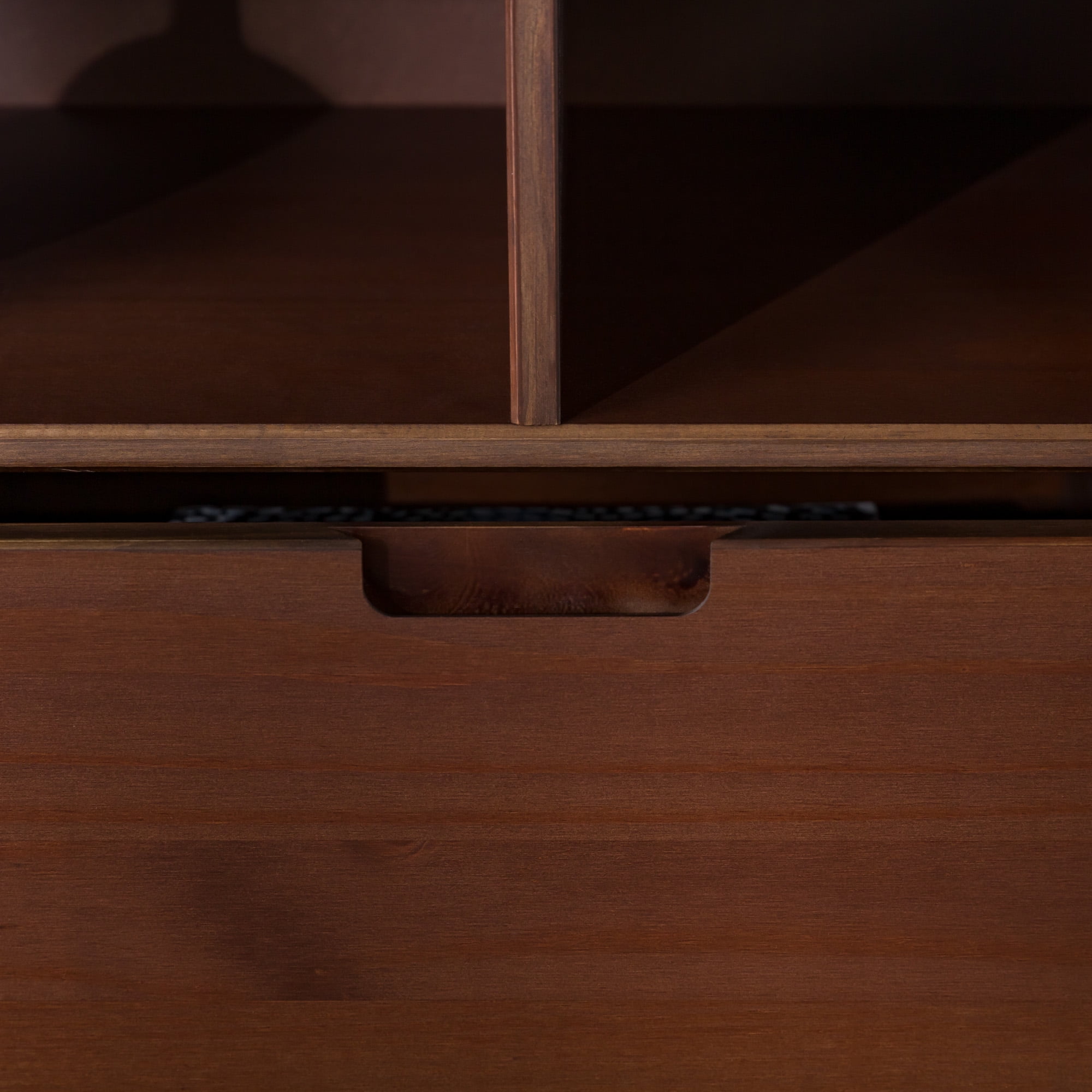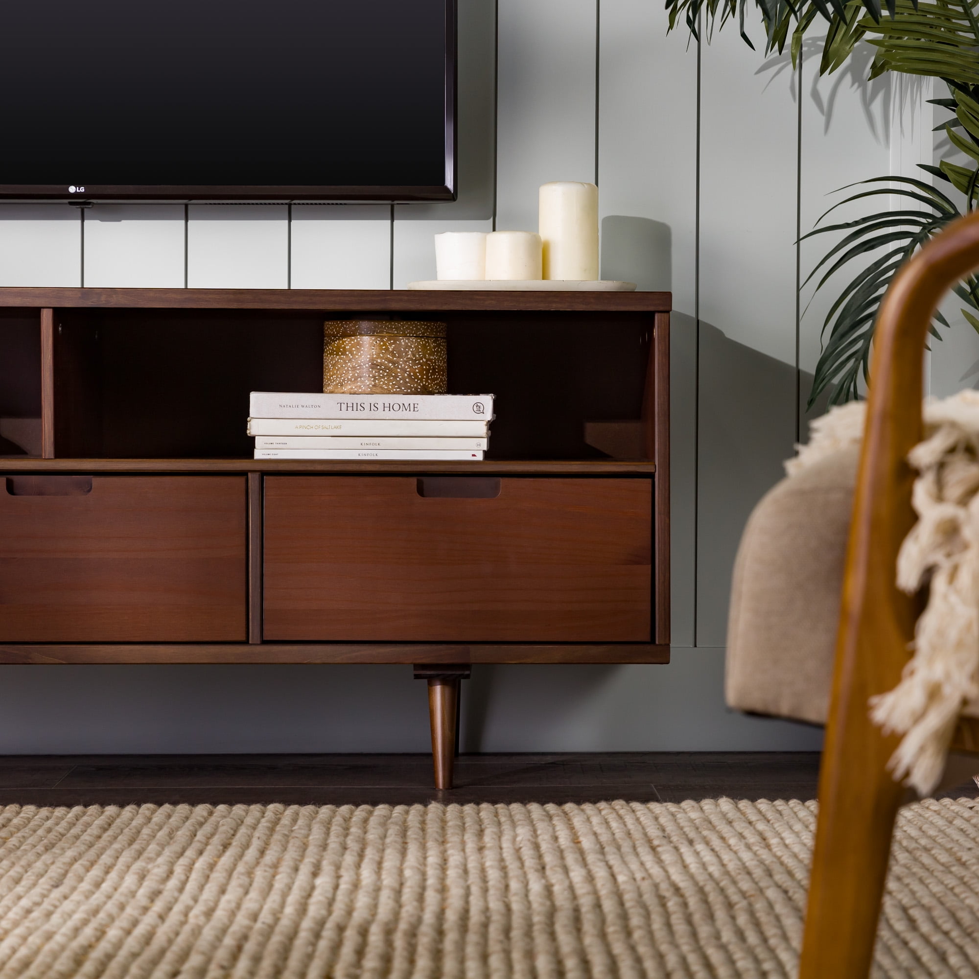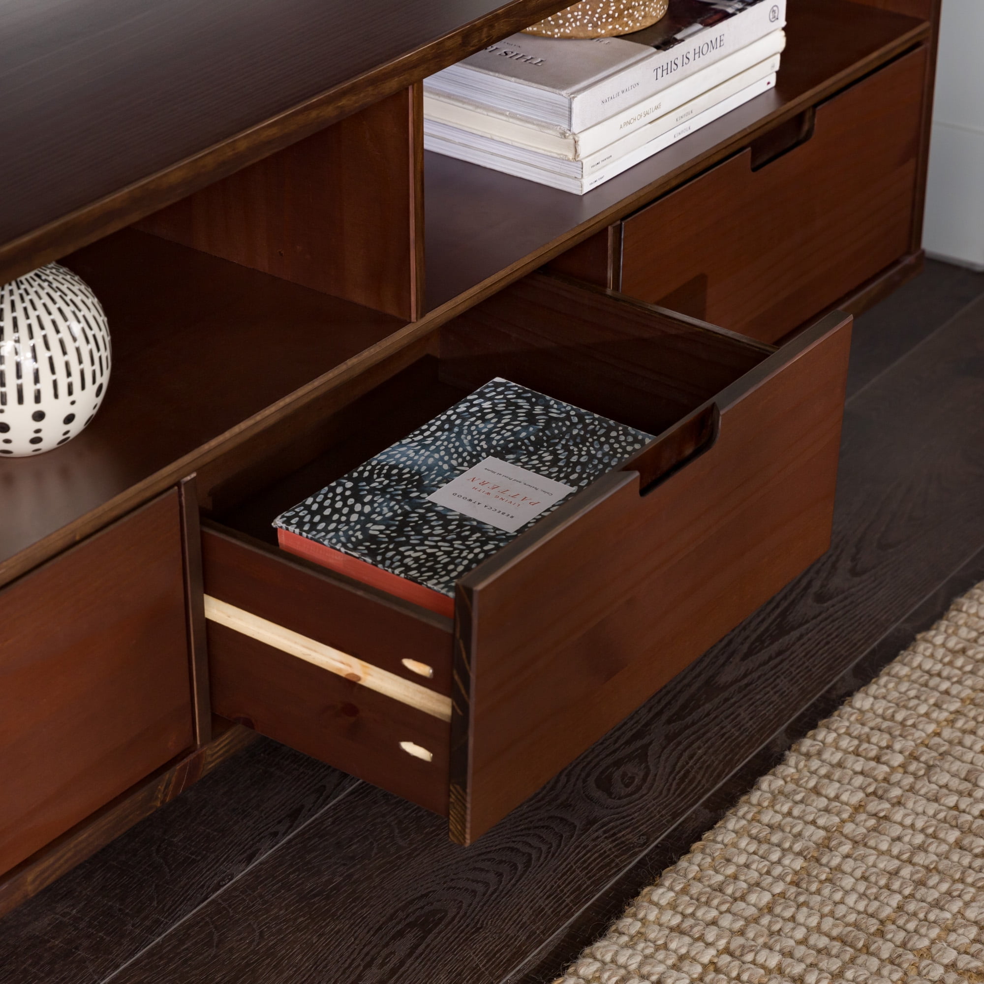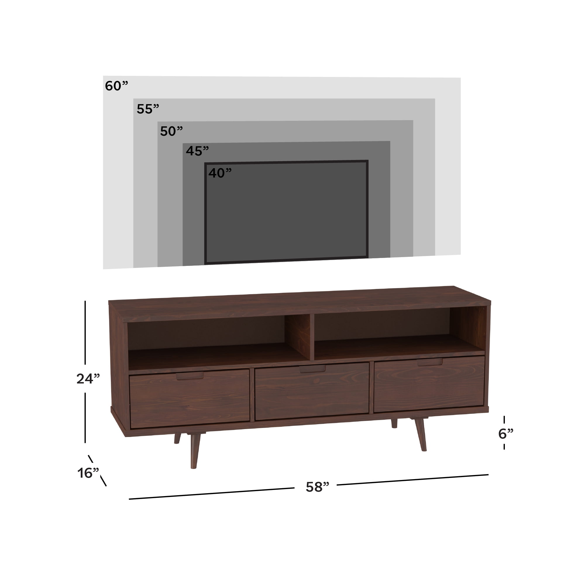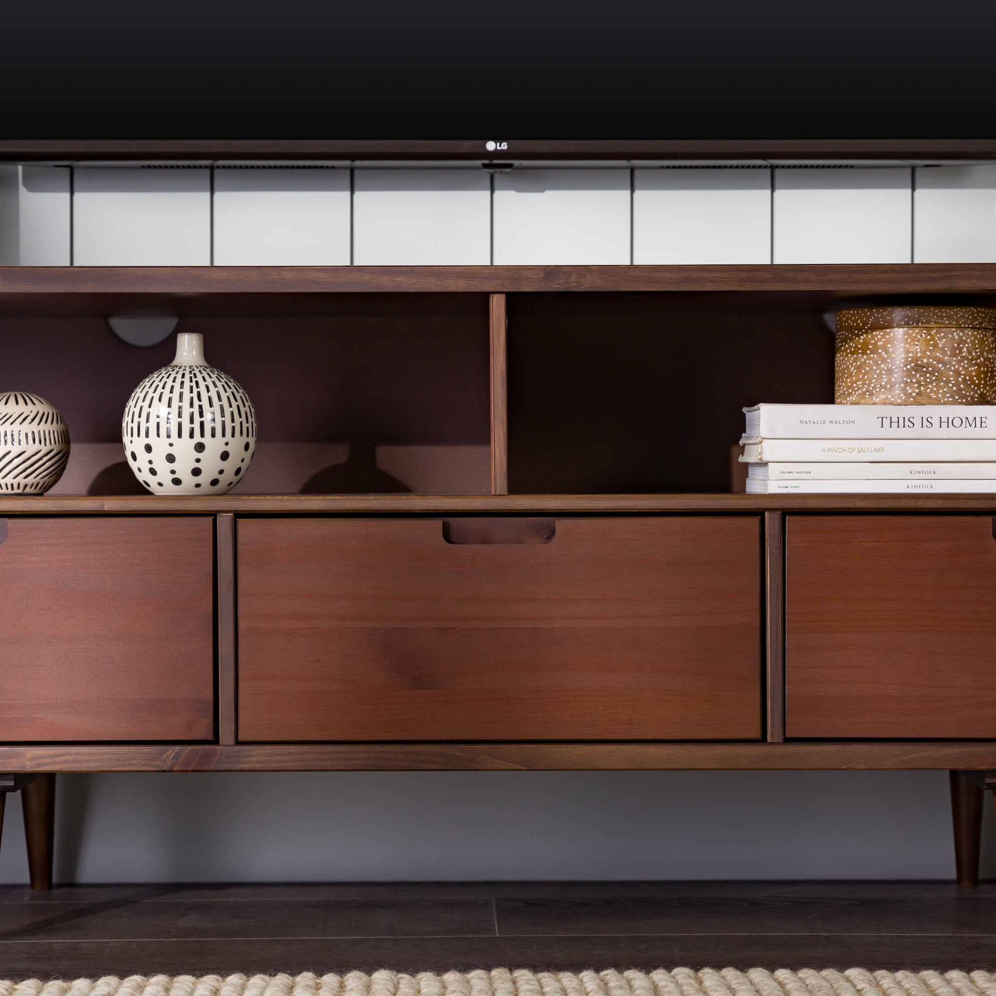 Packaged dimensions: 6″ H x 69″ L x 19″ W Assembled Dimensions: 6″ H x 68.75″ L x 18.5″ W Materials: Solid pine wood Assembly: Some assembly required Walnut finish Mid-century modern accent console 3 lower drawers with cutout handles 4 angled legs 2 open storage cubbies Cord management options Accommodates TVs up to 65”