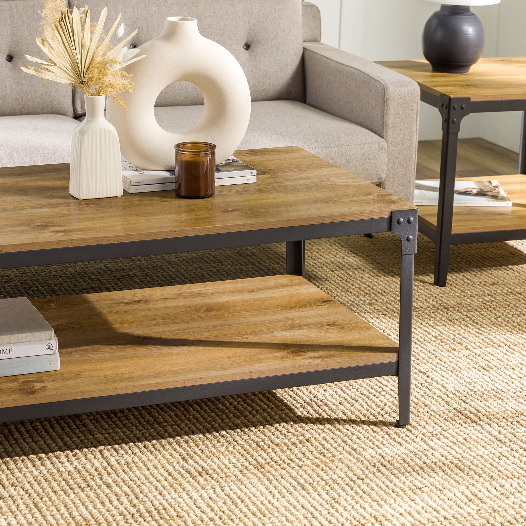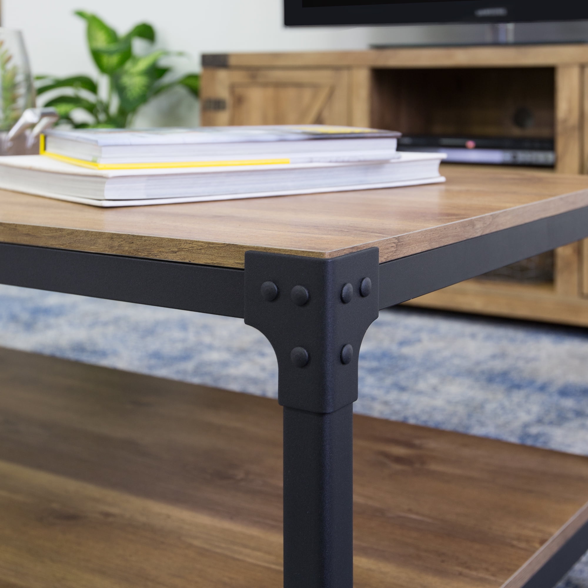 Lock in the central anchor of your living space by including the Wilson Riveted Coffee Table by Walker Edison in your home. This mixed material cocktail table has a wide surface that provides ample space to gather around. It also includes a wide, open shelf where you can easily store board games, smart speakers, or throw blankets that can add a cozy element to this otherwise industrial style rectangular accent table. The warp-resistant table top is framed by powder coated metal legs and riveted corner brackets. Complete this industrial accent table set by pairing this rustic style coffee table with its matching end tables.