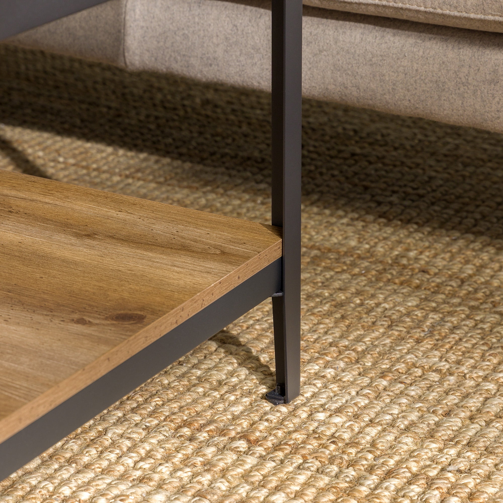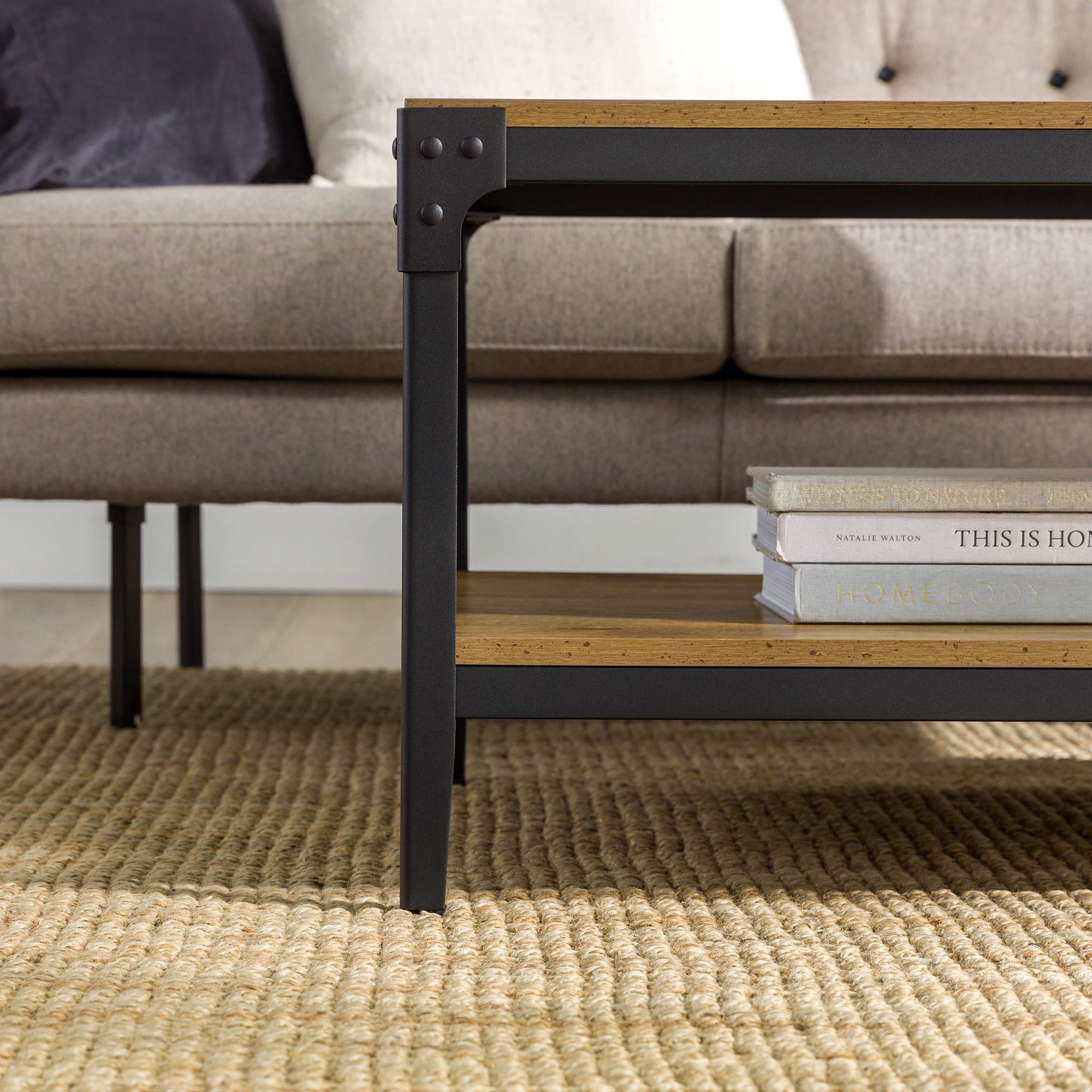 Riveted corner brackets Powder coated metal frame Low, open storage shelf Simple silhouette Industrial rectangle coffee table Rustic style accent table Mixed material cocktail table Assembled Dimensions: 18” H x 48” L x 24” W Packaged Dimensions: 6” H x 50” L x 27” W Assembly: Some assembly required Materials: High-grade MDF, premium laminate, powder coated metal Ships in 1 box