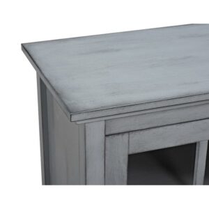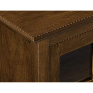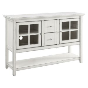 The Walker Edison Wood 52 in. Console Table Buffet TV Stand delivers modern function with the warm charm of traditional inspiration. This piece offers paneled glass doors and drawer faces with vintage-style pulls over a wide body with an open lower shelf. Each tempered glass door opens to reveal ample interior storage, with an adjustable shelf. These compartments also offer cord access ports at the rear, making them ideal for housing gaming consoles, cable boxes, or other components. Flanked by the glass doors is a pair of deep drawers that are perfect for storing media, remotes, or gaming controllers. This piece is crafted from a durable blend of hardwood, engineered wood, and wood veneers. Choose from available finish options to best suit your space.