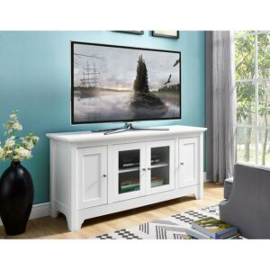 The Walker Edison Wood 52 in. Storage TV Media Console features elegant design, accented by fine detailing. The body of this cabinet is crafted with a durable engineered wood and solid hardwood blend. The front features four paneled doors that cover ample interior storage with adjustable shelves. The center doors have panels of tempered safety glass, making the space within ideal for storing entertainment items or decorative objects. Choose from available lacquered finish options to best suit your space.