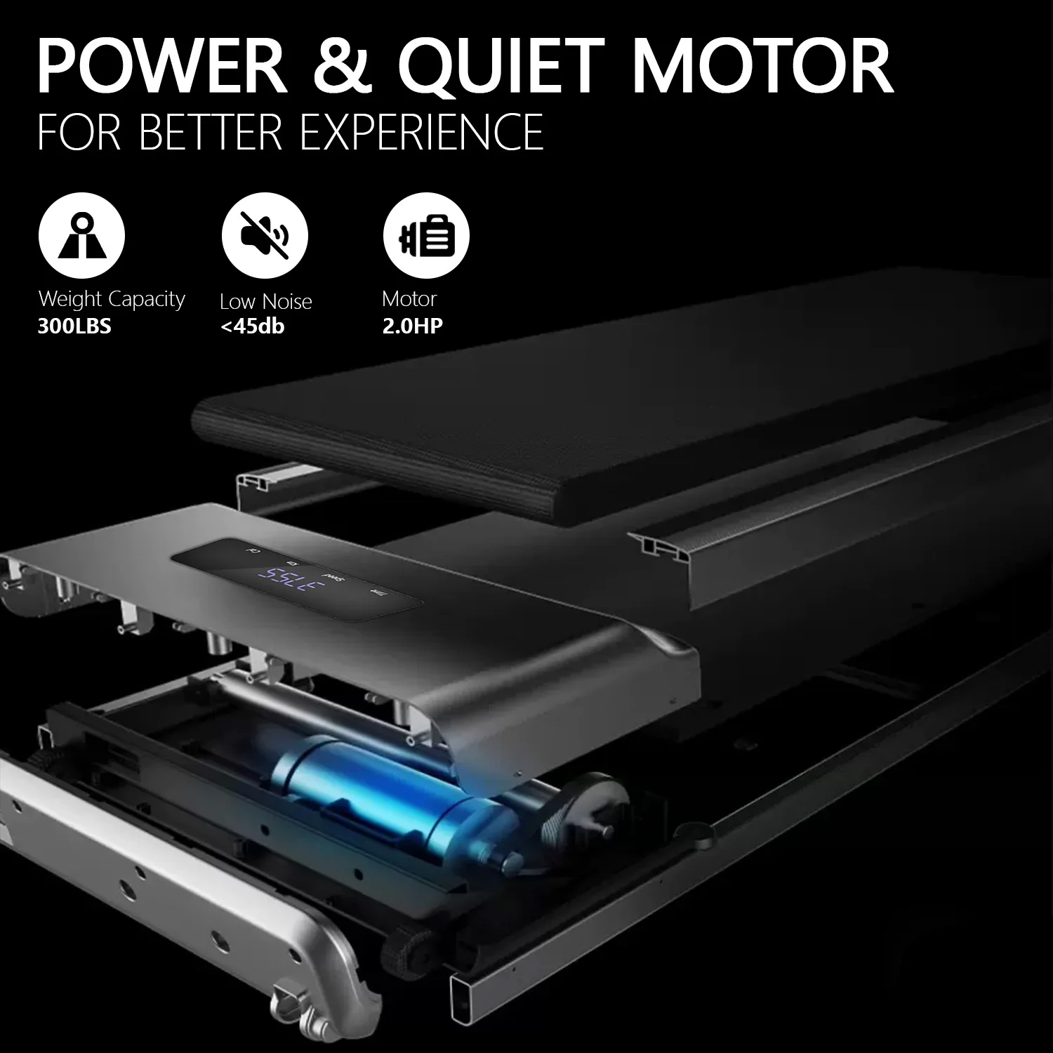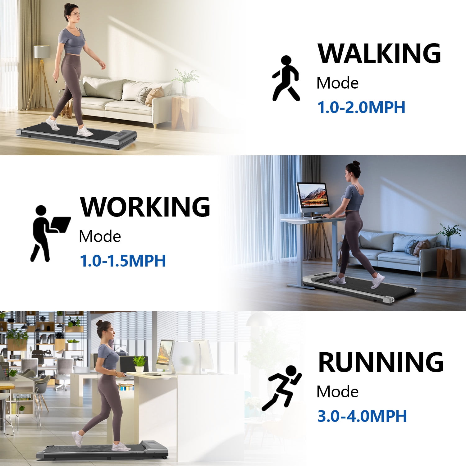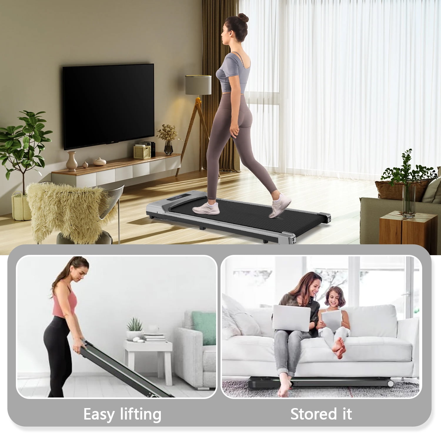 Powerful and Quiet Motor: Our under desk treadmill is equipped with a quiet motor, with a maximum load of 300lbs, quiet and comfortable for WFH. Easy to Use: The 41″×16″ running area gives you a more pleasant experience. You can easily read the important data on the LED display including Speed, Time, Distance, and Calories, to help you better grasp the exercise status. 2 in 1 Walking Pad: The speed range of the walking pad treadmill is 0.6-3.8mph (1-6km/h), it is not only for walking while you are working but also for jogging to strengthen your immune system when you are free Simple Design, Born for Home: This treadmill machine is only 45 lbs and and easy to move with wheels, it is slim in thickness and can be easily stored under the sofa or bed to save a lot of space.