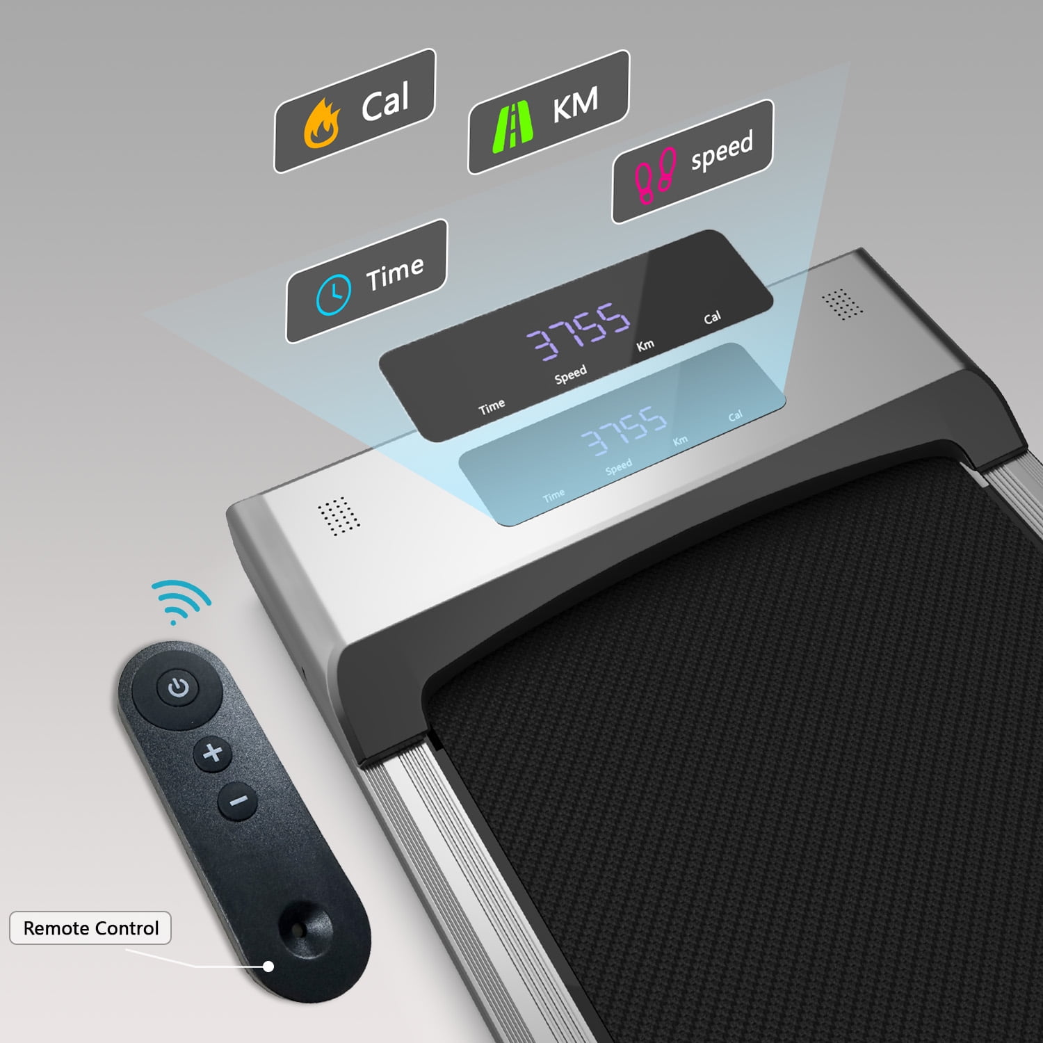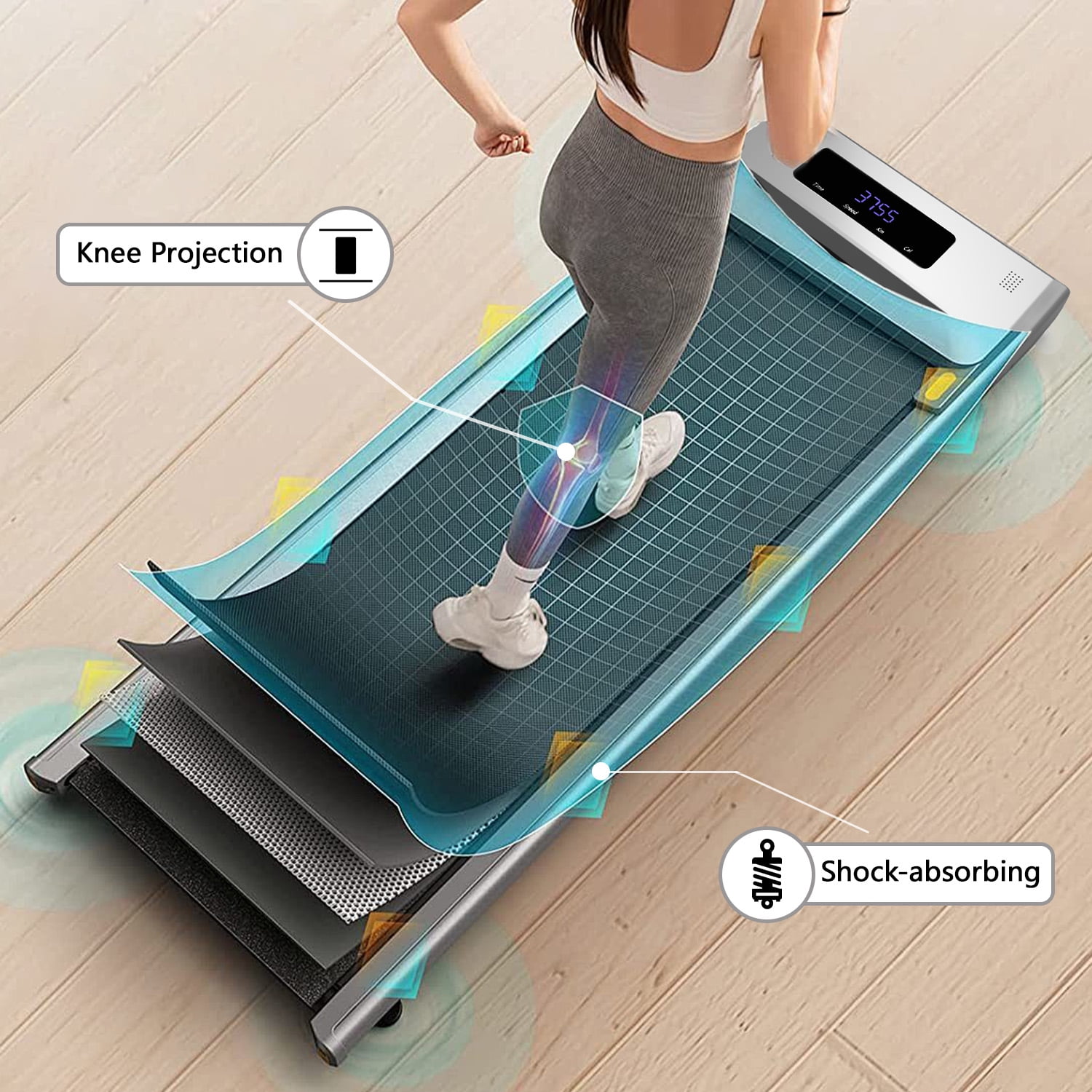 Shock Absorption: The walking treadmill provides a 41″×16″ large track for free movement, and is equipped with layers of anti-slip belt, silicone shock absorbers and soft rubber pads. It can not only provide you with a comfortable exercise experience, but also effectively reduce joint impact and protect your knees. Powerful And Silent Motor: The under desk treadmill is equipped with a powerful and silent motor. The powerful motor of this walking pad not only has a stable and high weight capacity, but also very quiet. You can exercise anywhere without worrying about yourself and others being disturbed. Portable Treadmill for Easy Movement: The walking pad treadmill is lightweight and has two front wheels for easy movement. Installation-free design, ready to use right out of the box. The design is compact and easy to carry, and you can place it at the bottom of your bed or under the sofa to save space. 0.6-3.8mph 2-In-1 Walking Jogging Machine: 0.6-3.8mph speed range, can be adjusted according to your needs. Not only for running, but also for use under your desk. Multi-Function Display: LED display clearly shows time, calories, steps, speed and distance, grasp your exercise status in real time, and make your exercise data clear at a glance