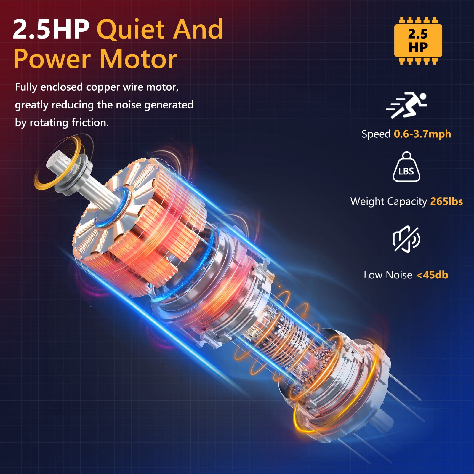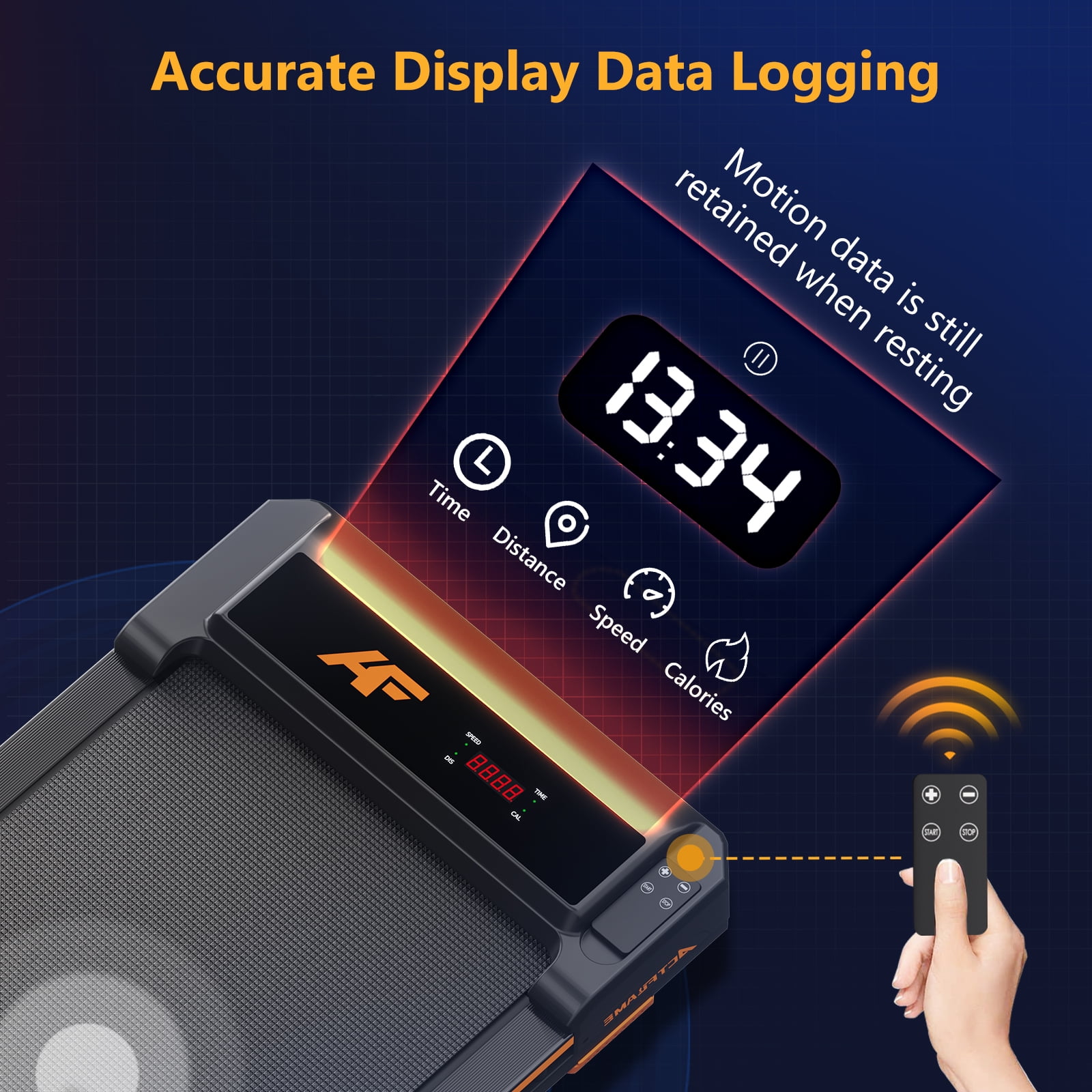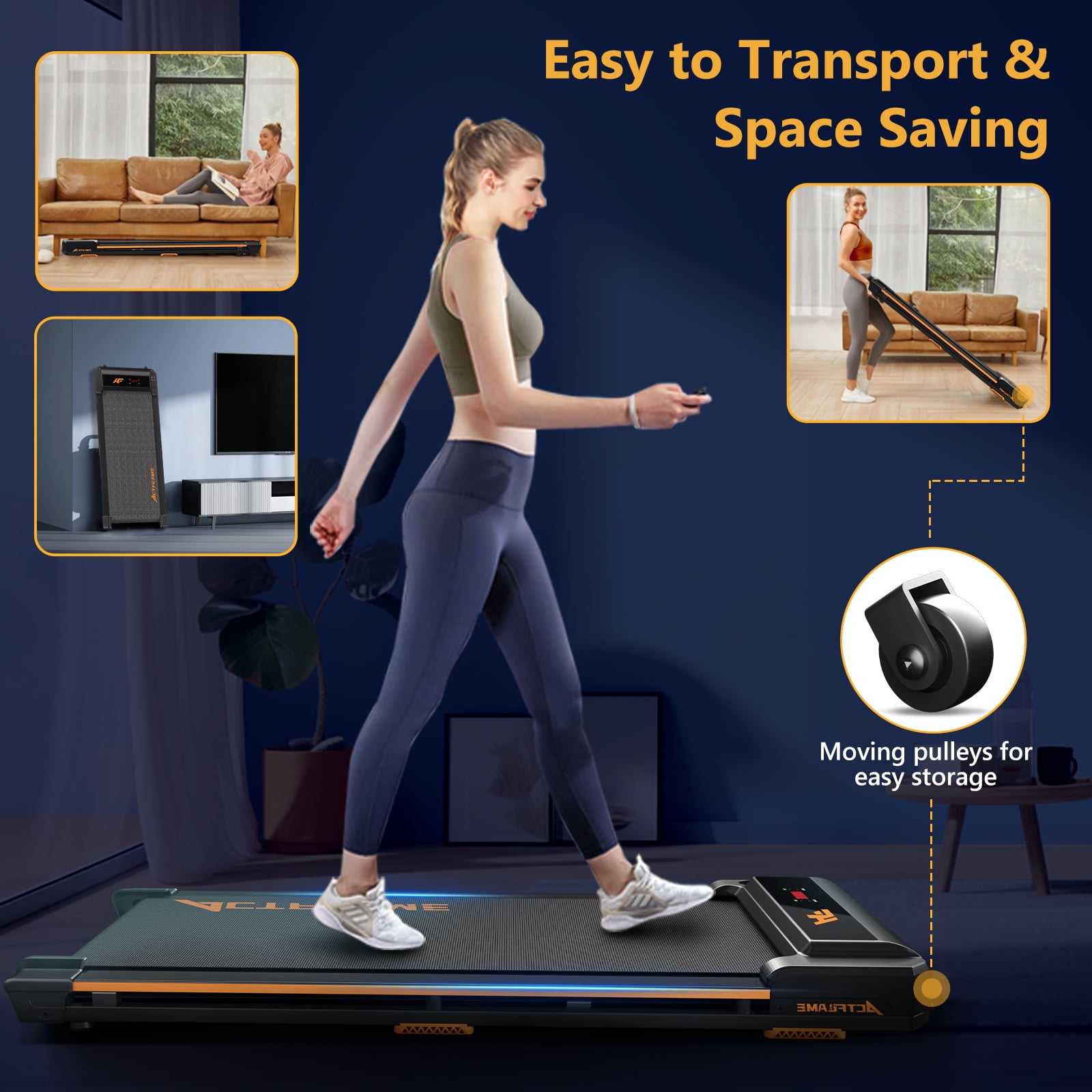 【Innovative 3-in-1 Folding Treadmill】The 3-in-1 Folding Treadmill allows for three modes of walking, running and work walking. Replacing the traditional treadmills and walking pad, it achieves 3-in-1 brand new experience. Freedom from exercise restrictions, allowing you to continue exercising in rainy days, hot summer days, winter and other inclement weather. Perfect for homes, flats, and offices. 【Simple Knob Design】 Folding Treadmill uses the same knob control as a car. It is easier and safer than the normal touch screen and buttons. The knob is pressed to start and stop with 1 key, and the acceleration and deceleration can be done by rotating left and right easily. When walking, the compact remote control can easily control the speed. Treadmill LED screen HD display, real-time tracking speed, distance, time and calories. 【NON SLIP RUNNING BELT & SHOCK REDUCTION SYSTEM】The rubber runner belt area is as large as 16.54”x39.78”,with the design of shock absorbing and non slip, making your running and walking much stable on this treadmill. 【Folding Treadmill】The treadmill requires no assembly and can be used directly after unpacking. 1-touch folding snap design instantly turns the 48.8″*26.4″*41.34″ treadmill into a 53.2″*26.4″*4.9″ walking pad.Full silicone wrapped mobility wheels make it easy to move the treadmill and the silicone design won’t hurt the floor. You can place it under your bed or sofa to save space. 【Powerful and Quiet Motor】 3-in-1 Under Table Folding Treadmill is equipped with a powerful 2.5HP motor with a weight capacity of up to 265lbs. Greatly ensures stable operation of the treadmill. The sturdy treadmill allows you to exercise at 0.6-7.6MPH speed with the armrests raised and is very quiet. You can work out anywhere without worrying about disturbing yourself or others. 【Ergonomic shock absorption design】Make your running or walking on the treadmill more free and safe.5-layer non-slip running belt and non-slip shock absorbing post support will greatly absorb the impact, provide effective and safe cushioning for your knees and muscles, get a superior running experience. Product Dimensions 49″D x 23″W x 5″H Item Weight 39 Pounds Material Alloy Steel Maximum Speed 3.8 Miles per Hour Special Feature Wheeled Target Audience Adult Assembly Required No Display Type LED Power Source Corded Electric Included Components Lubricant Product Benefits Weight Loss Support Maximum Weight Recommendation 265 Pounds Deck Length 44.7 Inches Input Power 240 Watts Minimum Speed 0.6 Miles per Hour Item Package Dimensions L x W x H 47.5 x 23 x 5.2 inches Package Weight 20.55 Kilograms Item Dimensions LxWxH 49.02 x 22.99 x 5 inches