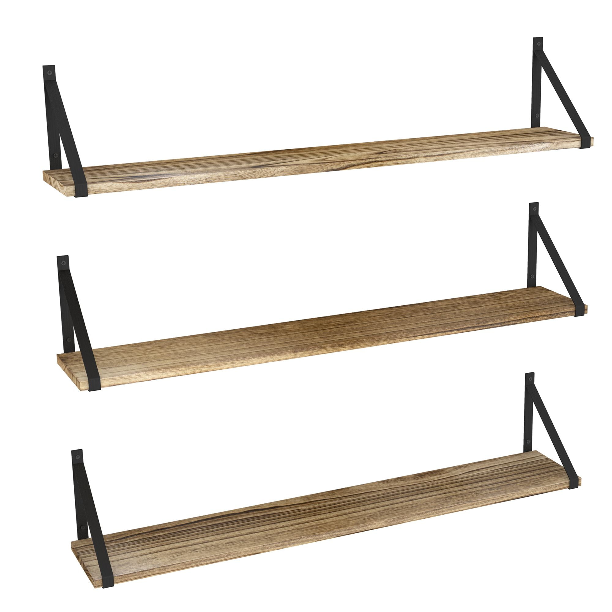 Wallniture Bora Wood Wall Storage Shelves for Living Room 36 inch Rustic Floating Shelf Hanging Bookscase, Natural Burned, Set of 3