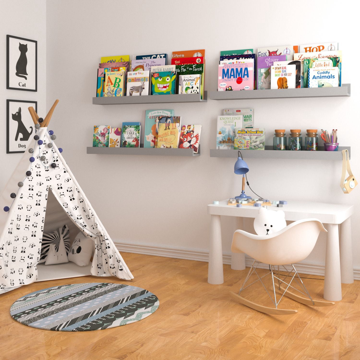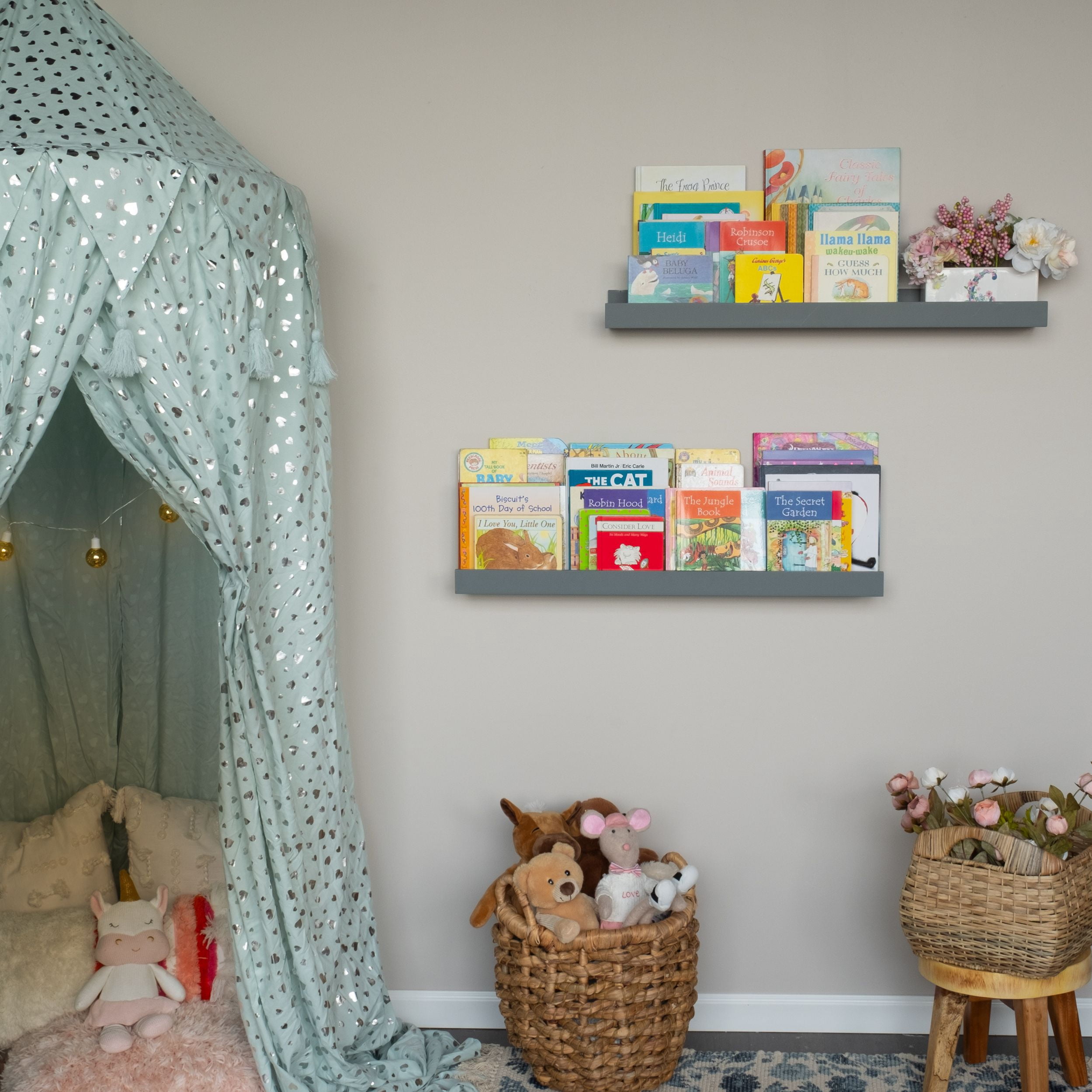 Add excitement and dynamic character to your kids room with Wallniture DENVER wood wall shelves for kids room: Perfect for storing child’s books and toddler toys! 34″ picture ledge shelves that are as practical as decorative will be a lifesaver. Clear clutter and give your child more space to use with our nursery bookcases. Consider using wide dark gray floating bookcases to create a cozy and entertaining room decor. Create smart organization and storage solution in kids bedroom. Take advantage of any unused space in your nursery room by mounting DENVER baby wall bookcase set. Each of these 5″ wide floating ledge shelves for nursery is an excellent option to create a stylish toy storage corner. Easily display Montessori toys, small plushies, action figures, puzzles, fairy tales, treasure, coloring books, arts and crafts supplies, Crayola, picture frames, baby toys, or collectibles. DENVER wall bookshelf for kids room has versatile usage to fit in every room by using them in different and practical ways. Get creative and consider using 34” wall mount display shelf dark gray set to create a unique gallery wall in your living room. You can also utilize set of 2 modern decor shelves as spice rack for that little wall space between the cupboard and countertop.