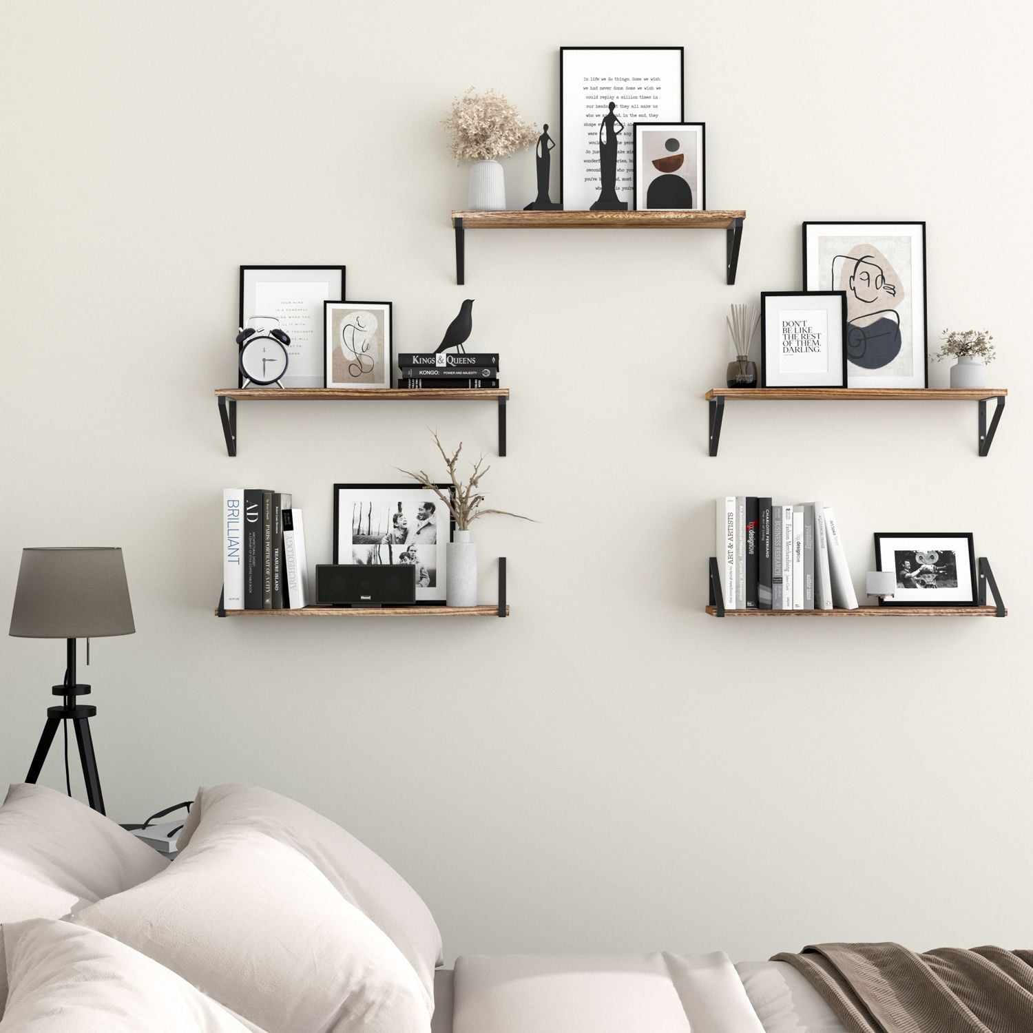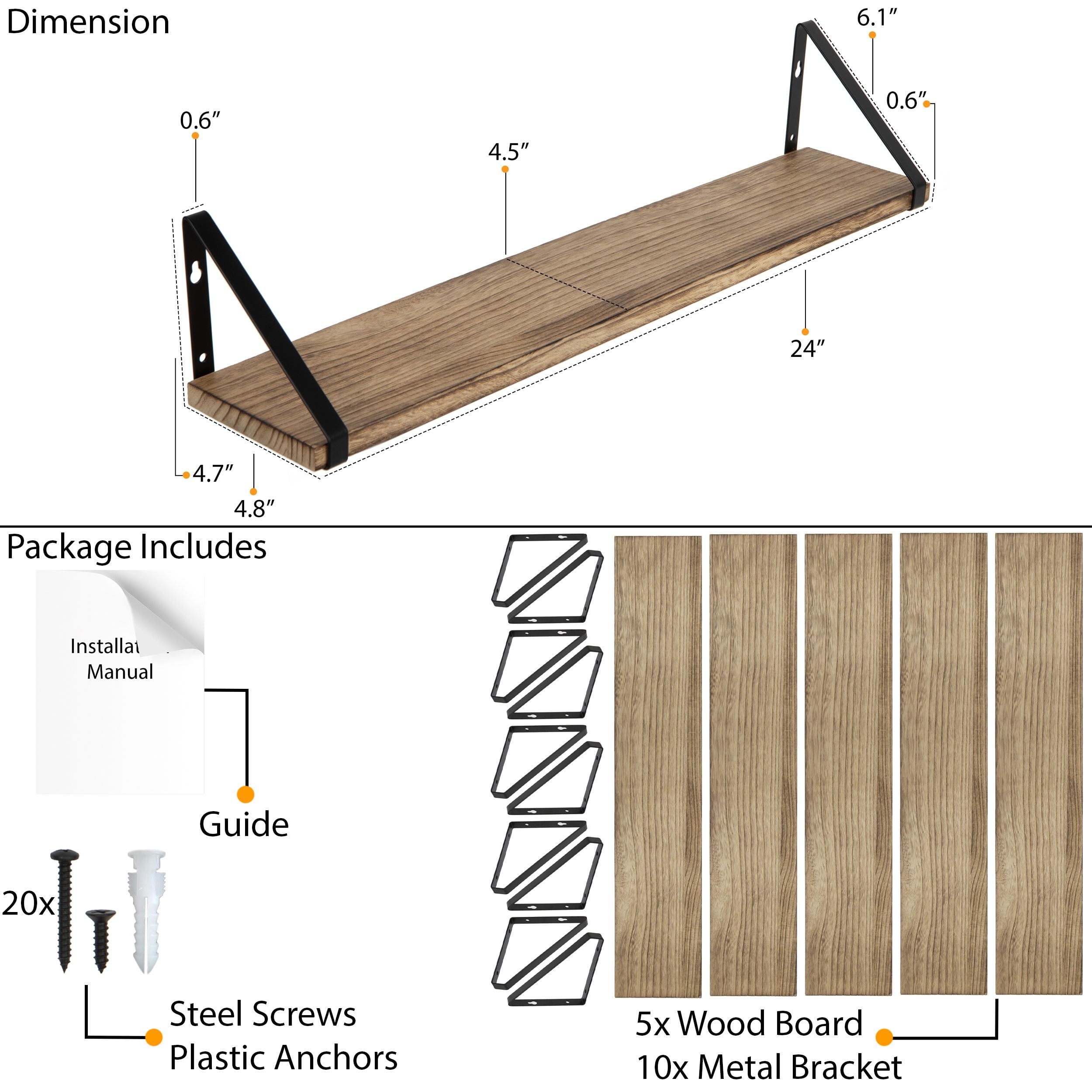 Set of 5, Wallniture PONZA Wood Shelf for Wall with Brackets, 24″ x 4.5″, Natural Burned Made of durable Paulownia wood and elegant metal brackets, holds up to 40 lb Have an additional storage space while having a great match to your rustic home decor Flexible usage with its neat, symmetrical, and perfectly proportioned design approach Natural burned wall shelves for storage are ideal for any house decor Install multi-purpose 24″ wood wall shelves in the kitchen, bathroom, bedroom, and living room Keep your kitchen cabinet and pantry storage tidy and neat Mount kitchen storage shelves next to the countertop and revamp your kitchen organization Display kitchen gadgets, organize coffee mug, spices and seasonings set, or storage containers Keep the wood cutting board, cookbook, and kitchen appliances in check Store coffee pods and tea set, mason jars, snacks, serving bowls, soy sauce, or olive oil Bathroom storage shelf set fits right above the sink and provides a cozy retreat for toiletries Neatly store toilet paper, toothpaste, curling iron, spray bottles, makeup kit, and hand towels Perfect for bedroom set to install wall hanging shelves on the side of your bed frame Keep bedtime books, daily planner, reading glasses, phone, and morning essentials accessible Great for storing books, or displaying favorite collectibles, photo frames, and artificial plants Wall rustic kitchen shelf set is an elegant gift for birthdays, housewarmings, holidays, or any occasion Wooden wall shelf for bathroom includes all necessary hardware and instruction manual Specifications Material: Paulownia Wood Board and Stainless Steel Bracket Color: Natural Burned Board | Black Brackets Dimensions Assembled Wall Shelf Dimensions: 24″ x H 4.7″ x D 4.8″ Weight Capacity: 40 lbs What is in the Package? 5x 24″ Wood Board 10x Metal Bracket Steel Screws Plastic Anchors Installation Manual Each Wallniture wall mount wood shelves with metal brackets are designed to meet your needs and expectations. Ensure that once you buy our product, you will use it with life satisfaction. But if you encounter any problems, we will be here to assist you!