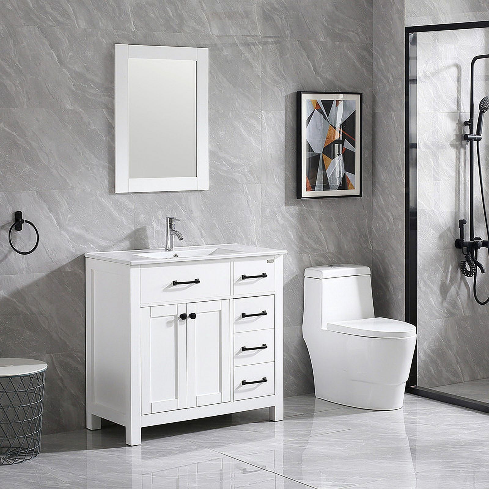 Space Saver, Perfect for Small Bathrooms This modern bathroom set needs to install and you can get it done easily following the installation instruction. As the professional vanity manufacturer, we pay more attention to product details, such as stainless steel buffer hinges, storage space, and structure. We hope you are happy with our product everyday. Its luxury design will surely brighten your bathroom and add value to your property. Product Features 🛀Durable and sturdy Structure The Multi-Layer Boards is designed to not only withstand threats of moisture and humidity but also easy to clean and maintain. This ensures your high quality of life. 🚿Superior Stainless Steel Rail International well-known brand DTC rail is durable and qualified for several thousand times fatigue tests.Stylish handles make the cabinet more modern and beautiful. 🛀Ample Storage Space Soft-closing doors and one drawers offers an extra big space for storage and make the room clean and tidy.Different kinds of items are stored in different 5 drawers and you could find what you need within seconds. 🚿Modern Sink and Mirror The ceramic vessel sink offer long lasting use. Smooth surface is easy to clean and remove stain. The mirror uses a high-definition mirror for clear imaging. 🛀Easy to Assemble This Small bathroom vanity with sink set comes with all necessary mounting hardware and detailed installation instructions for quick and easy installation. 🚿Care And Maintenance To ensure the longevity of your vanity, wipe it regularly with a dry soft cloth and avoid using cleaners that may damage the surface. Handle fragile sinks with care and avoid placing hot appliances directly on the countertop. Avoid overexposure to sunlight or excessive changes in temperature and humidity. 🛀Note Assembly needed. Shipped with 2 separate boxes.Please be patient and wait for all packages to arrive. Feel free to contact us whenever you encounter any problem and we will give you a reply within 24 hours. Specifications Color:White Cabinet: 35.4″L x 17.7″W x 31.5”H Mirror Size: 21.6″L x 29.5″H . Sink Size: 36.2″L x 18.1″W x 6.6”H. Material:Engineered Wood,Stainless Steel,ceramic Number of Doors: 2 Number of Drawers: 5 Finish : Painted Package Included cabinet Mirror Countertop with ceramic sink Chrome Faucet Chrome Pop-Up Drain Other Hardware