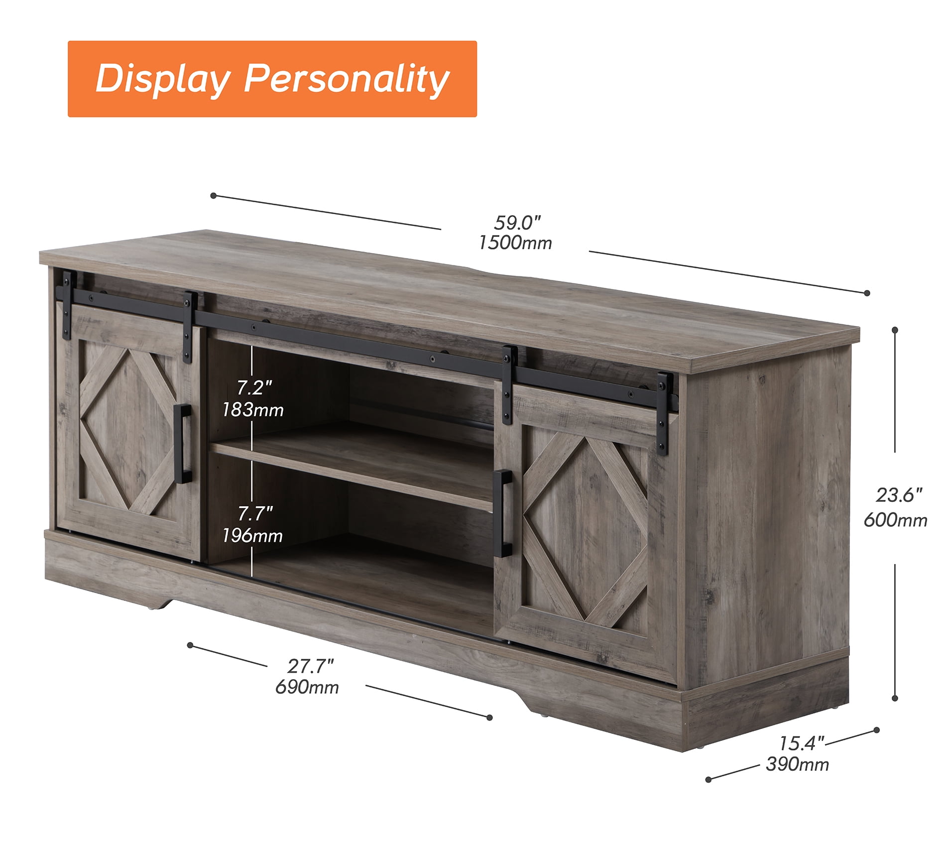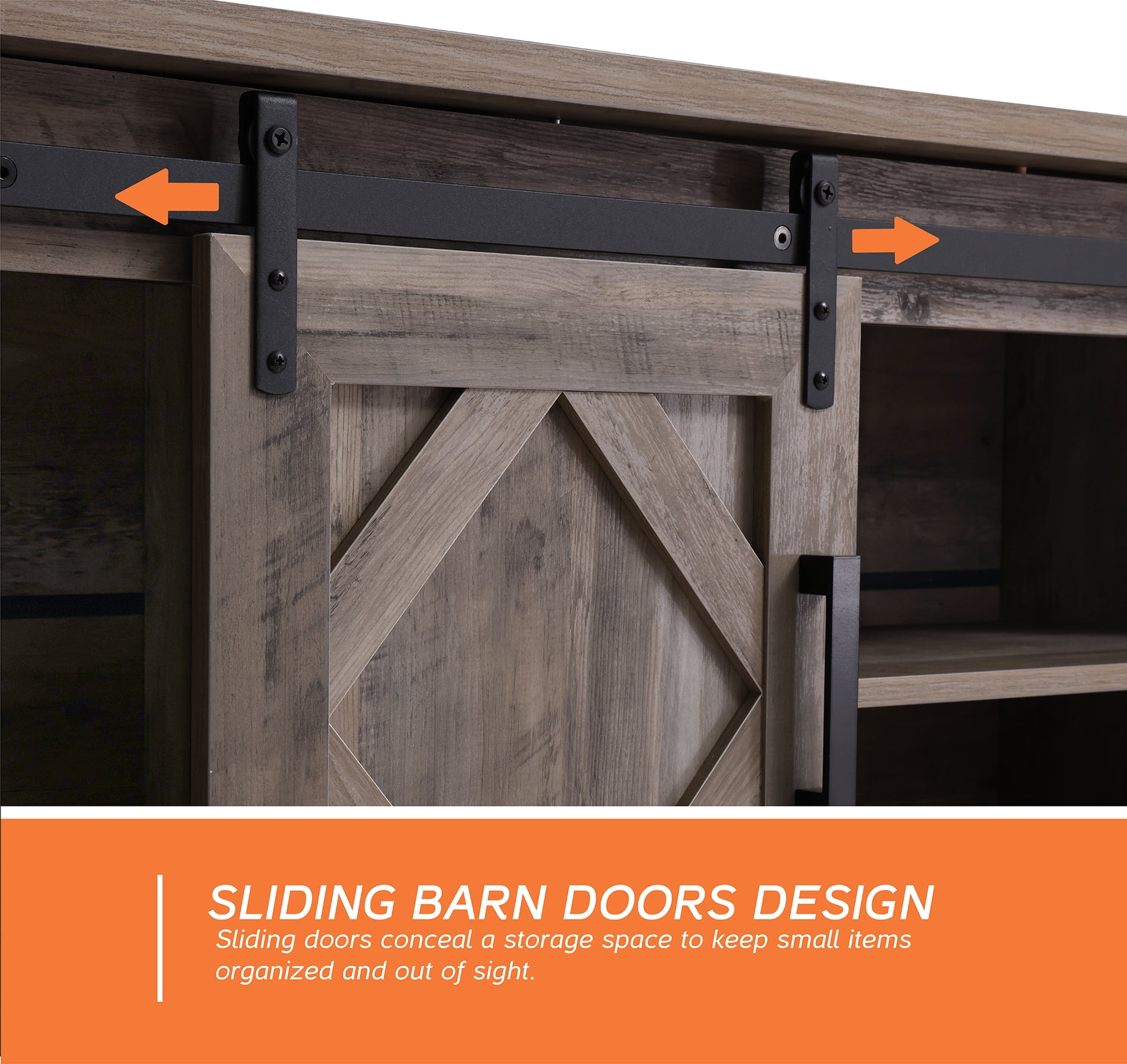 [Multifunctional Storage & Adjustable Shelf] This TV Console Table with adjustable shelves can provide large storage capacity space. [Sturdy and Durable] Made from high-grade certified MDF for long-lasting construction. [Cable Management System] Open and closed storage with cord management. The TV Stands have cable holes designed at the top for hiding unsightly wires. Cable management features to run cords in the back of the TV stand. [Classical Design with Sliding Barn Doors] The TV stand provides abundant storage with two cabinets and one adjustable shelf in the middle. [Easy to Assemble] A clear instruction is included, which has straightforward illustrations and descriptions.