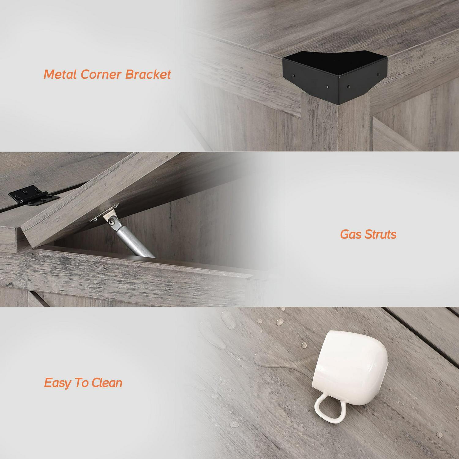 – CLAMSHELL DESKTOP Unlike other coffee tables, this storage coffee table adopts a clamshell design, the top board can be turned 90 degrees freely, and the use of gas struts to cushion the drop, to ensure safety and strengthen the protection of the table.