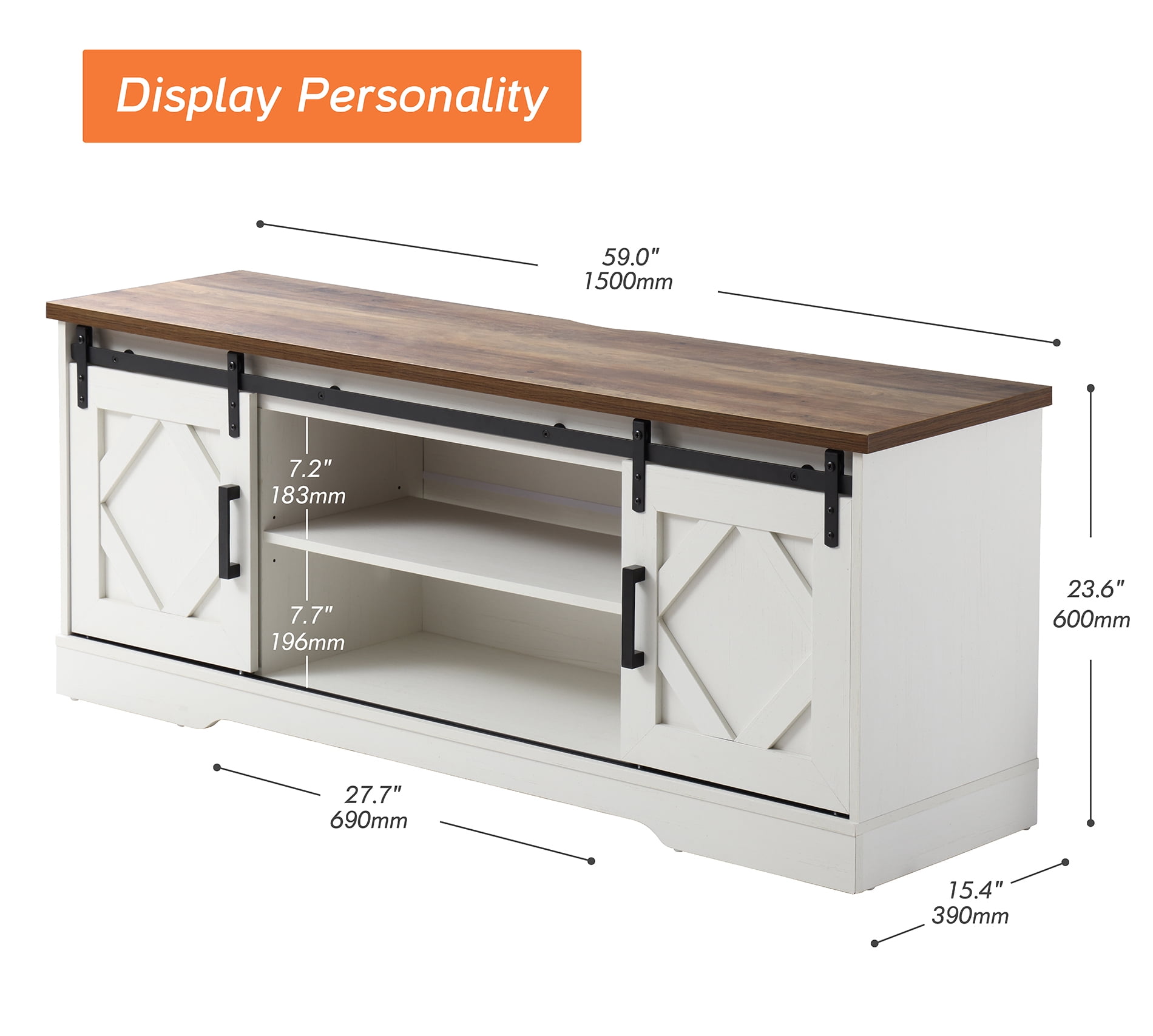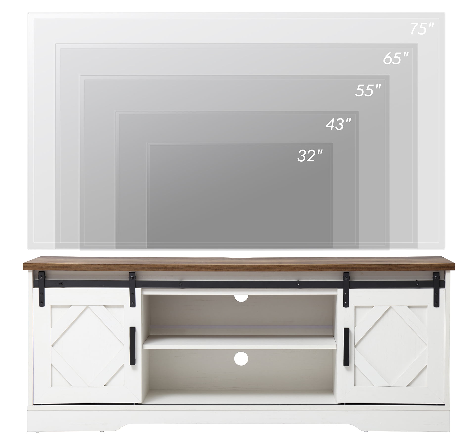 [Sturdy and Durable] Made from high-grade certified MDF for long-lasting construction. [Multifunctional Storage & Adjustable Shelf] This TV Console Table with an adjustable shelf can provide large storage capacity space. [Cable Management System] Open and closed storage with cord management. The TV Stands have cable holes designed at the top for hiding unsightly wires. Cable management features to run cords in the back of the TV stand. [Classical Design with Sliding Barn Doors] The TV stand provides abundant storage with two cabinets and one adjustable shelf in the middle. [Easy to Assemble] A clear instruction is included, which has straightforward illustrations and descriptions.