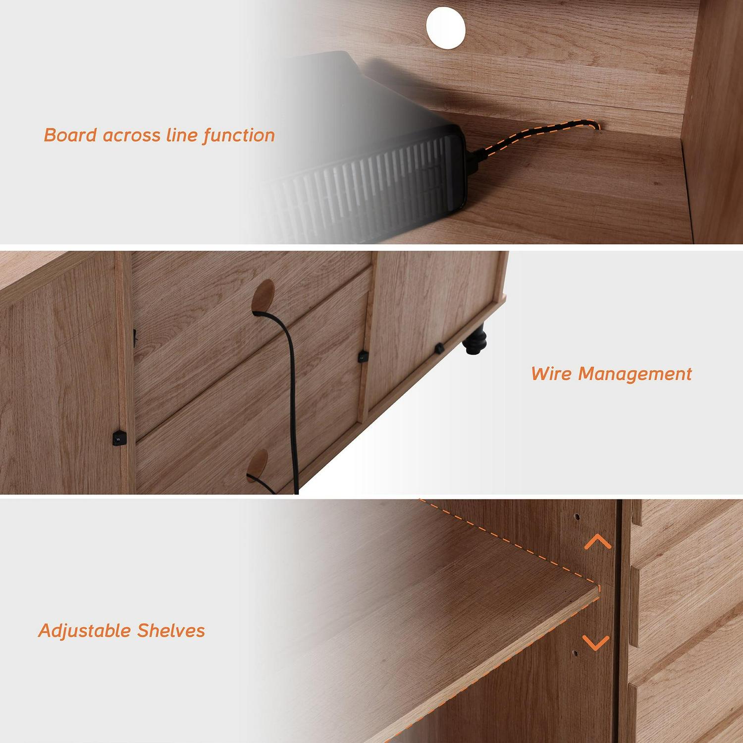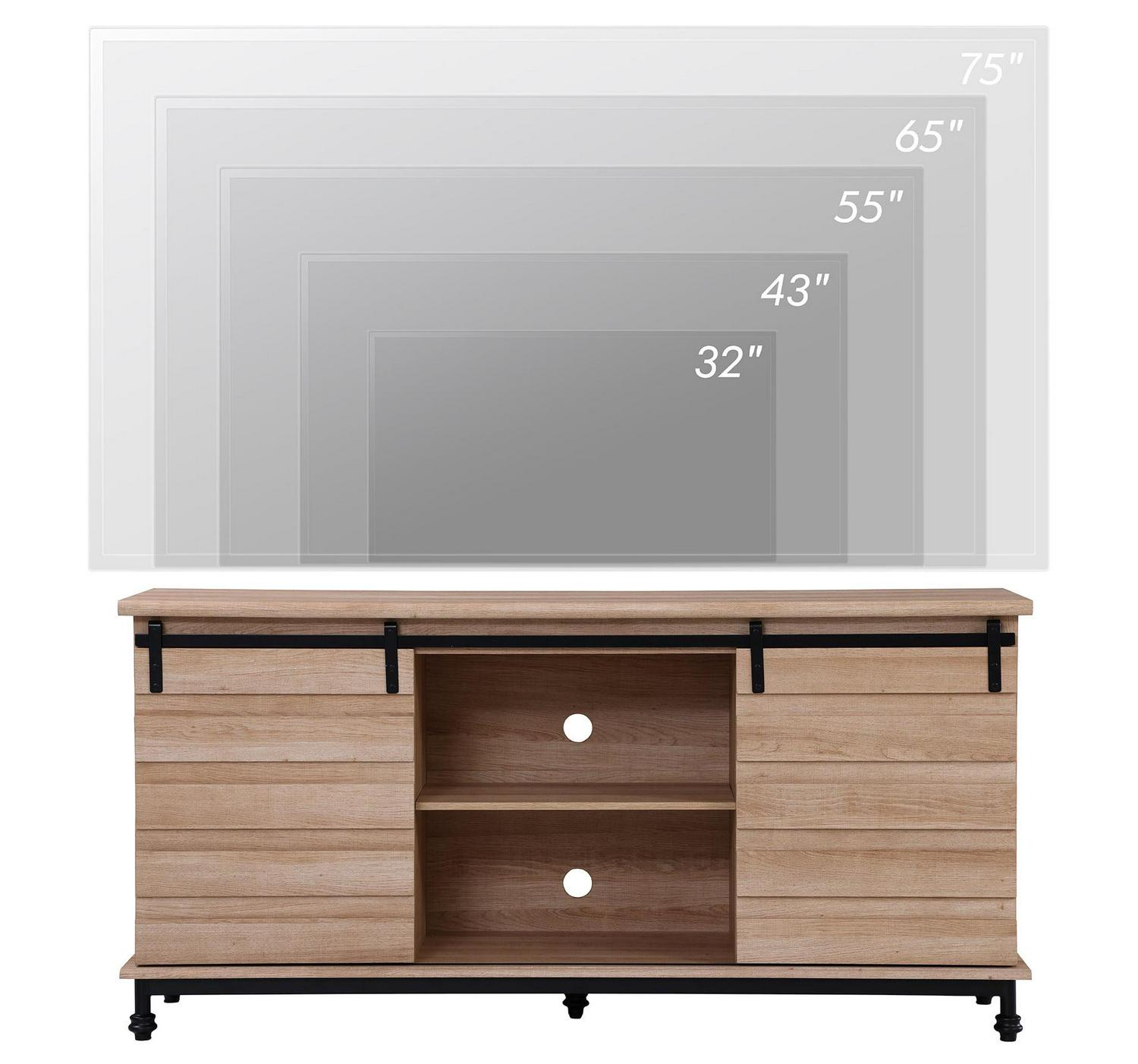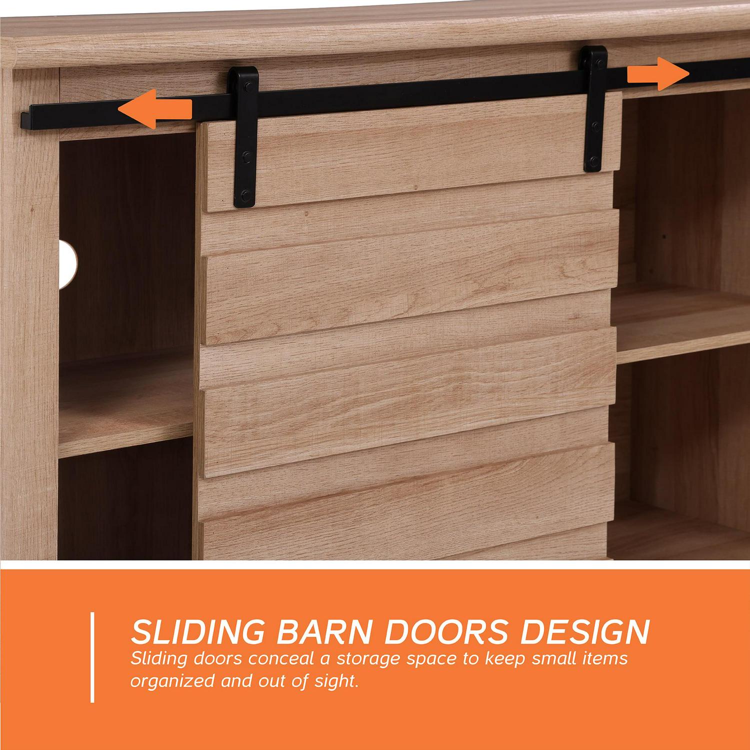– [Sliding Barn Doors And Cable Holes Design]: This TV cabinet has two sliding barn door designs to conceal side storage cabinets or center storage shelves, 2 adjustable shelves behind the doors, 2 open compartments, and a large shelf under the tabletop to keep all your games and a media player in one place.