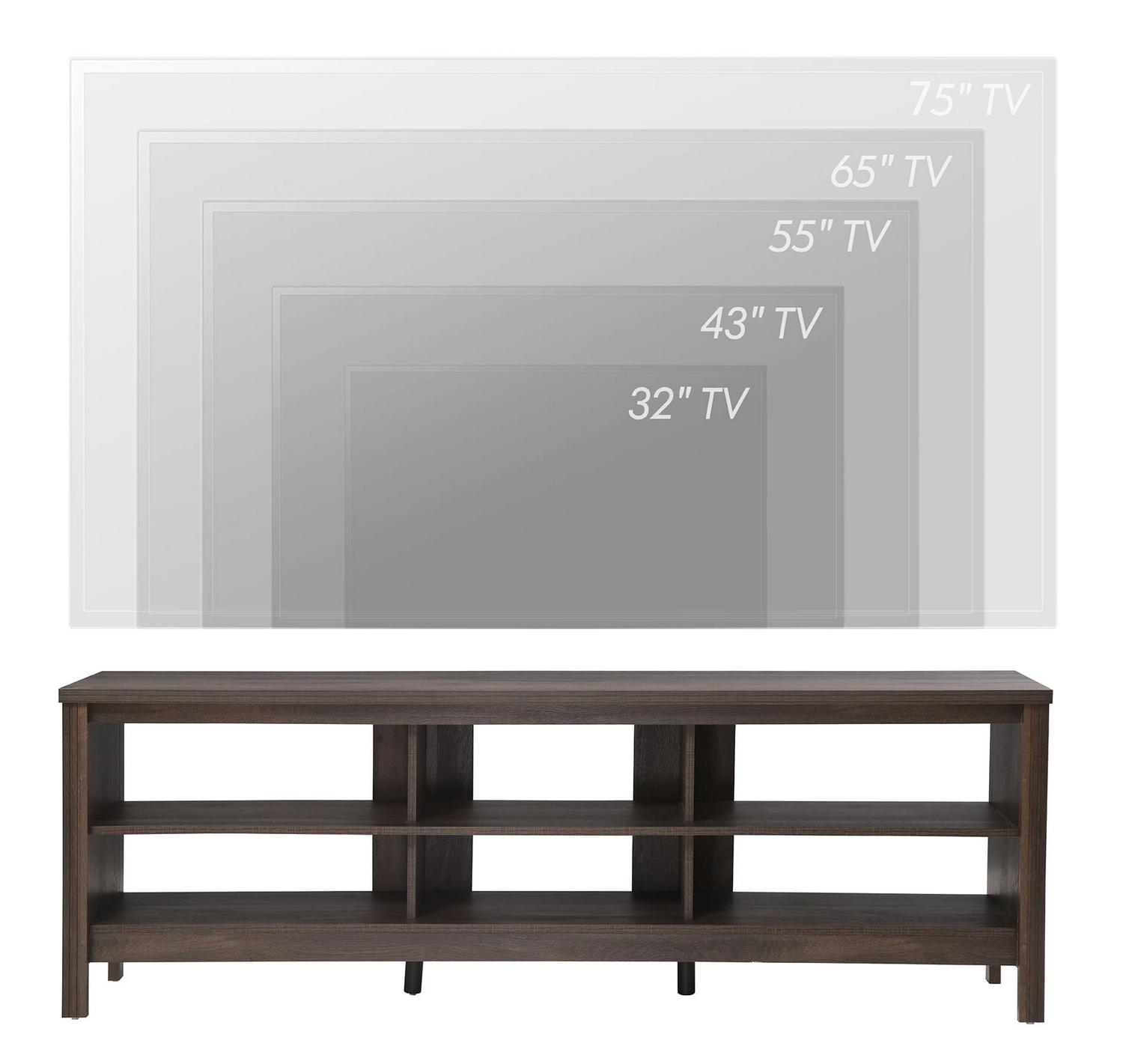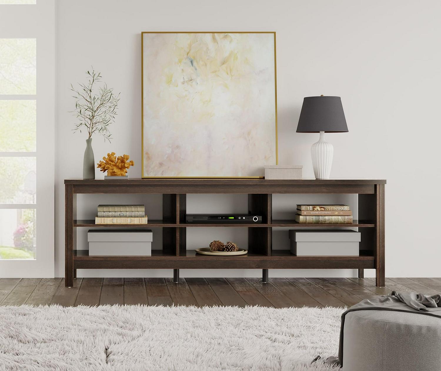 The espresso wood grain and simple lines on this tv stand make it look classic and elegant. It can be not only used as televison stands, also perfect for sofa table, entertainment center, media stand, storage console table, tv console etc. This TV stand is perfect for TVs up to 75 inch TV.6 open shelves with big capacity allow you to storage the books, magazines, CDs and any other media or gaming devices. The media console table made of high quality MDF which is durable and sturdy enough to be used for a long time. Plus, four wooden legs further enhance stability, preventing the TV stand from wobbling. Max load capacity: 260 lbs. The espresso entertainmen center for 75 inch tv with smooth surface is waterproof and easy to keep clean with a damp cloth. The tv table is 3.9 in high height off the ground which adequate for robot vacuum cleaner can passing freely. No more headaches from dust under the cabinet.
