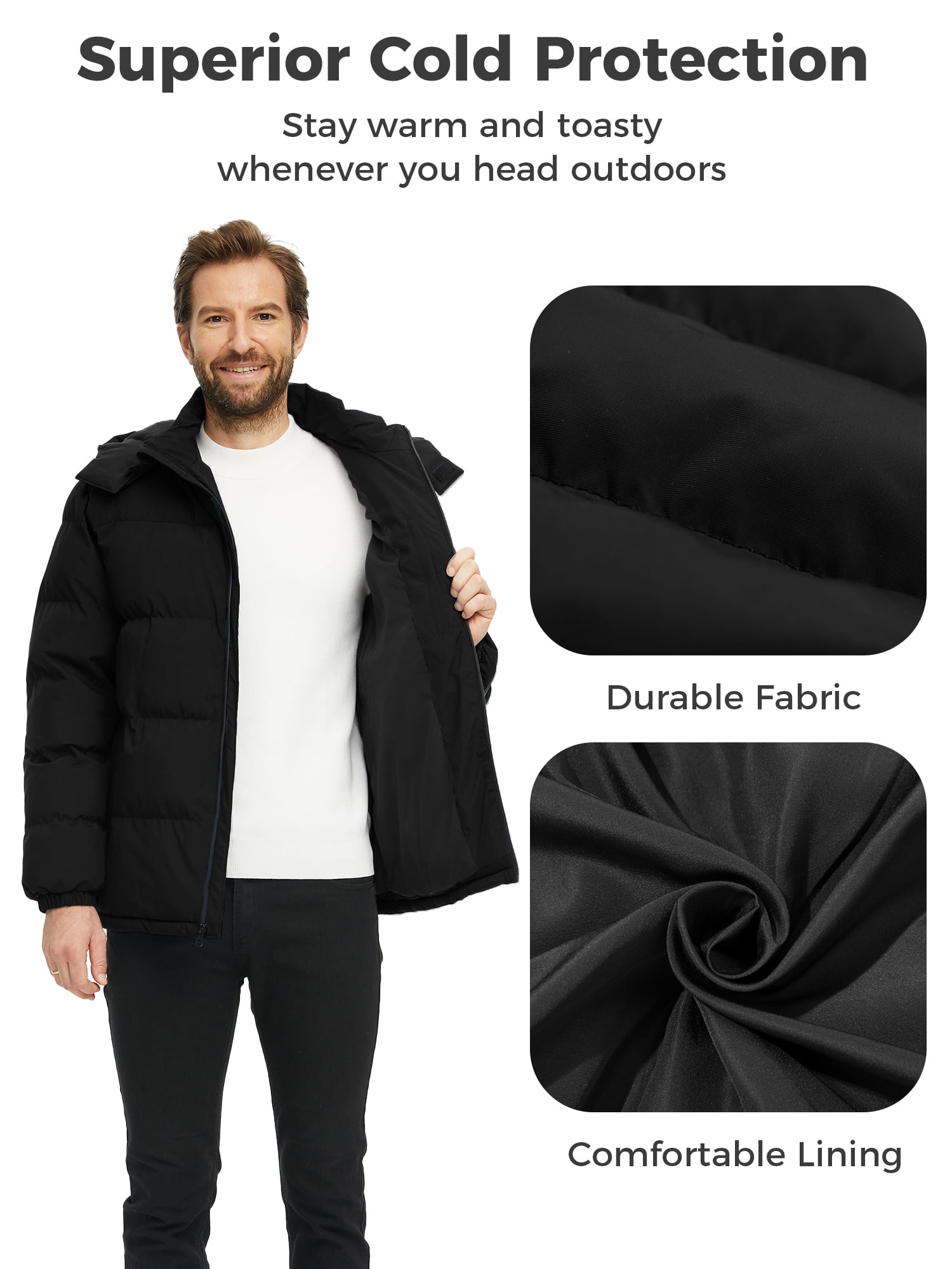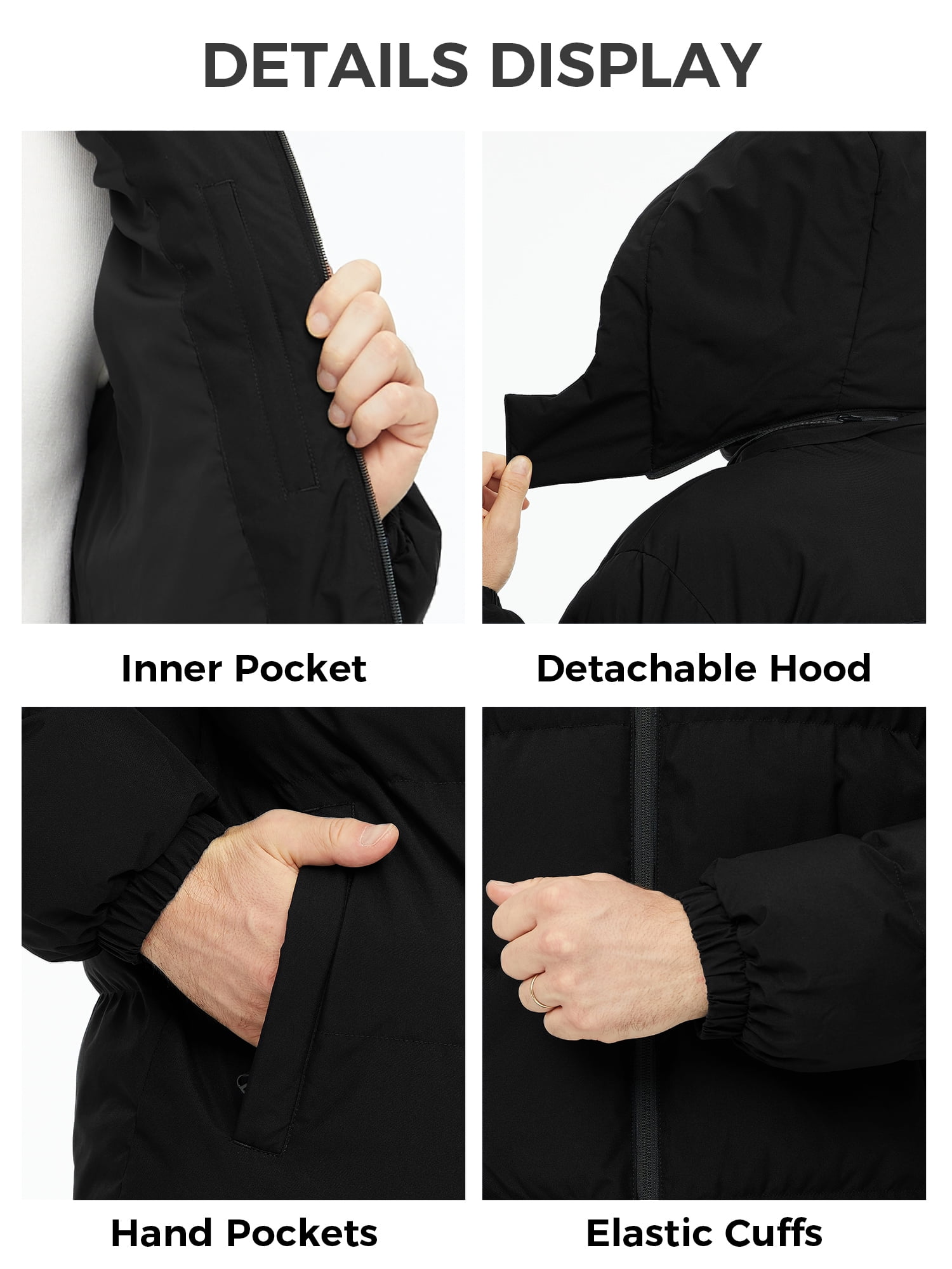 Product Features Gender: Male Color: Black; Dark Gray; Navy; White Size: S/M/L/XL/2XL Shell: Recycled Fabric Hood Type: Removable hood Pockets: 2 snap pockets and 1 inner pocket Recycled Raw Materials: Indulge in luxury and sustainability with our men’s recycled winter coat, meticulously crafted from renewable materials. Experience exceptional warmth and durability, surpassing expectations. The soft interior lining of this padded winter jacket guarantees unparalleled comfort, elevating every wear into a lavish experience. Waterproof: Crafted from recycled fabric with a robust waterproof rating of 5000mm, our men’s water-resistant winter coat ensures durability and reliable protection against wind, rain, and snow. Embrace the outdoors even on foggy, rainy, or snowy days. Stay warm and dry in damp or cold weather with our waterproof bubble jacket for men. Windproof Design: (1) The adjustable windproof hood of men’s winter windbreaker jacket is a highly functional and versatile design that effectively keeps out wind and provides coverage for the head and neck. (2) The full-zip front zipper closure and snap-placket of this men’ windproof coat work together to provide further insulation by keeping the cold breeze out and trapping heat inside the men’s jacket. (3) The ribbed elastic cuffs on the men’s winter puffer jacket are a utility design feature that help keep the cold out. Functional Pockets: The durable and functional pockets of the men’s bomber coat cater to your diverse daily storage requirements. This warm puffer jacket for men features multiple pockets, comprising two hand pockets and one inner pocket, offering ample space for your personal belongings while on the go. Additionally, the hand pockets of this men’s jacket serve as convenient hand warmers when you need to ward off the chill. Stylish Choice: Men’s short puffer jackets offer a plethora of fashion benefits. This winter coat for men effortlessly pairs with various clothing items, creating diverse and stylish looks. Ideal for activities, this men’s warm outerwear enhances mobility, making it perfect for outdoor adventures or situations requiring increased leg movement. Available in various sizes and colors, this men’s jacket effortlessly complements ensembles, adding style and versatility when paired with sweaters or scarves. Versatile: Whether you’re heading out for a casual weekend brunch, meeting friends for a leisurely stroll in the park, or attending a laid-back outdoor gathering, this men’s winter jacket is the perfect choice. Their lightweight and comfortable design make the men’s bubble coat ideal for layering over a t-shirt or sweater, providing just the right amount of warmth without feeling bulky. Additionally, this jacket for men make excellent gifts for holidays or special occasions, offering both style and practicality to the recipient’s wardrobe.
