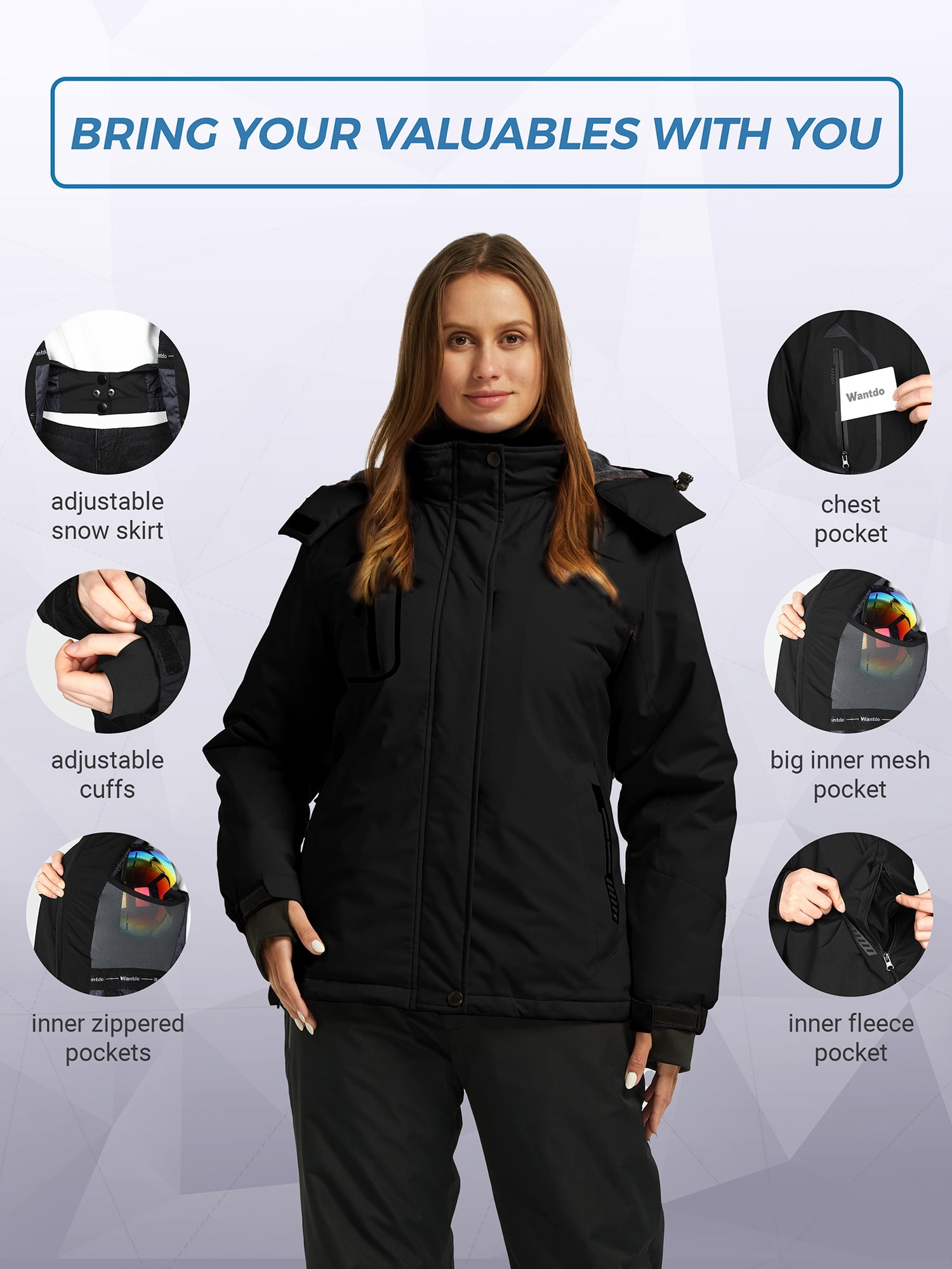 ✅Protects from Water- Choose a ski jacket for women designed to withstand rainy, snowy, and foggy weather. With a waterproof index of 10,000mm, this winter coat will keep you completely dry. This waterproof jacket for women jacket also features a PU membrane that doesn’t let water drops in so you don’t end up soaking underneath. ✅Impervious to Wind- Explore the outdoors while keeping cold wind out. The snowboarding jacket features a detachable hood, windproof cuffs, and adjustable internal windproof snow skirt that let you stay warm and comfortable.This windproof jacket for women keeps you covered from ice cold gusts of wind. ✅Stay Warm and Cozy- For exceptional thermal insulation, this snow jacket uses 240 grams of durable fiber and 240 grams of high quality filling. It is coated, padded, and quick to dry. The skiing jacket also features with soft and skin-friendly fleece lining which provides an additional element to keep you warm during the cold and chilly winter. ✅Multiple Pockets for Essentials- It’s every woman’s dream come true: finding a winter jacket with real, functioning pockets. Designed with convenience in mind, this mountain jacket for women has 5 spacious pockets You can carry your wallet, phone, and keys securely with this rain coat in your outdoor adventures. ✅Reliable Outerwear- Stay protected no matter where your adventures take you. Wear this hooded fleece jacket while skiing, snowboarding, hiking, traveling, or going out into the snow or rain. This durable and functional waterproof rain jacket comes in multiple standard sizes and colors for a custom fit. A Wantdo Ski Jacket for The Beautiful Ski Season- When you’re dealing with rough sports or tough weather conditions, it’s important for you to invest in the right clothes for safety. Donning the perfect winter gear will not only protect your skin from coming into contact with snow, but it also helps you enjoy your outdoor activities even more. This Wantdo snow coat for women is perfect for snowboarding, down hill or cross-country skiing. Detachable Hood- The user’s comfort and the Wantdo jacket’s effectiveness are the driving forces behind this Wantdo ski jacket’s creation.The fleece lined detachable hood effectively prevents gusts of cold winds and keeps your face and neck warm. The hood of the Wantdo snow coat also can be removed for those not-so-cold winter days. Adjustable Hem- The adjustable hem effectively prevents gusts of cold winds from penetrating through the rain jacket and traps the heat generated by your body inside the jacket to help you stay warm. This Wantdo fleece puffer jacket also provides you range of motion to allow you move as you please. Adjustable Snow Skirt- This Wantdo hooded fleece jacket for women features with unique design of the snow skirt can effectively prevents gusts of cold winds from penetrating through the mountain jacket. The gripper elastic on the bottom of the rain coat makes a snug barrier around your waist securing a custom fitted enclosure. Elastic Cuffs- This Wantdo women’s hiking jacket is tailored with elastic cuffs and stretchable thumb hole to seal off any openings where air and snow may come into the sleeves. This unique design also traps the body heat generated by your body inside the zipper-up jacket and allows for more freedom of movement while preventing the sleeves from sliding up.
