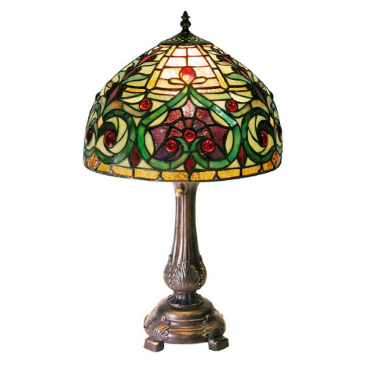 With its rich color and exceptional details, the Tiffany-Style Jeweled PetiteTable Lamp is the perfect way to dress up a smaller space. Its shade features an off-white background with an intricate contrasting design in brilliant shades of green, yellow, red, and amber. The shade is also accented with red jewels for added vibrance and texture. Crafted from methods introduced by famed stained glass artist Louis Comfort Tiffany, the shade is constructed from over 150 individually cut, quality stained glass pieces, each of which has been edged in copper foil and carefully hand-soldered.