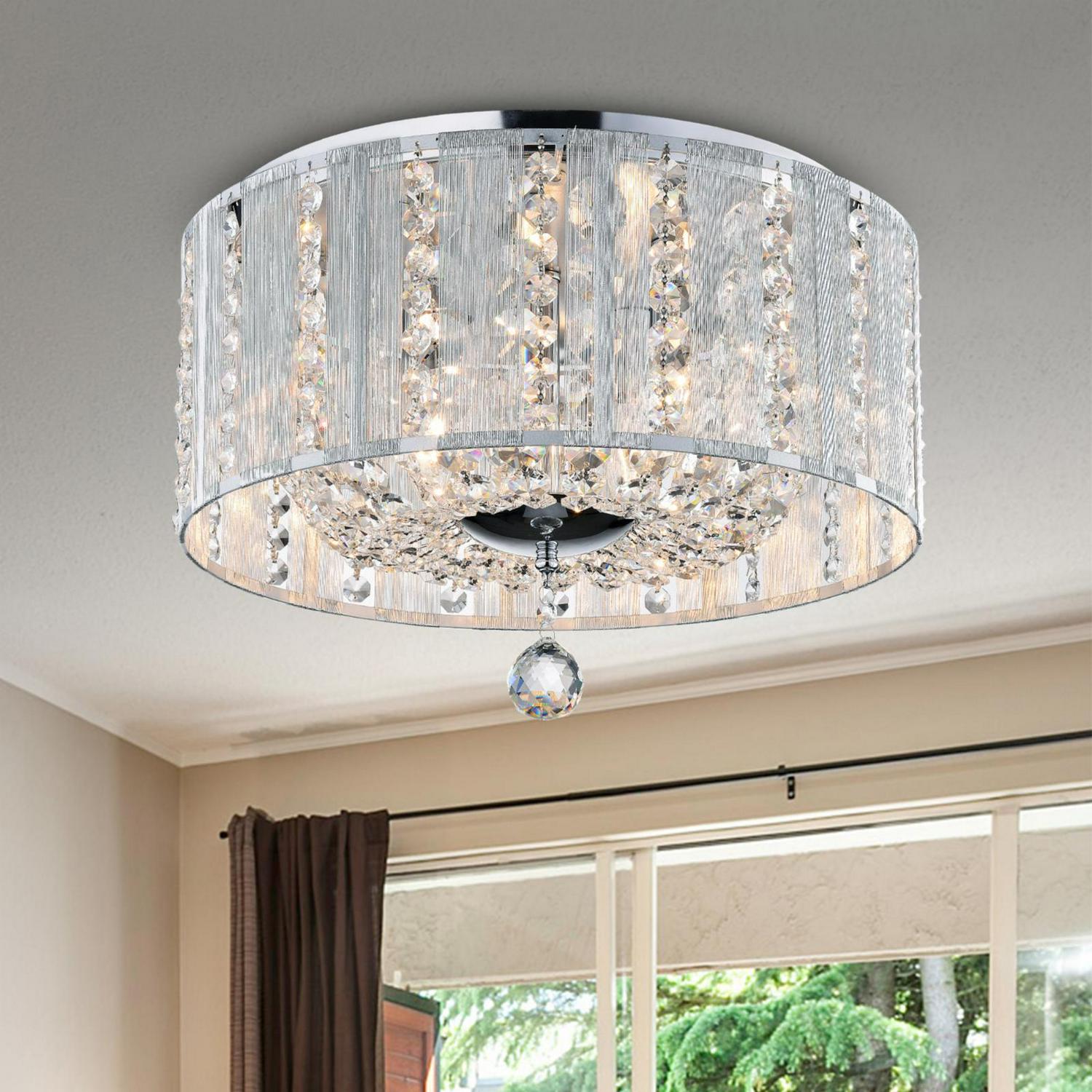The crystal clear drum shade on this Warehouse of Tiffany Addison Crystal Flush Mount Ceiling Light shimmers with faceted crystal strands and drops. This glamorous ceiling light requires four 60-watt incandescent bulbs (not included).
