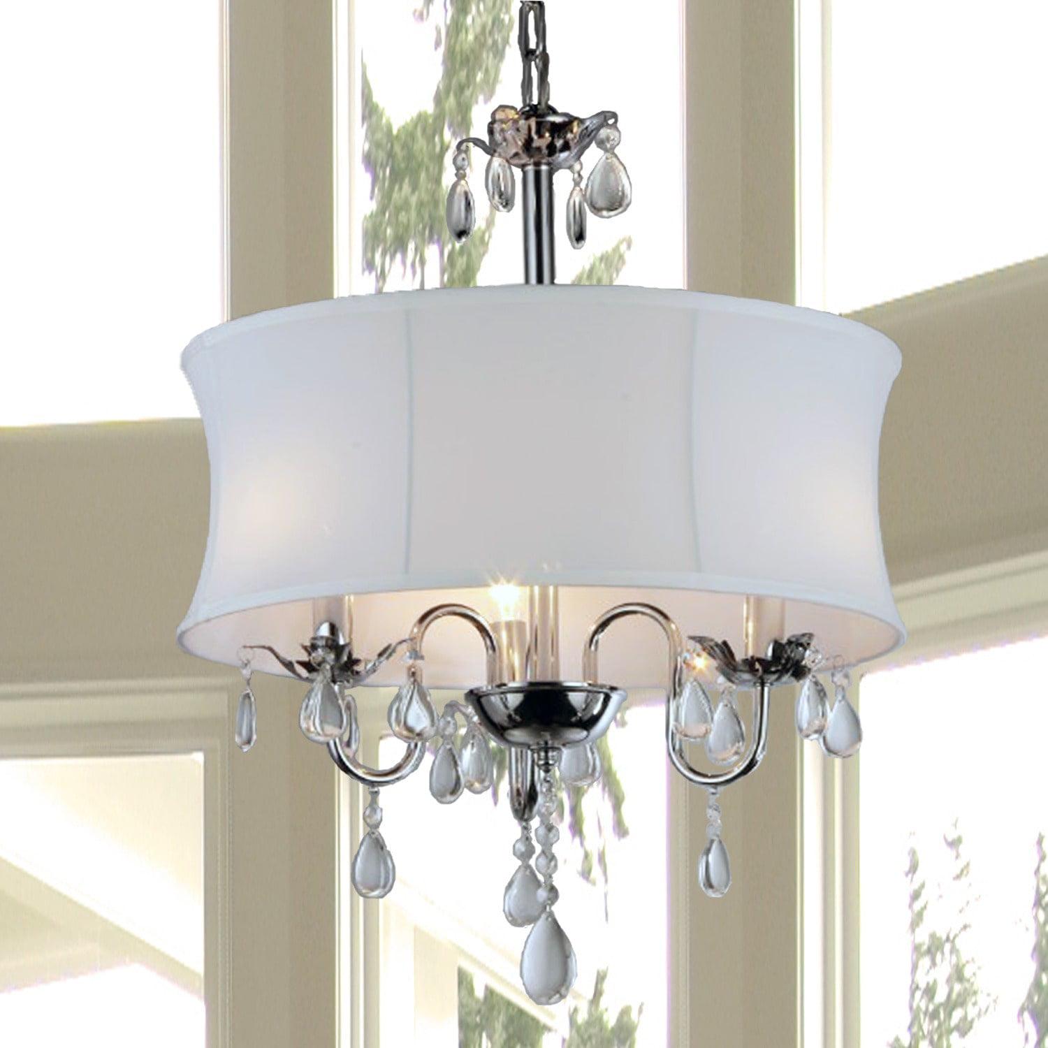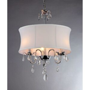 The Warehouse of Tiffany RL3207 Elegant Crystal Chandelier features a classic, shapely fabric drum shade with a modern twist. Tear-drop crystals and curvy polished chrome arms add glamour to this chandelier. Bulbs not included.