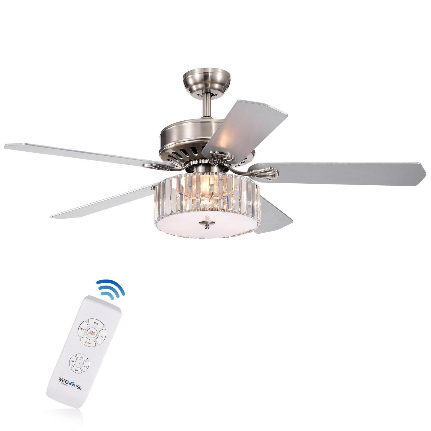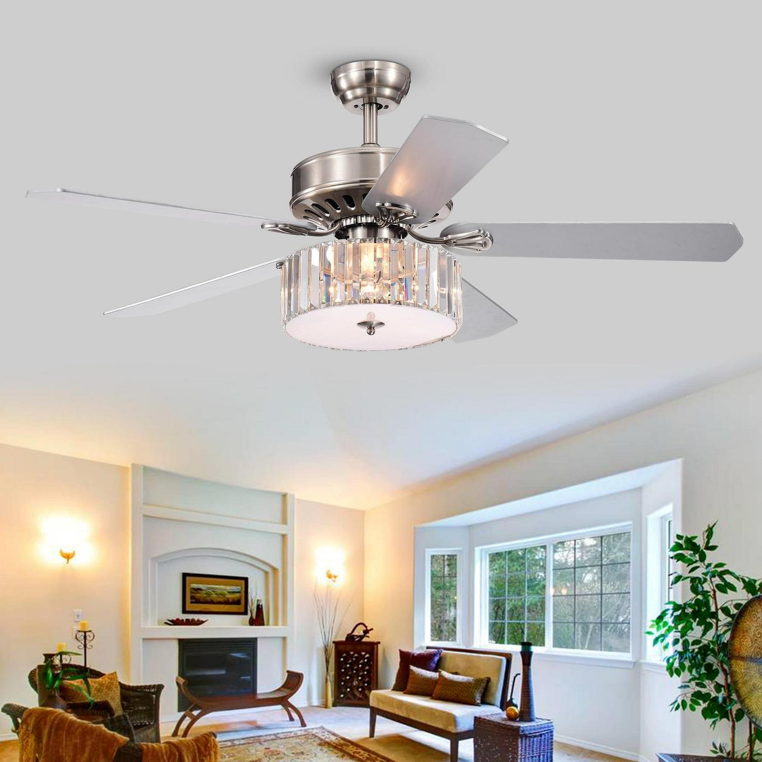Give your living room a touch of glam with this stunning ceiling fan. The bright three-bulb light has a sparkling crystal shade for an upscale look, and the sleek nickel finish adds a contemporary touch. With five wood blades and a sturdy metal frame, this fan is as durable as it is stylish. Choose from a classic pull chain or convenient remote for easy control.