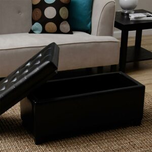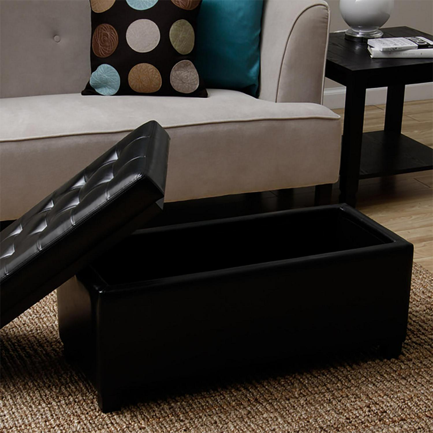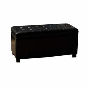 The deeply button-tufted Warehouse of Tiffany Malm Storage Bench comes in a range of supple faux leather upholstery colors. This storage bench has a smaller scale, so it’s ideal for your apartment, loft space, or bedroom. The top is cushioned, making it a comfy seat, handy cocktail table, and ottoman, too. The top is also a flip lid that opens to reveal plenty of storage space for games, blankets, and more.
