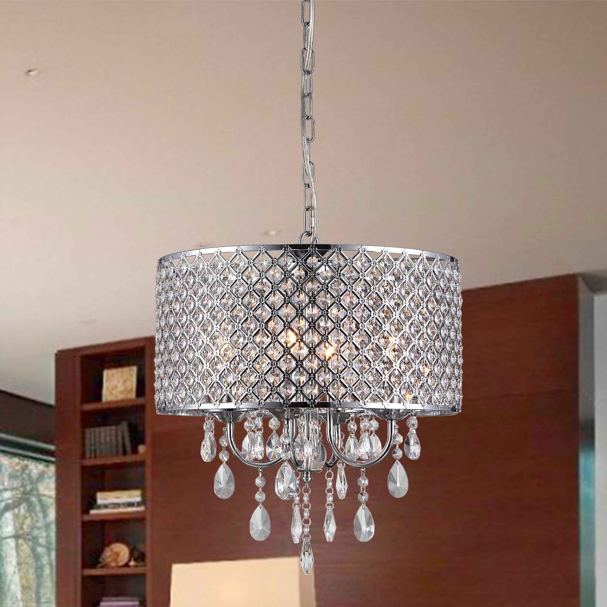 Dimensions: 17 diam. x 37H in. Unique round and crystal style chandelier Made of iron and crystal Hanging crystal chandelier surrounded by a chrome drum shade Open grid drum allows for maximum light exposure Includes 20 in. of chain and 30 in. of wire Requires four 60-watt incandescent bulbs (not included)