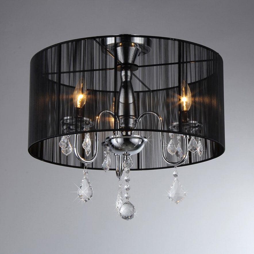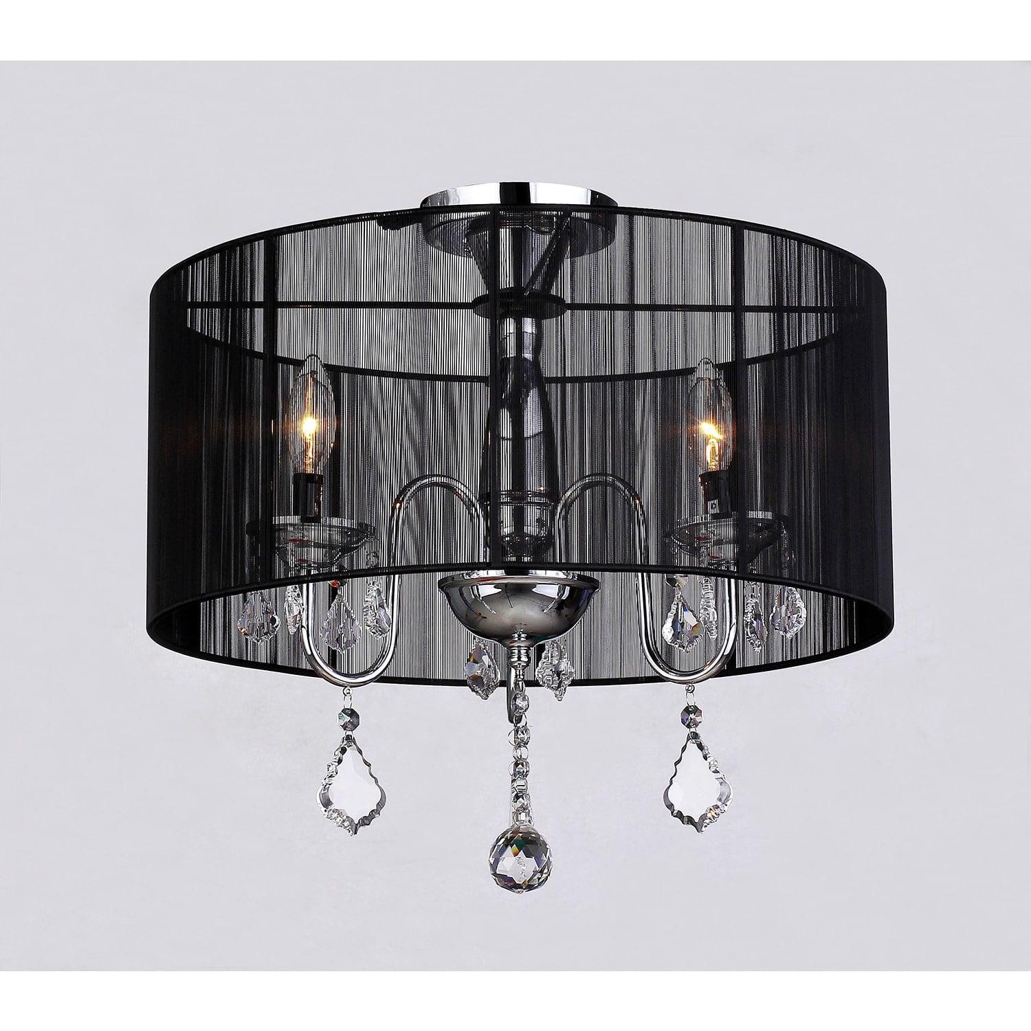 With its sheer black drum shade and faceted crystal drops, this Warehouse of Tiffany RL4804FAB Crystal Chandelier adds a little ooh la la to any space. Daring in the dining room, sensual in the boudoir, and perfectly unexpected in the kitchen or bath. This crystal chandelier has a polished chrome finish and three candelabra style lights (bulbs not included).