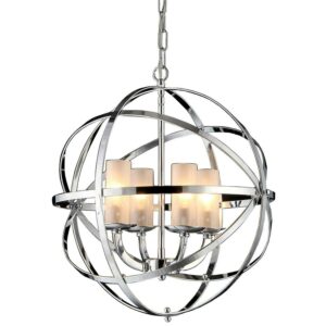 Create a mesmerizing, old-world look with the Warehouse of Tiffany RL804 Chandelier. It features a globe design that houses four pillar candle-inspired fixtures that will add a warming essence to your space. The fixtures also provide a contrast to the metal finish, elevating the chandelier’s visual appeal.
