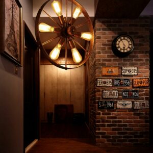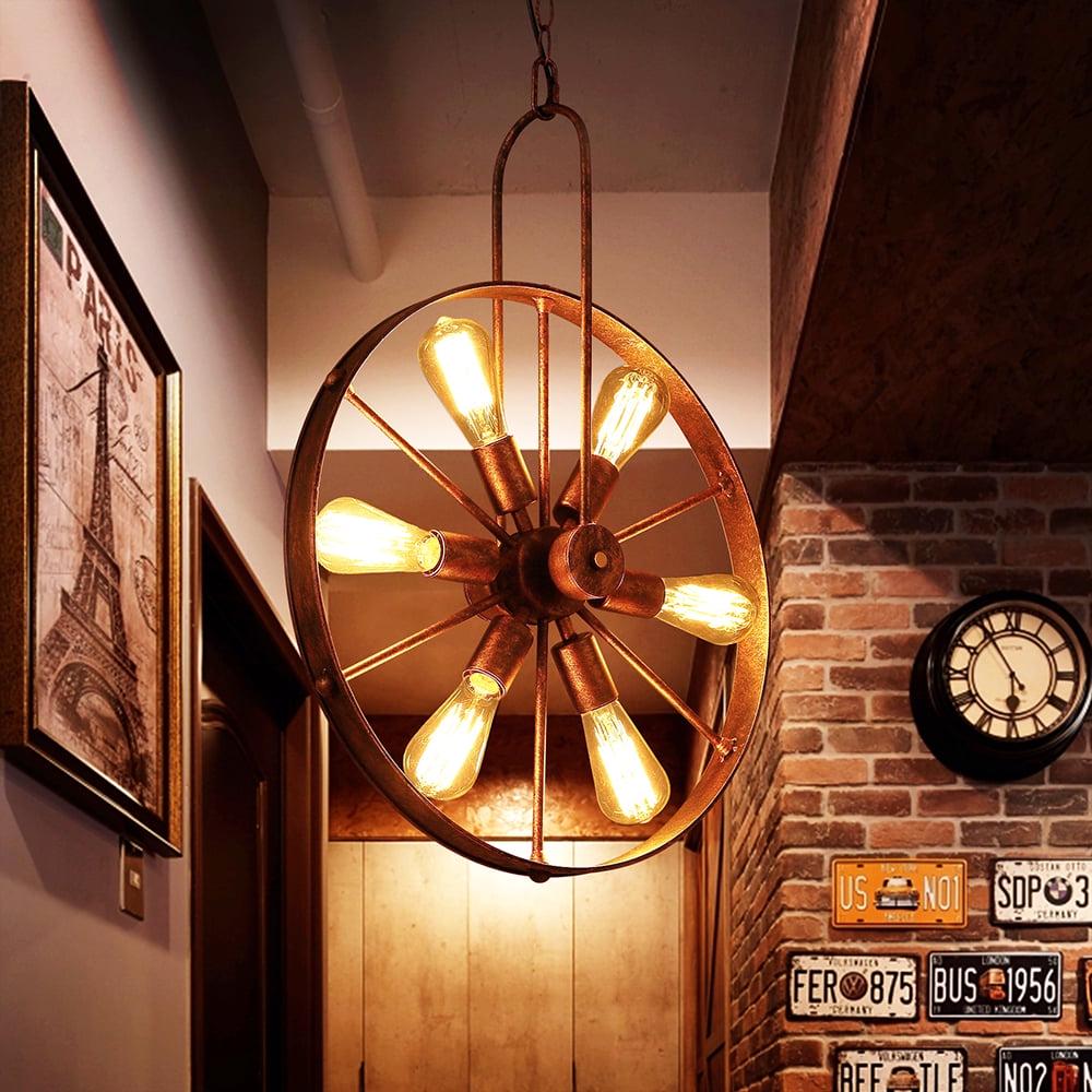 The Warehouse of Tiffany Saralin CY-DD-315 Rustic Wagon Wheel Chandelier infuses your home with a touch of rustic-industrial style. This wheel-style chandelier has a sturdy metal frame in a rustic copper finish that gives it an antique feel. It’s shaped like a vintage wagon wheel, with six light fixtures nestled between each spoke. With 30 inches of chain and 36 inches of wire, the chandelier is easy to install anywhere in your home, from your bar area to your kitchen and any place in between.
