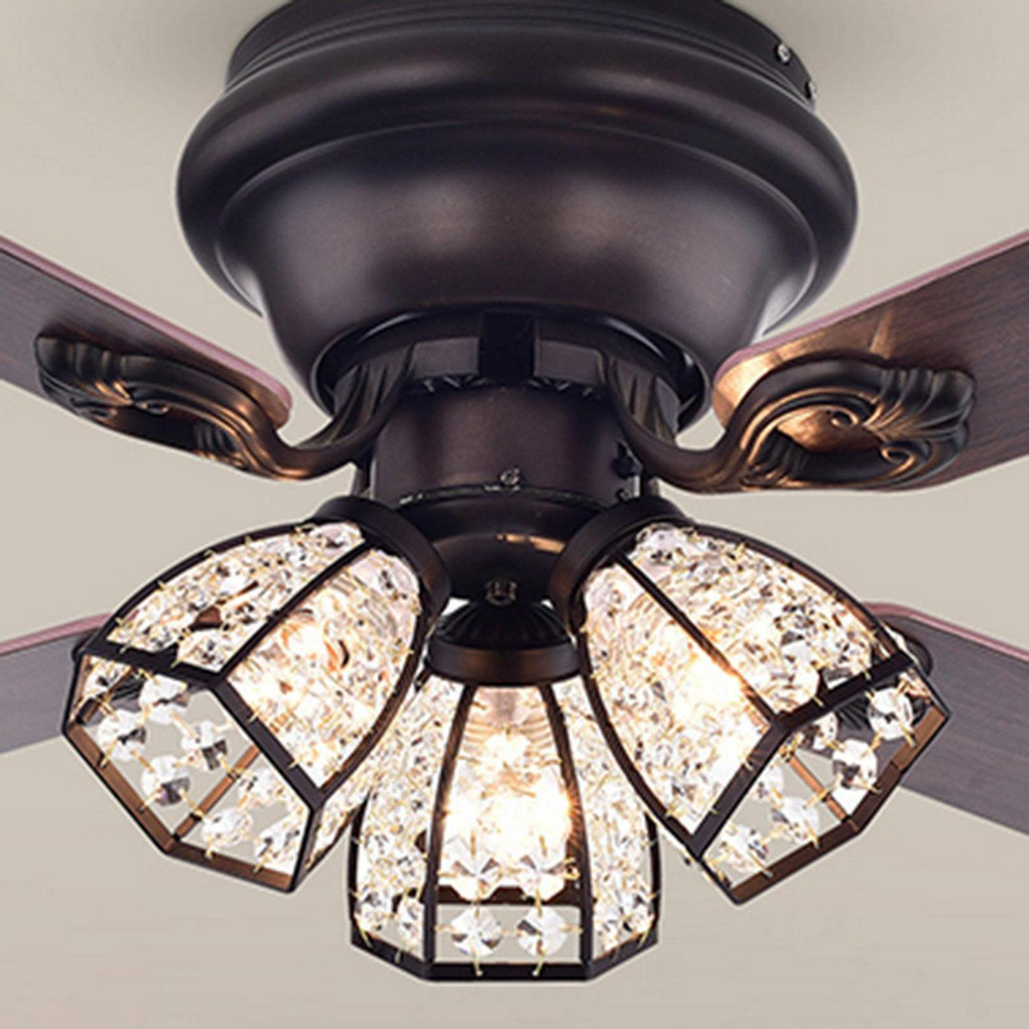 The Warehouse of Tiffany Tarudor 42 in. Indoor Ceiling Fan with Light features an updated look to traditional styling by featuring crystal-embellished shades and an antique bronze finish. The flush-mount design boasts a simple fan housing with sculpted blade brackets for added detail. The three-speed fan is reversible to keep you cool in the summer and cozy when it’s chilly. Your choice of available pull chain or remote controlled operation offers added convenience and wiring versatility.