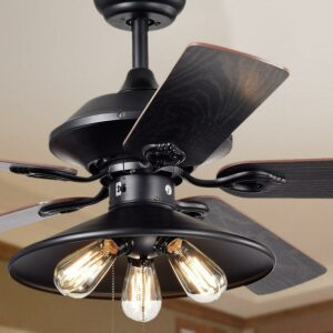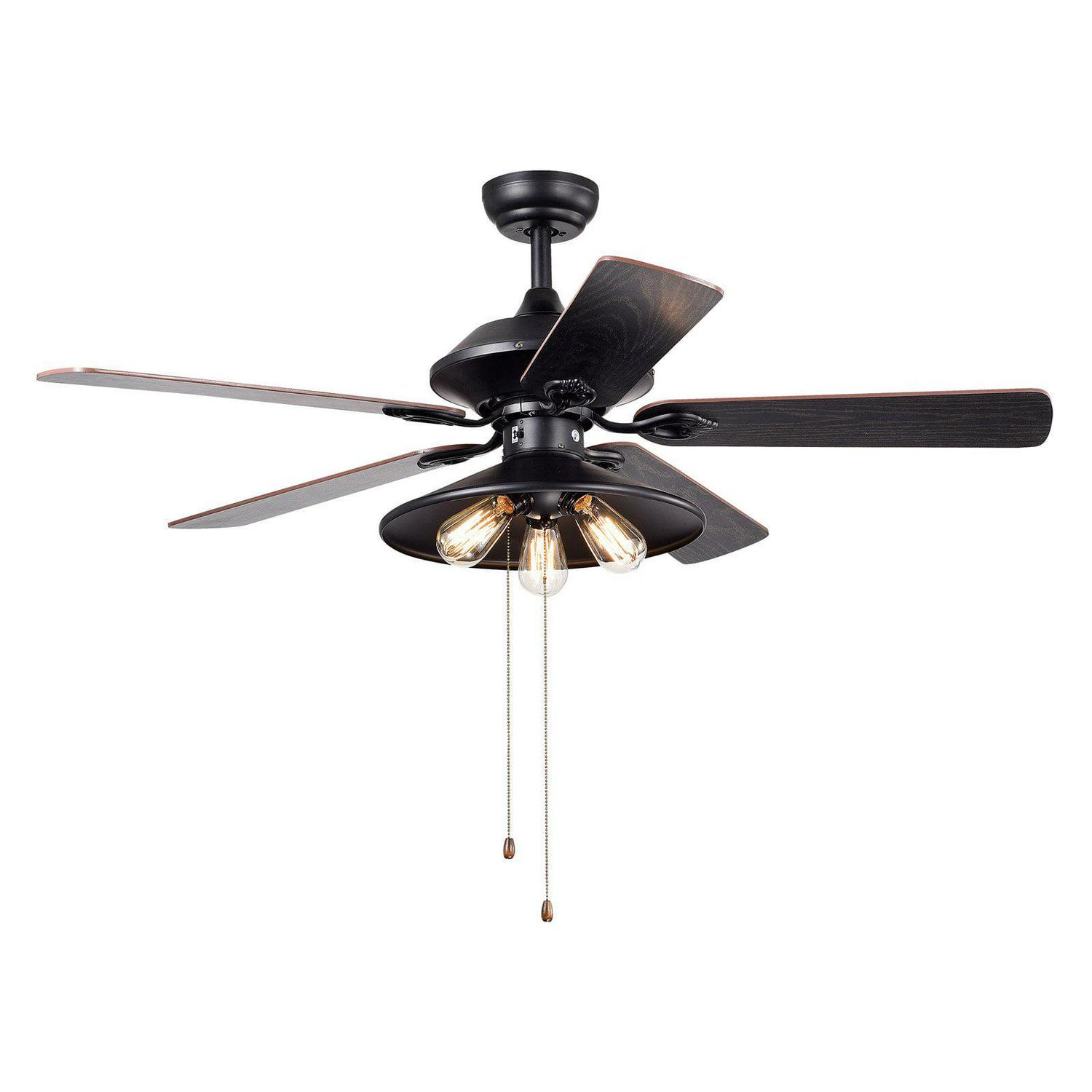 The Warehouse of Tiffany Upille 52 in. Indoor Ceiling Fan with Light brings a touch of industrial design to your home’s lighting by featuring a satin black finish and metal shade. The simple styling boasts clean lines, reversible blades, and sculpted brackets. You’ll enjoy customizable air flow, thanks to the reversible three-speed motor and easy pull chain operation. Included Edison bulbs provide an inviting glow to the room while offering plenty of light for tasking. The dual-functioning design makes this light and fan combination the ideal solution for those who want the comfort of a fan and room brightening illumination.