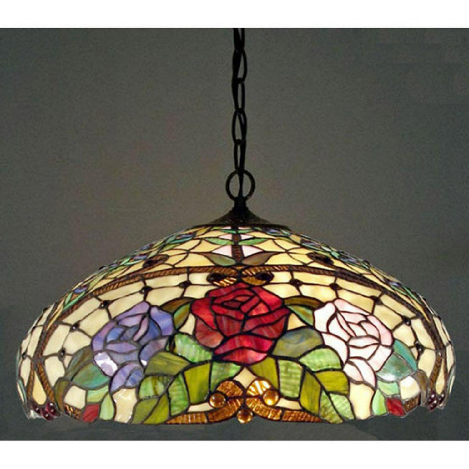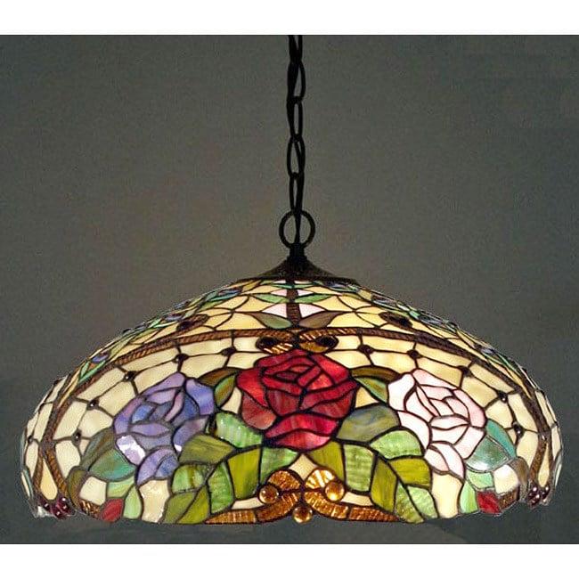 Beautiful Tiffany style glass roses adorn this Warehouse of Tiffany WOT-1299 Rose Pendant. This graceful pendant light requires two 60-watt incandescent bulbs (not included).