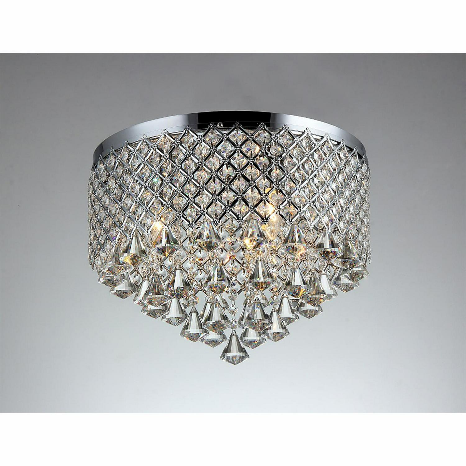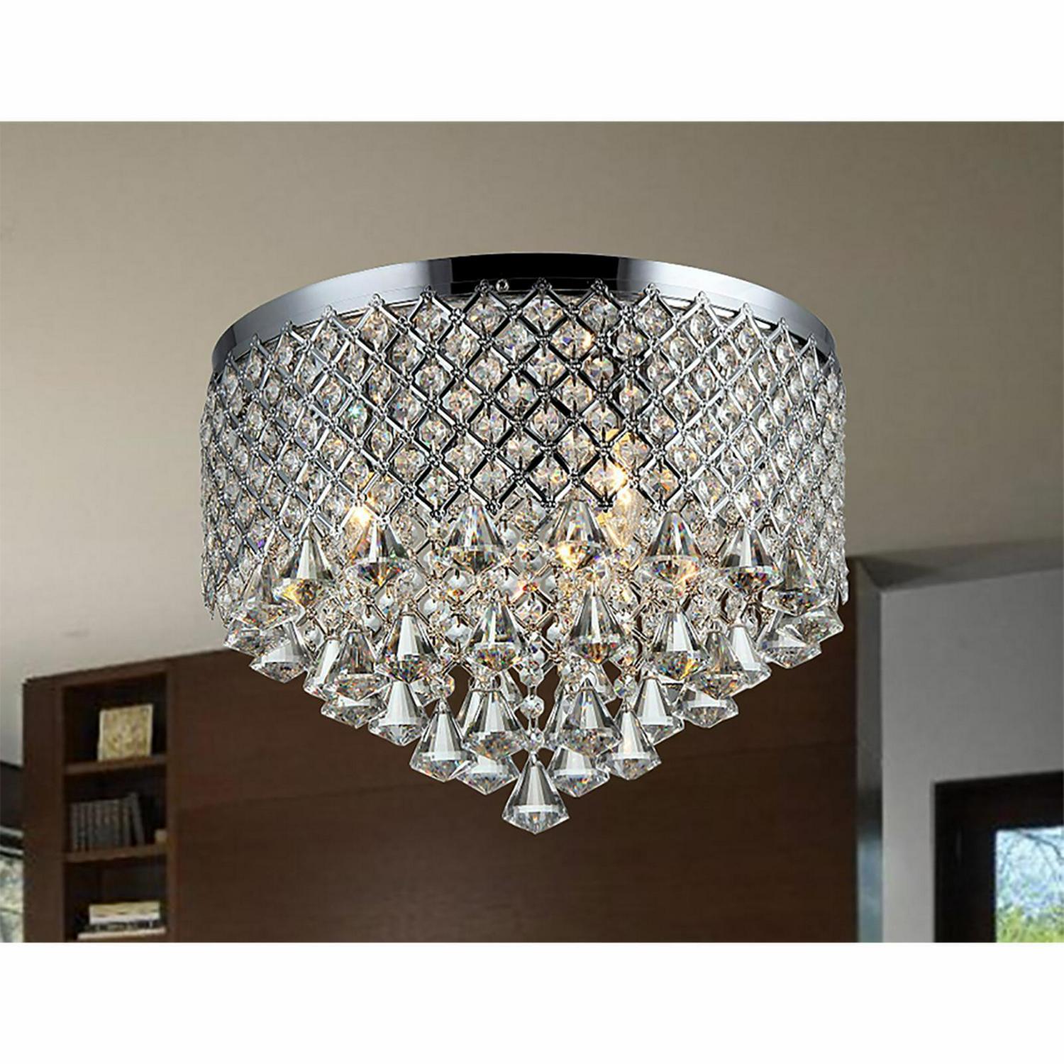 This beautiful light fixture will surely look good in your bed room, living room, dining room, kitchen, or entry way. If you are looking for a flush mount that is elegantly functional, this is the light fixture for you and your family to enjoy. It has a generous amount of unique and fabulous crystals dangling from its iron base in chrome finish.