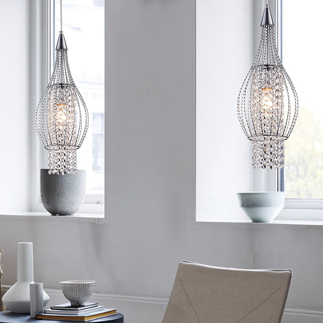 Give your space a chic upgrade with the Warehouse of Tiffany Xyza RL8048/1 Chandelier, which features a open-design teardrop shade that surrounds strands of dangling crystals. When the bulb is illuminated the crystals scatter the light, creating an eye-catching display. This fixture has a chrome finish, which enhances the sleek design.