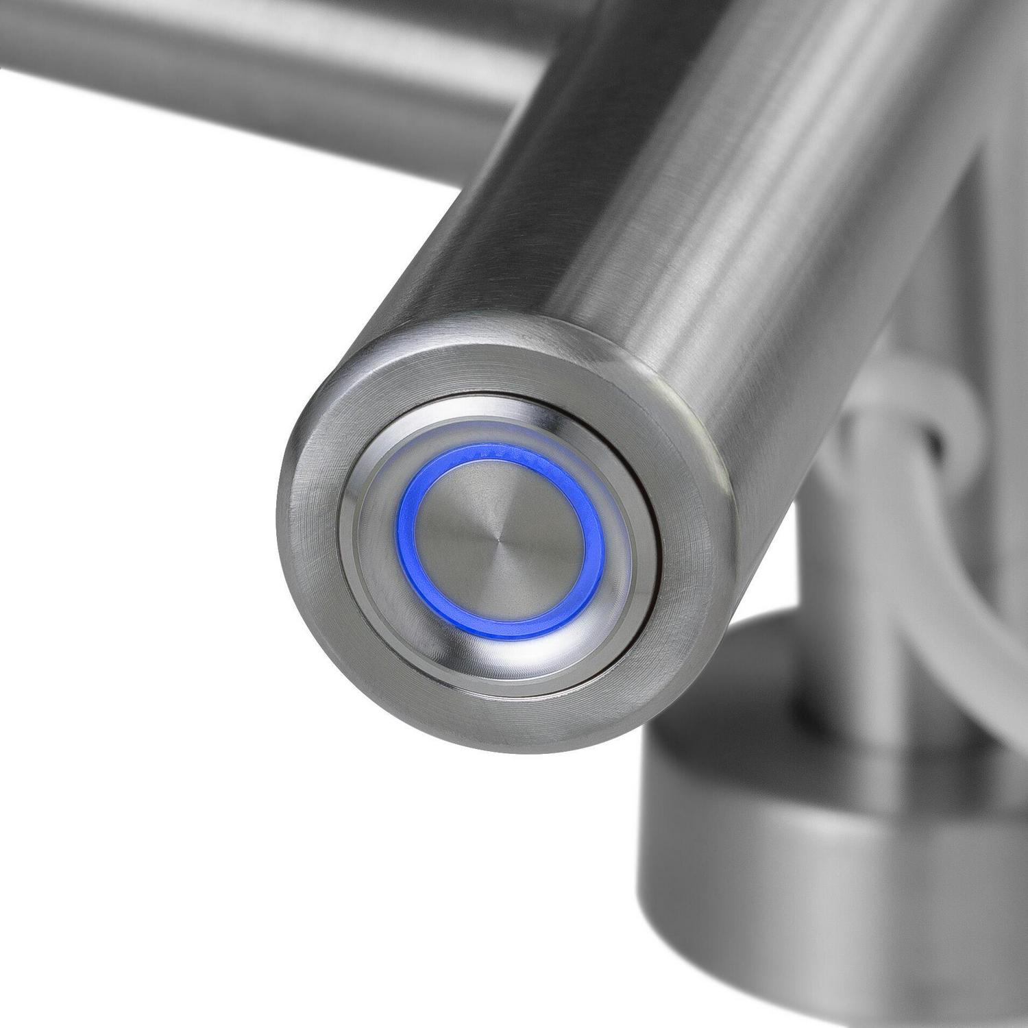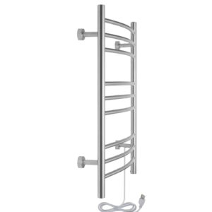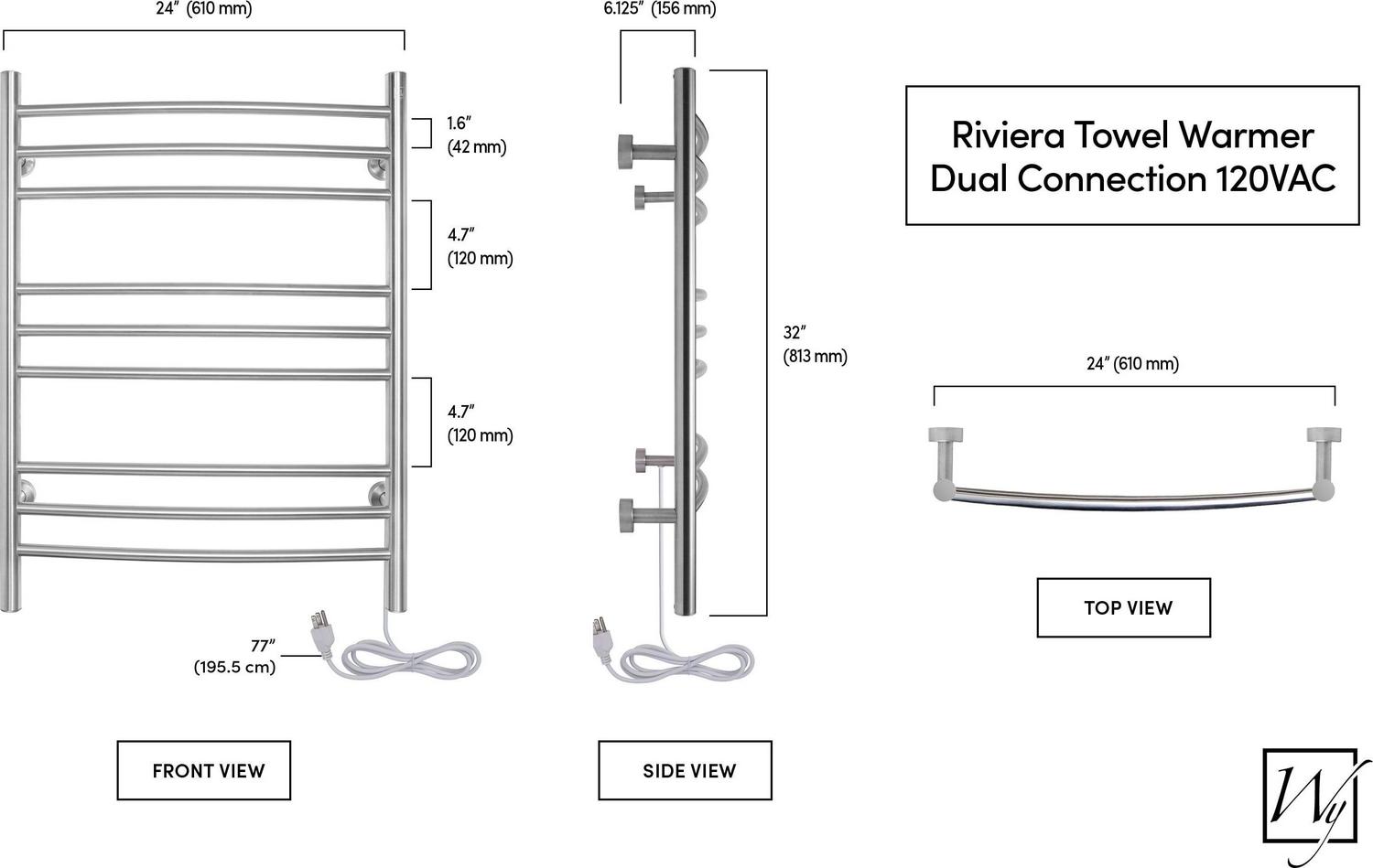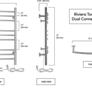 Warm towels are a luxury we don t always get to enjoy after all, putting towels into the dryer every time we took a shower would not only be inefficient, but inconvenient as well. Enter the Riviera towel warmer from Warmly Yours. This towel warmer is made of high-quality stainless steel with a brushed finish and has enough room to accommodate plenty of towels or bathrobes. The Riviera towel warmer adds class and elegance to the bathrooms in your home. With its brushed stainless steel finish, these electric towel warmers not only function well, they look great too. Each of the nine curved towel bars are designed to dry and warm large towels or bathrobes easily. Just imagine always feeling the comfort and coziness of a warm towel after your shower or bath, or waking up on a cold morning and being able to put on a warm bathrobe. This towel warmer is also dual connection which means that it can be used as is to plug into a standard 120 VAC outlet or it can be modified by a licensed electrician to have a hardwired 120 VAC electrical connection. When this towel warmer is installed with a hardwired electrical connection, there is no unattractive and cumbersome cover plate required because of its unique design. The Riviera is safe and is cETLus listed. It comes with an LED power switch and TempSmart overheat protection to prevent the unit s surface temperature from exceeding 176°F (80°C). Optional towel warmer controls sold separately.
