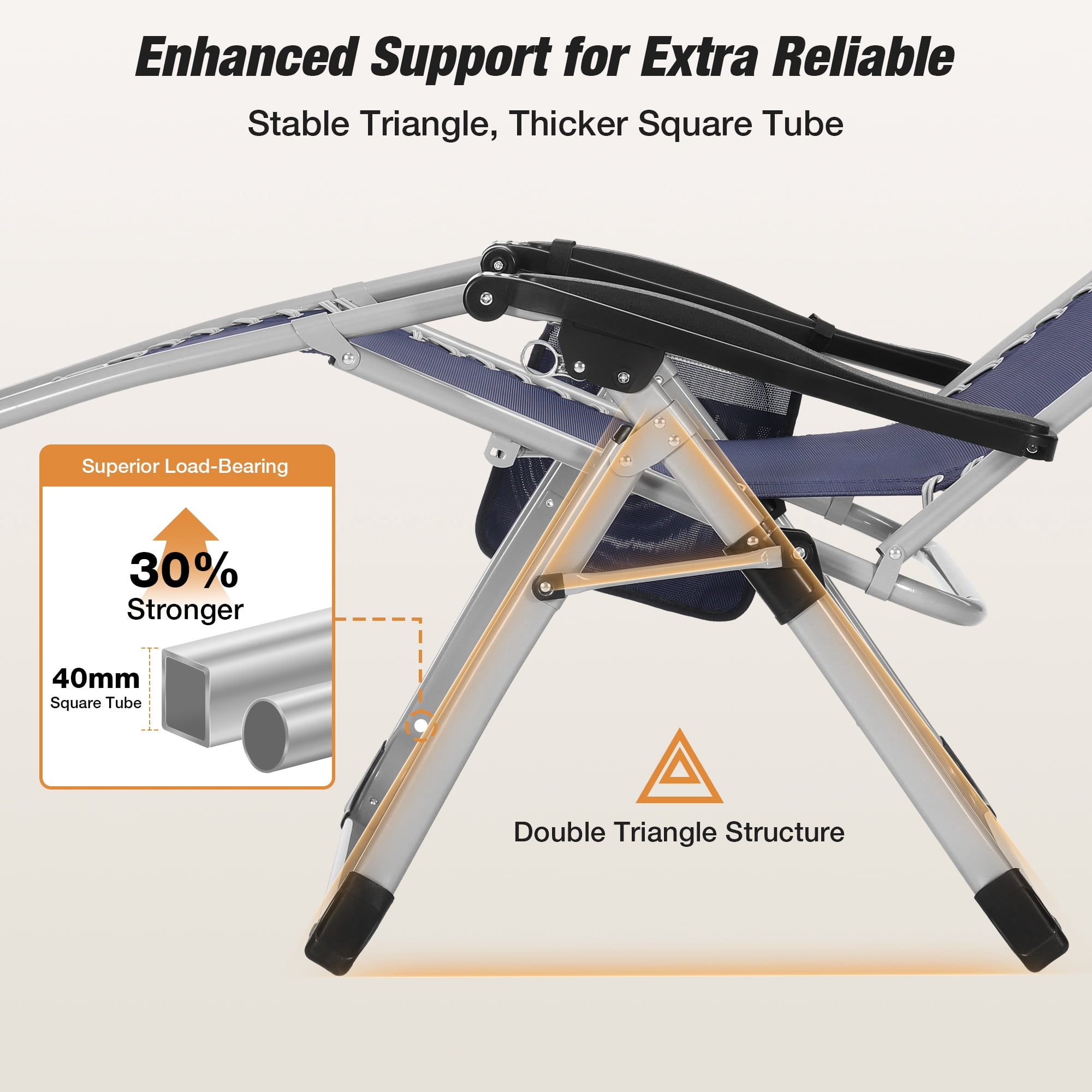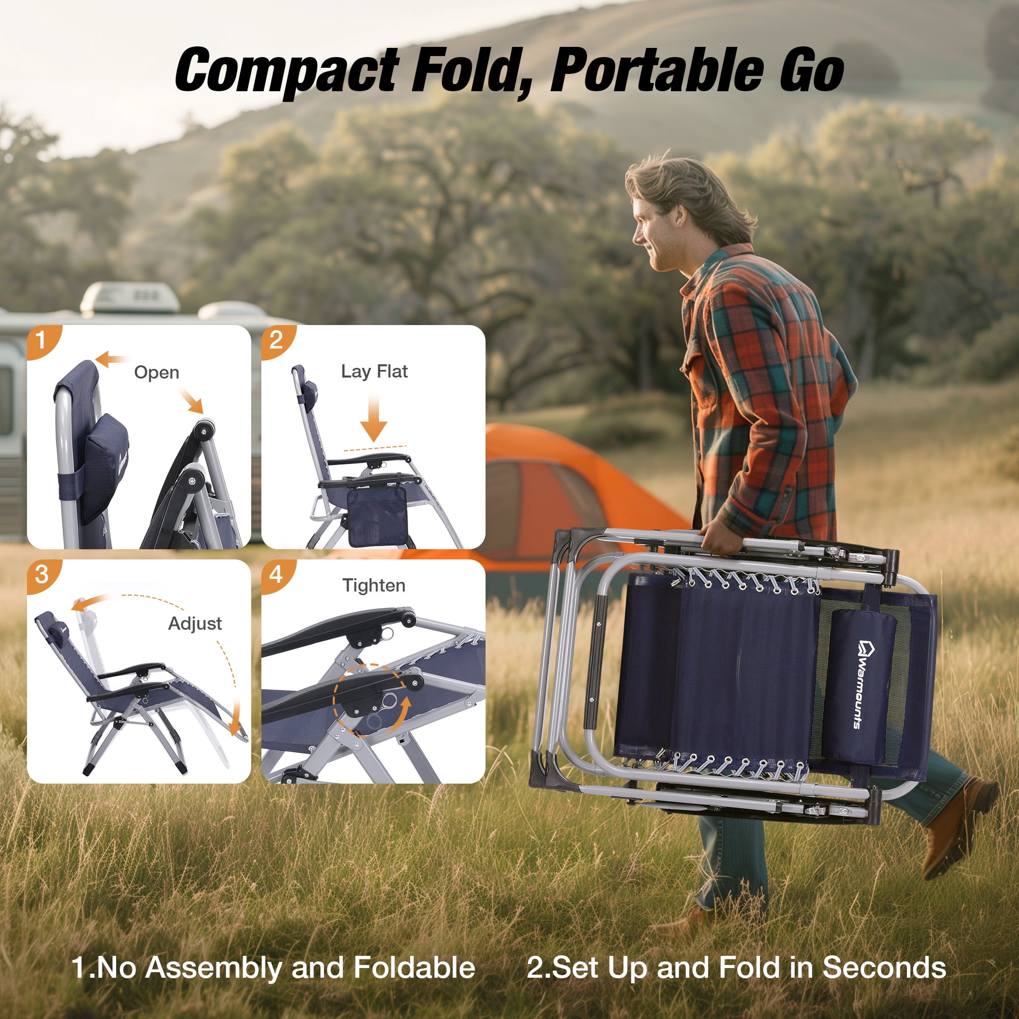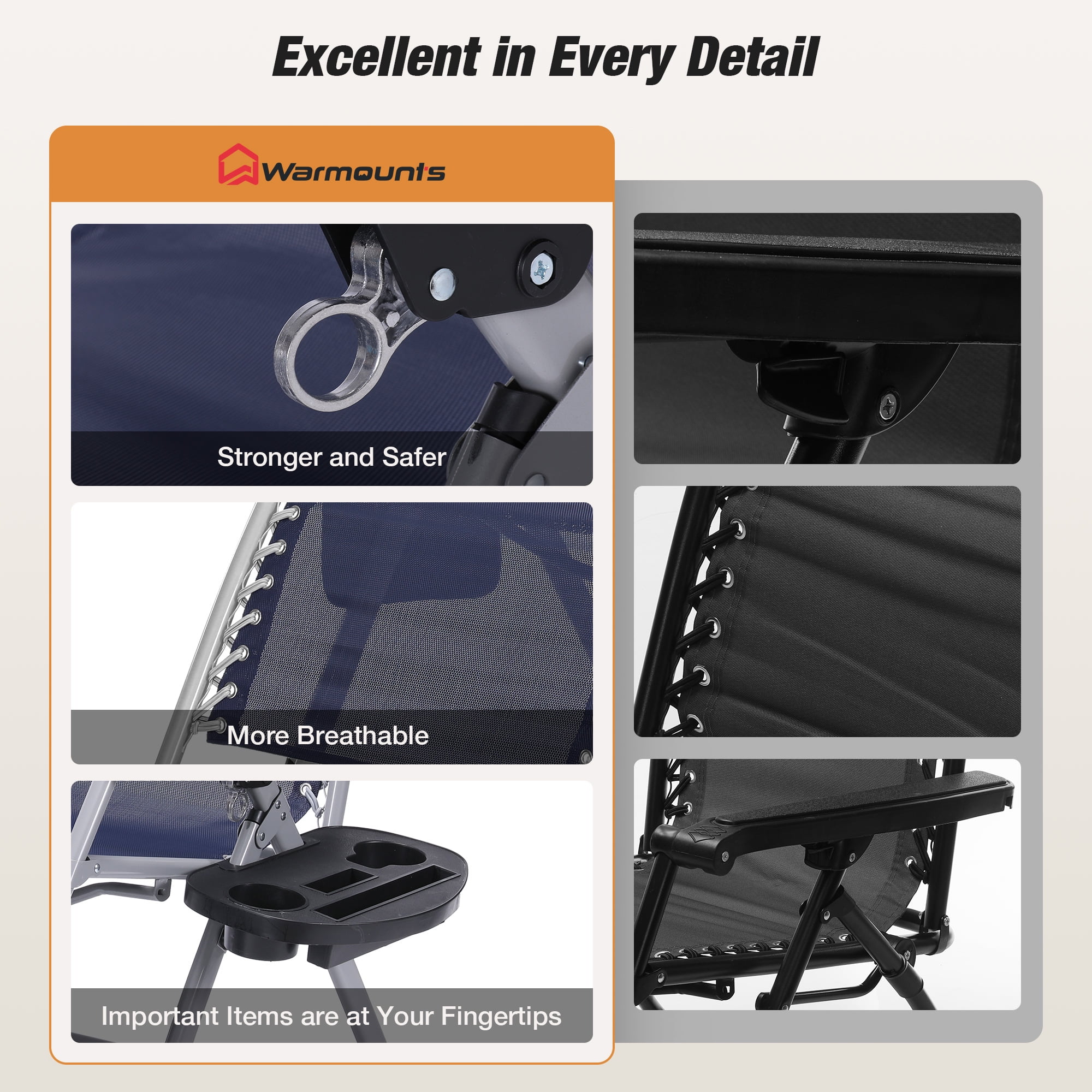 【Securely Relax on Any Position】WARMOUNTS foldable zero gravity recliner conforms to ergonomic design, fits the body curve and creates a zero gravity experience. Equipped with lockable reclining system (metal latch) to ensure easy adjustment from 90° to 170°, customize your lockable comfort. 【Enhanced Support for Extra Reliable】40mm square tube and double triangle structure increase stability by 30%, reduce shaking, and support up to 500 lbs. Thickened square tubes enhance durability, making oversized XL 29” ergonomic zero gravity lawn chair longer lasting. 【Cool or Cozy, All-Season Relax】Made of steel and upgraded breathable textilene fabric, ideal for summer. The removable 3″ soft pad adds comfort for fall and winter. These features keep the chaise cool in summer and warm in winter, meeting your needs year-round. 【Compact Fold, Easy Store】Set up and fold in seconds. Remove the chair, release the armrest clasps, and open the bracket. Sit down, push the clip to unlock, and pull it back to lock in place. Easily find the perfect angle for comfort. 【Extra Wide Lounging】29” cushion for zero gravity lounge chair with set up size of 30”×29”×45”, folded size of 37”×29”. The camping lounge chair is easy to transport and store, easily carry it by car. Extra wide lounge chair for spacious and comfortable living. 【Excellent in Every Detail】Upgraded antigravity lounge chair outdoor features firmer, more secure latches and a more breathable, comfortable fabric. In comparison to previous generation it also includes a place to put your cell phone for storage, so that important things will be at your fingertips and close at hand. Package List: 1 x Reclining Lawn Chair 1 x Cushion 1 x Pillow 1 x Side Tray