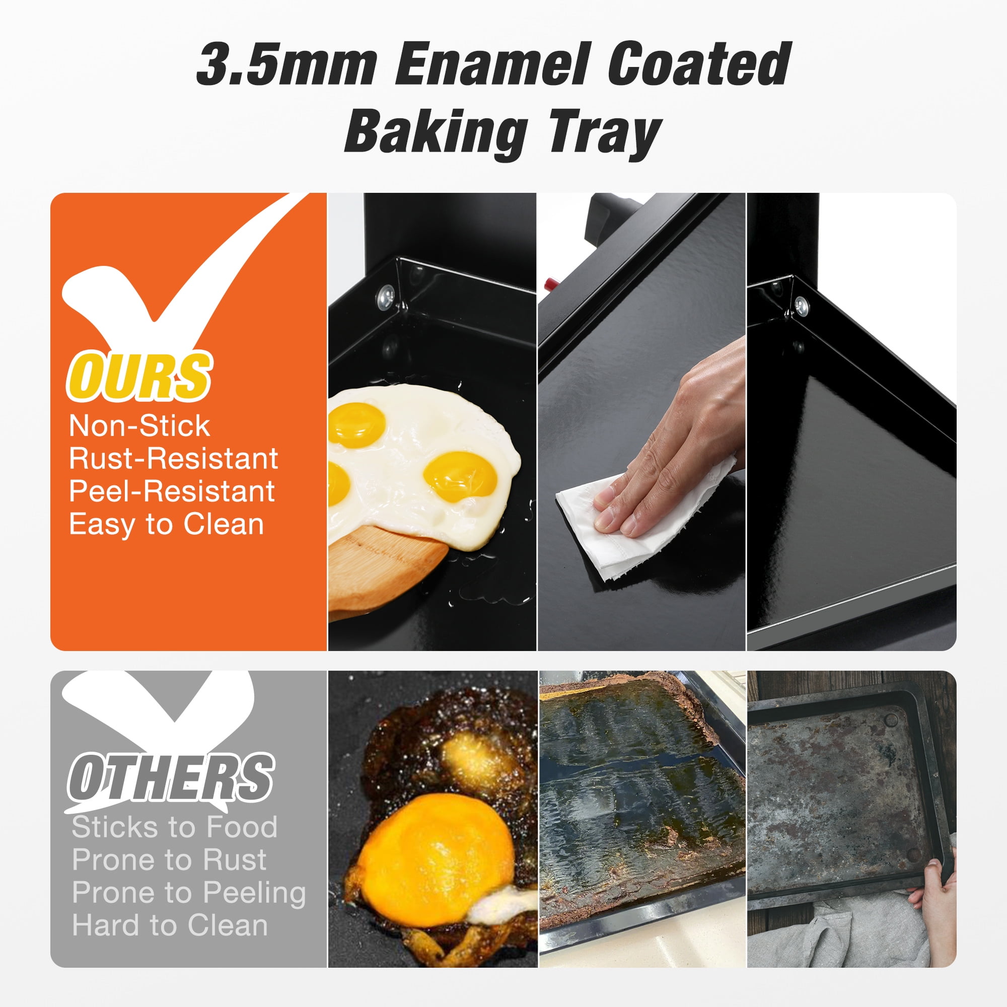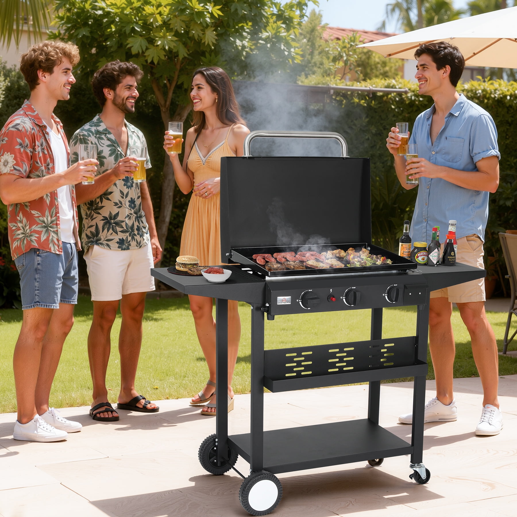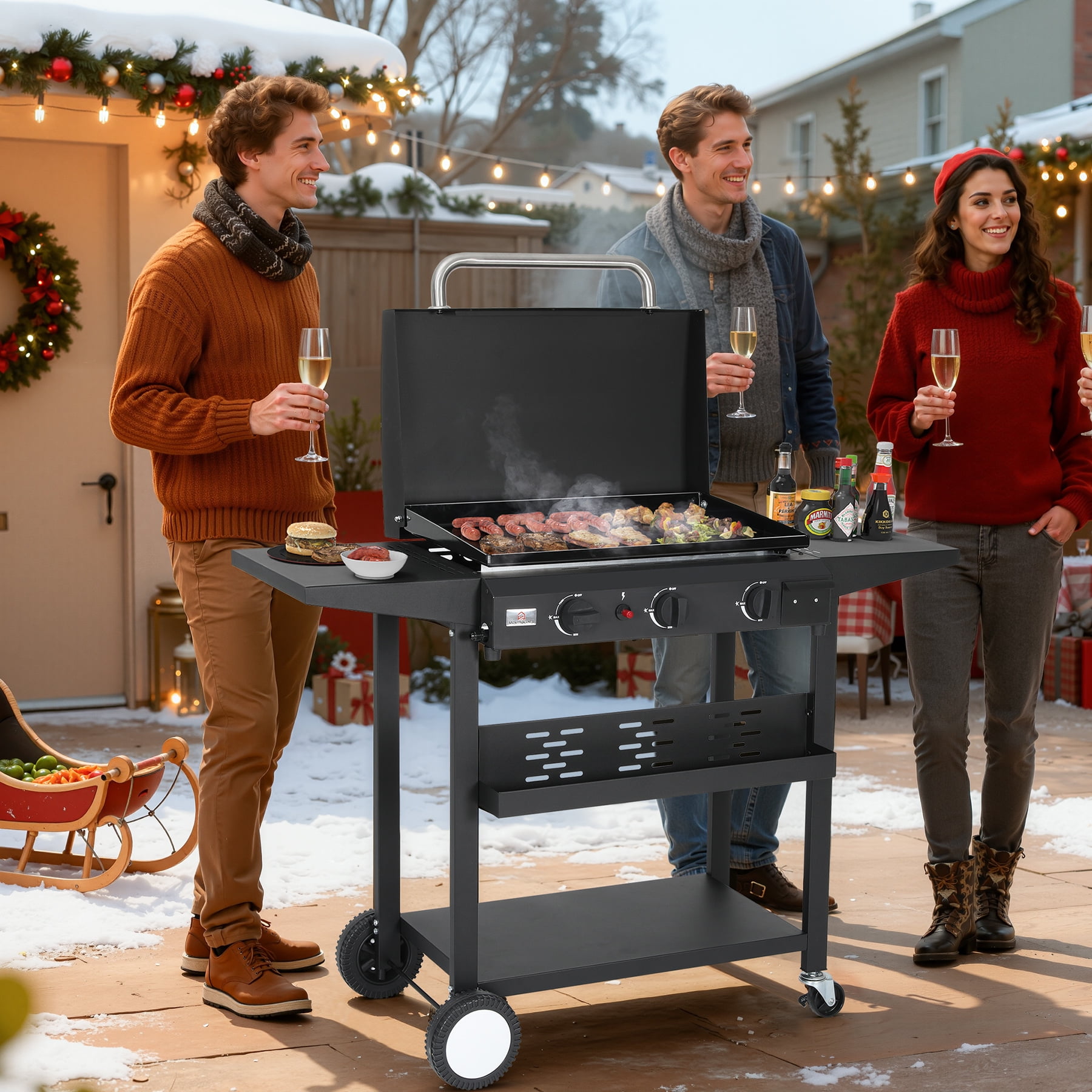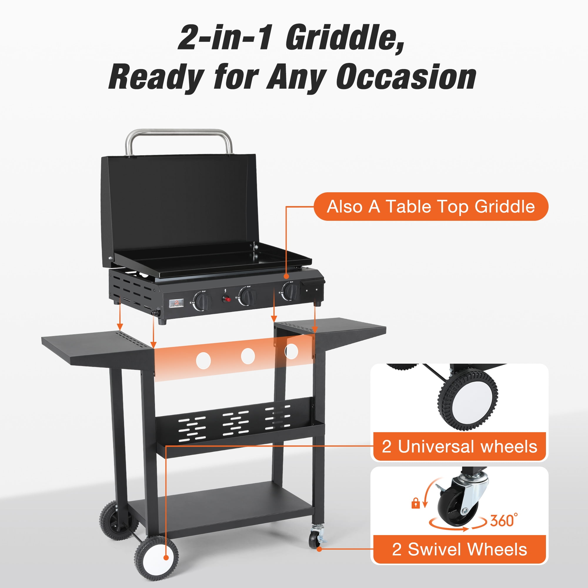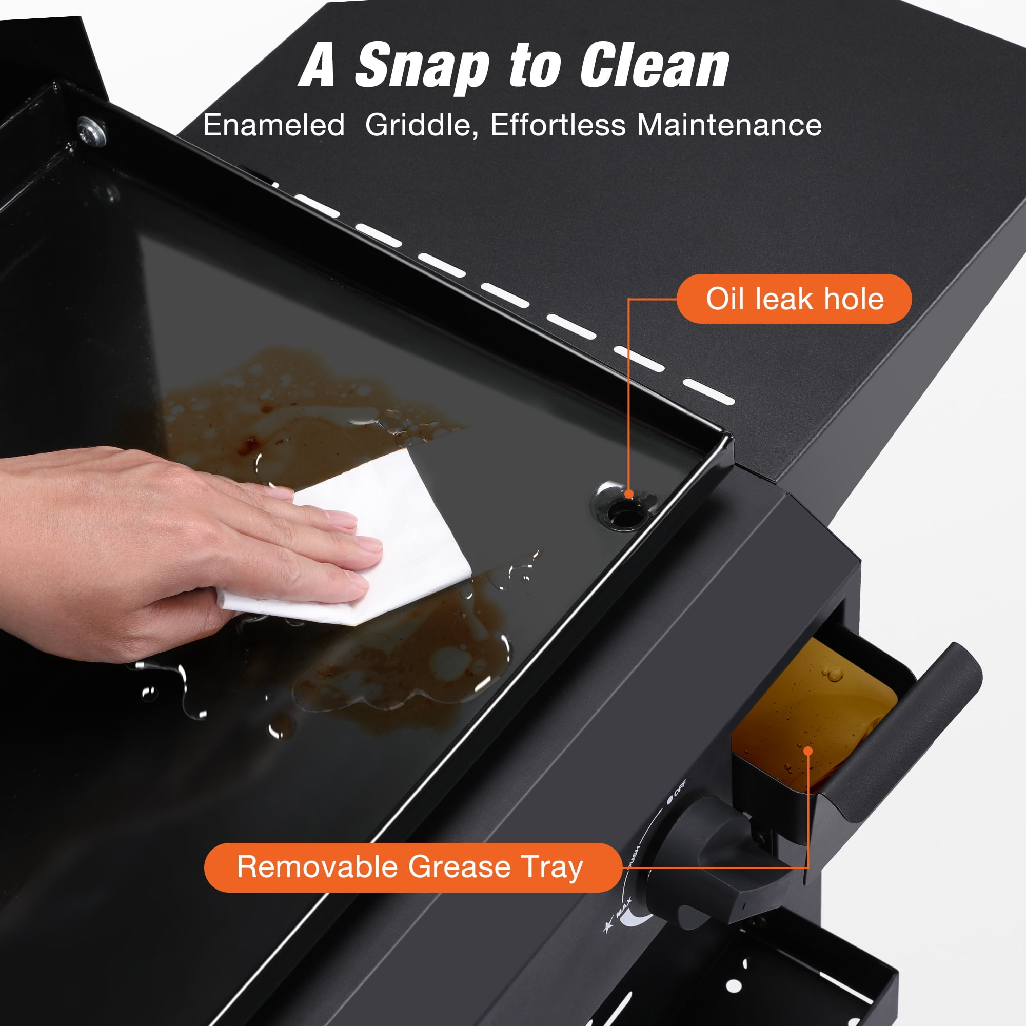 Key Features: 【2 in 1 Propane Griddle】 Removable outdoor griddle design, the flat top grill can be removed independently. Easy to carry after removal, placed on the table as a tabletop grill. Two ways to use, use as a garden cart outdoor griddle or a portable tabletop grill. 2 universal wheels and 2 swivel wheels, make it more flexible to move around. Quickly used or stored without tools, suitable for camping and BBQ. 【Spacious Cooking Surface】 With a large 450 square in cooking area measuring 23 x 20 in, our removable flat top grill with lid is suitable for gatherings of 3-5 people. Cooking multiple foods at the same time and flip the food easily. Whether it’s cooking eggs, pancakes, grilling cheese, seafood, or steak, you can do it all with ease. 【Even Heating & Controllable Heat Zones】 3 independently controlled tube burners offers a total of 24, 600 BTU of power, maintain a constant temperature on the entire surface. Turnning on 3 heat zones of the propane gas griddle to cook more different dishes at the same time, or use a single zone for more energy saving. The temperature of different heat zones are accurately controlled by the knob. Heats more evenly than 4 burners gas griddle, not easy to deform. 【3.5mm Upgraded Enduring Material 】 To withstand the rigors of outdoor cooking, our baking tray is made of upgraded enamel. 3.5mm thickened high-strength enamel material will more effectively prevent rust and sticking, will not deform even at high temperatures, enhance cooking experience. No peeling, easily clean up with kitchen paper towels, bring more protection for health. 【Practical lid & Storage space】 To improve the usability, we equipped the propane griddle with a protective lid, adjust it according to your needs. When opened, it blocks wind and prevents oil splatter, making heating more efficient. When closed, it will keep the food warm and protect the baking tray. No need to worry about the food getting cold and taste getting worse. Also 3 storage spaces: side tables, lower shelf and storage slot to place seasonings, ingredients or paper towels. Provides convenience for cooking. 【Easy to Clean】 3 burner gas griddle’s front access grease management system features a concealed grease pan that makes the cleanup time a breeze. The oil collection system will collect excess grease into a slide-out grease pan. Simply use the kitchen paper towels to clean the baking tray and wipe the exterior of the griddle with a cleaning cloth and detergent. No need to spend time on maintenance after use. How to clean the baking tray correctly: 1. If there is only a small amount of grease or slight food residue on the enamel baking tray, wipe it clean directly with kitchen paper. 2. For stubborn stains, burnt food residues or accumulated grease that are difficult to remove, wipe it with warm water and detergent, use a sponge or wooden or plastic spatula to remove the residue, and then wipe it clean with kitchen paper. 3. The oil collection system will collect excess grease into a slide-out grease pan. Remove the grease pan, pour out the grease, and clean it with detergent. Cleaning Tips: √ Kitchen Paper Towels √ Sponge √ wooden/plastic scraper × Metal Brushes × Steel Wool 【Note】It is not recommended to use a metal brush or steel wool. And the above items are not included in the package. Specifications: Power: 24600 BTU Cooking Surface Length: 23 in Cooking Area: 450 square in Product Dimensions: 32 x 19 x 17 in (L x W x H) Product Weight: 55 LB