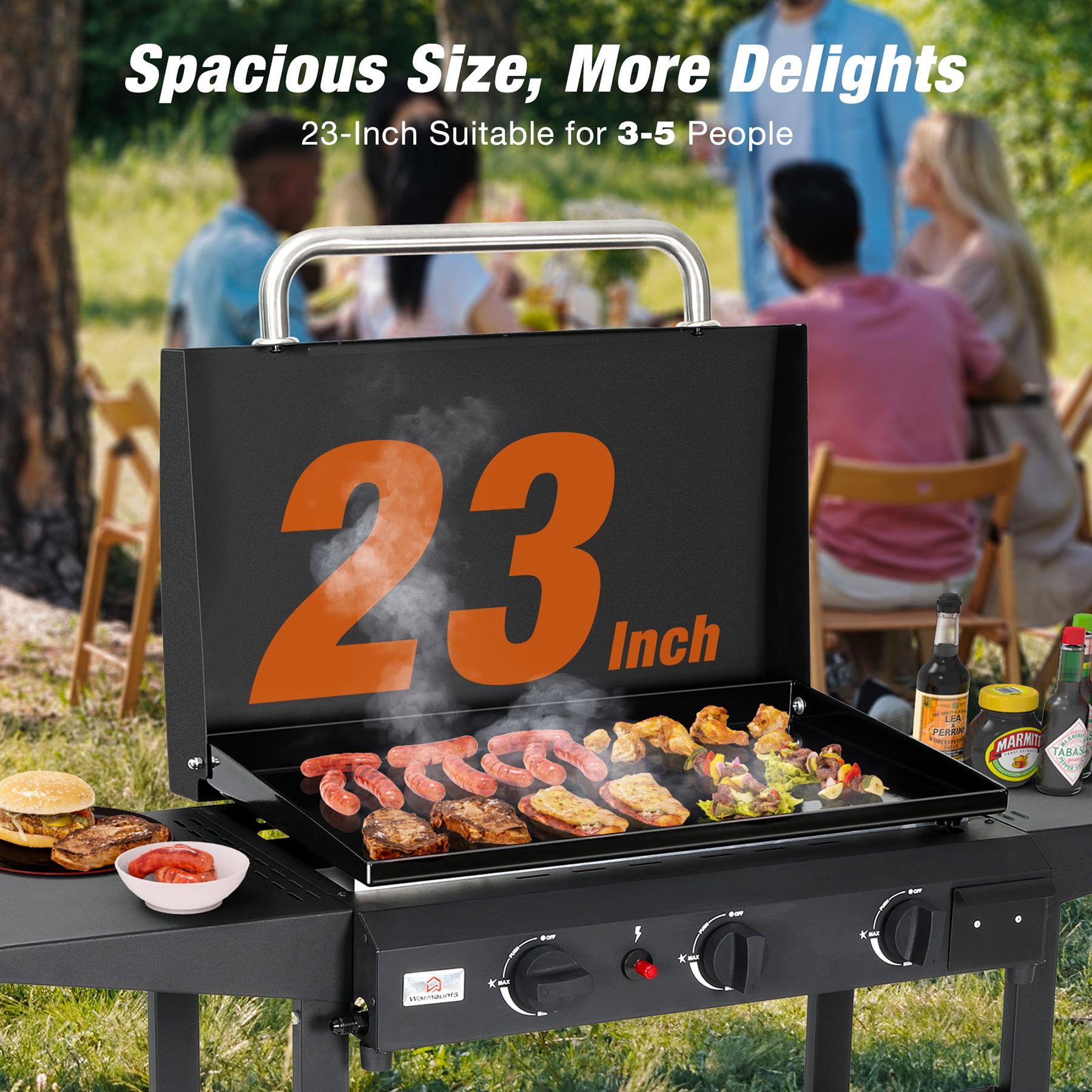 WARMOUNTS 3 Burner 23” Propane Gas Griddle Removable, 2 in 1 Portable Flat Table Top Grill with Lid, 24600 BTU Outdoor Griddle with 4 wheels, Nonstick Enameled Tray, Side Tables, for Camping, BBQ
