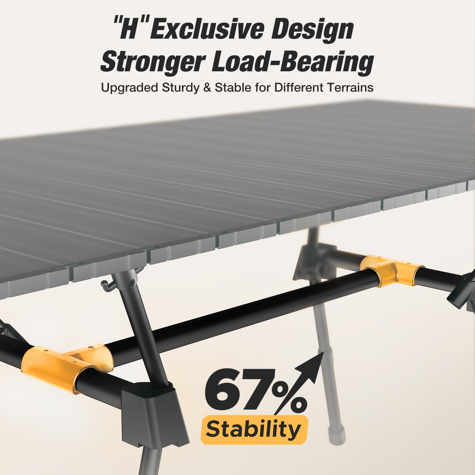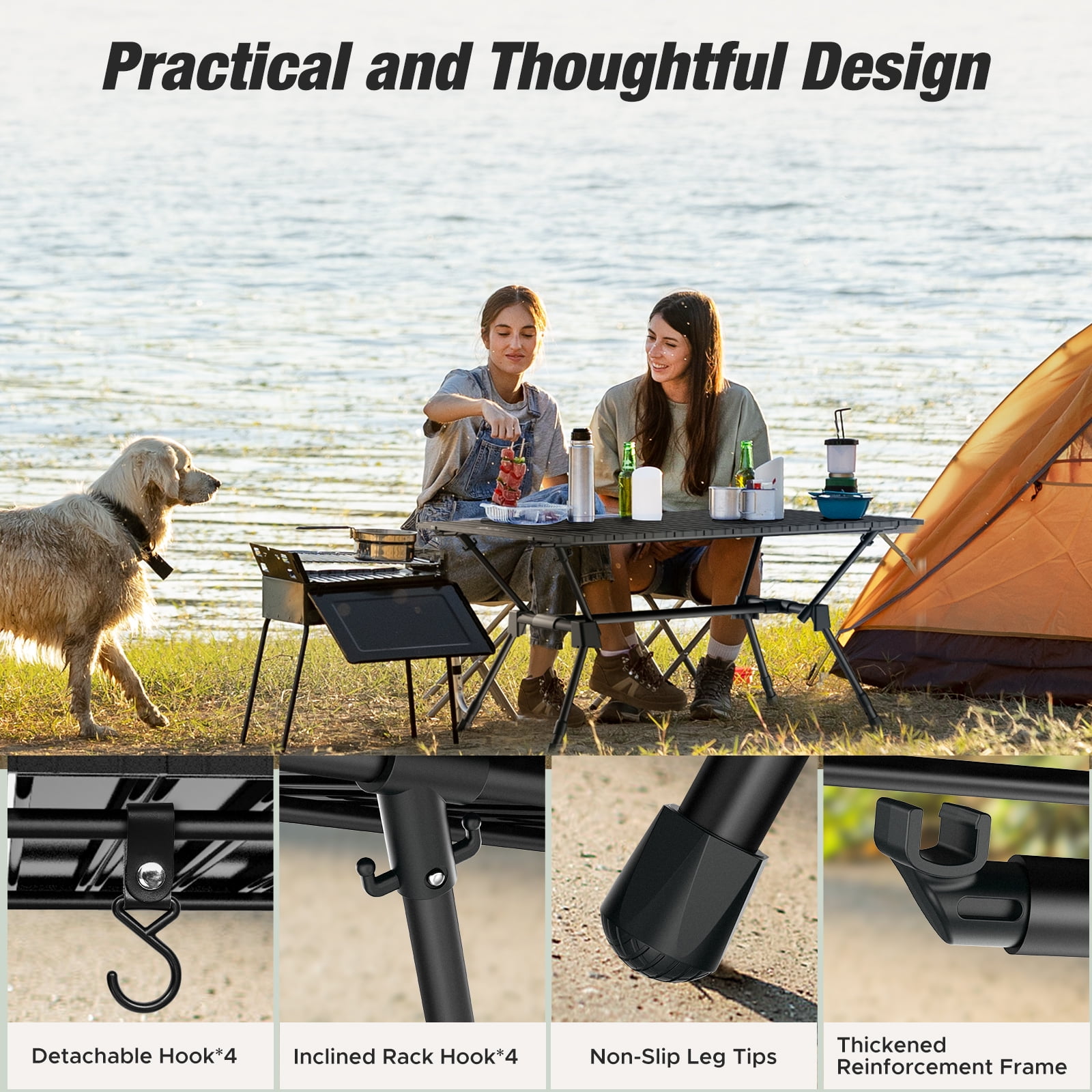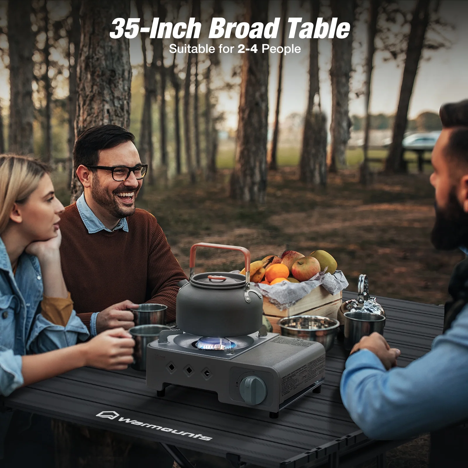 【Sturdy for More Gourmet Delights】WARMOUNTS pioneering exclusive Ultra-Stable “H” Structure. This design distributes force evenly, increasing stability by 67%, and noticeably reducing shaking, compared to triangular or square structures of metal foldable tables for camp. With this structure, the loading capacity of the picnic camping table is up to 145 lbs. 【Multi-Usage, Comfort at Its Best】The portable beach table adopts an adjustable height design. Just press the button on the table leg of aluminum roll up table foldable to adjust the height from the lowest 4″ to the medium height 16.5″, and then to the highest height 21″, fully meeting your needs. 【Compact Fold, Broad Spread】The portable camp table size measures 35″ Wide, unfolded size of the table is: 35”×23.6”×21”. WARMOUNTS aluminum outdoor camping table that fold up lightweight weighs only 8.8 lbs, and it can be folded into a compact size: 24.8”×5.5”×6.7”, 1/3 of the size of traditional collapsible table portable. Carrying it for various activities is a breeze. 【Worry-Free Use, Built to Last】Made of aero-grade aluminum alloy with anodized surface, the camp table for grill is not easy to rust, corrosion-resistant and easy to clean, effectively prolonging its service life and making aluminum roll up camp table to cook on an ideal choice for outdoor indoor activities. 【Set Up in Seconds, Ready to Enjoy Your Trip】With just 4 steps, no tools are required, simply align the installation port with the shock-cord poles and pull ring to assemble the foldable adjustable height folding table, and disassemble the camp kitchen table is just as simple. Specification: Brand: WARMOUNTS Color: Black Weight Limit: 145lbs Item Weight: 8.8lbs Unfolded Dimensions: 35.8”×23.6”×21” Folded Dimensions: 24.8”×5.5”×6.7”