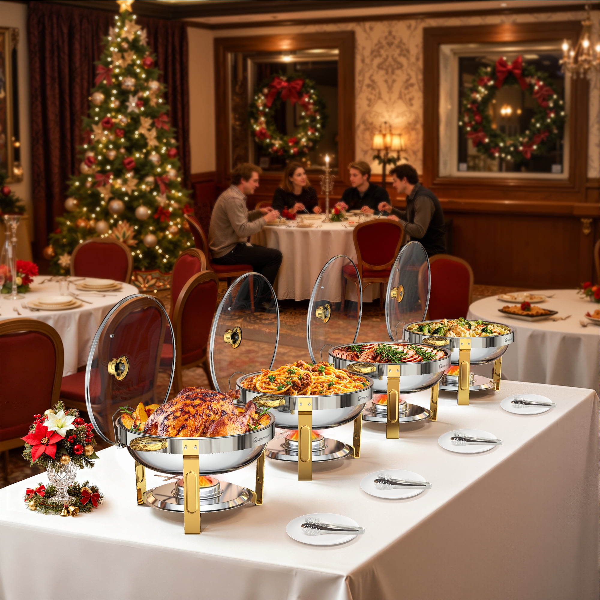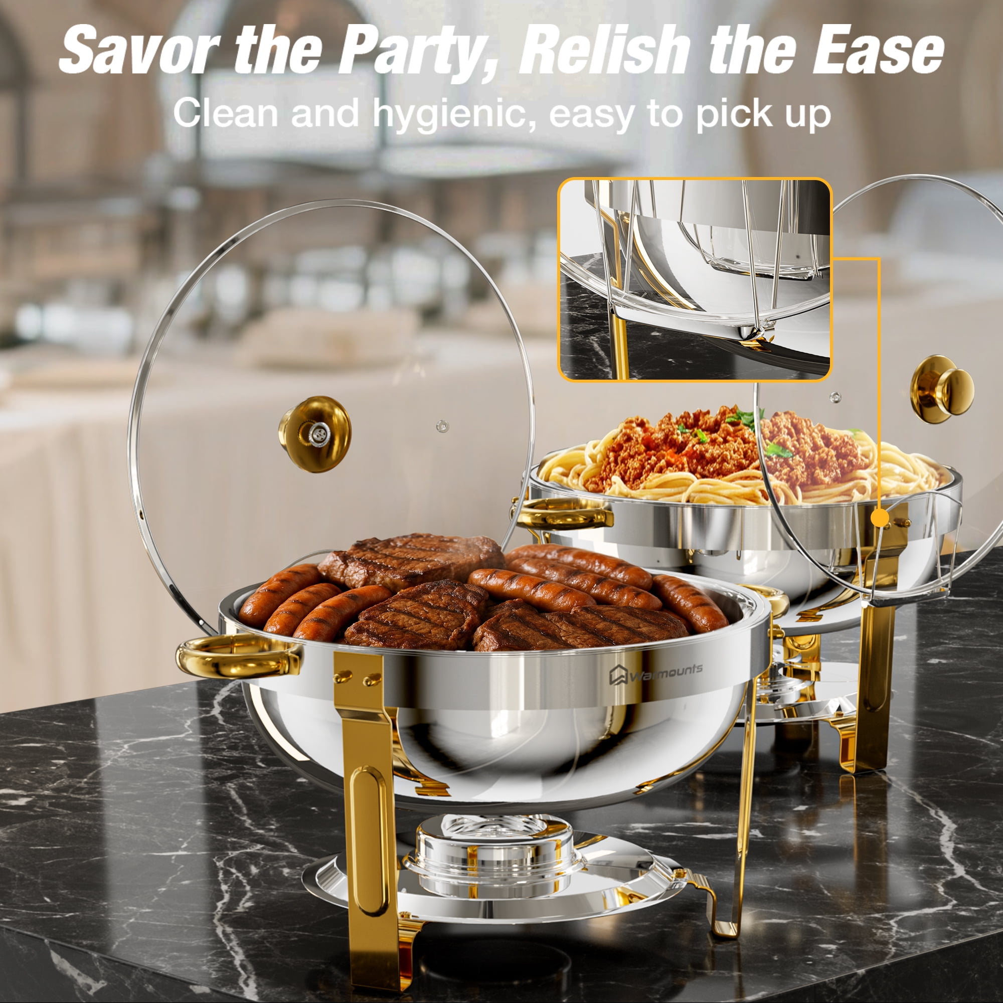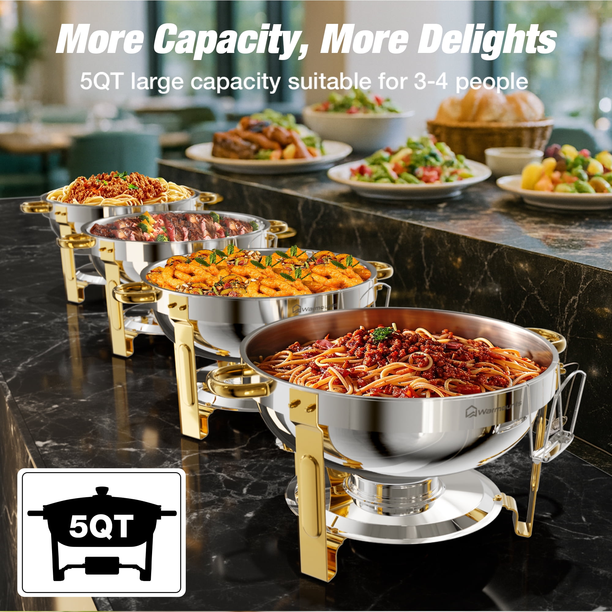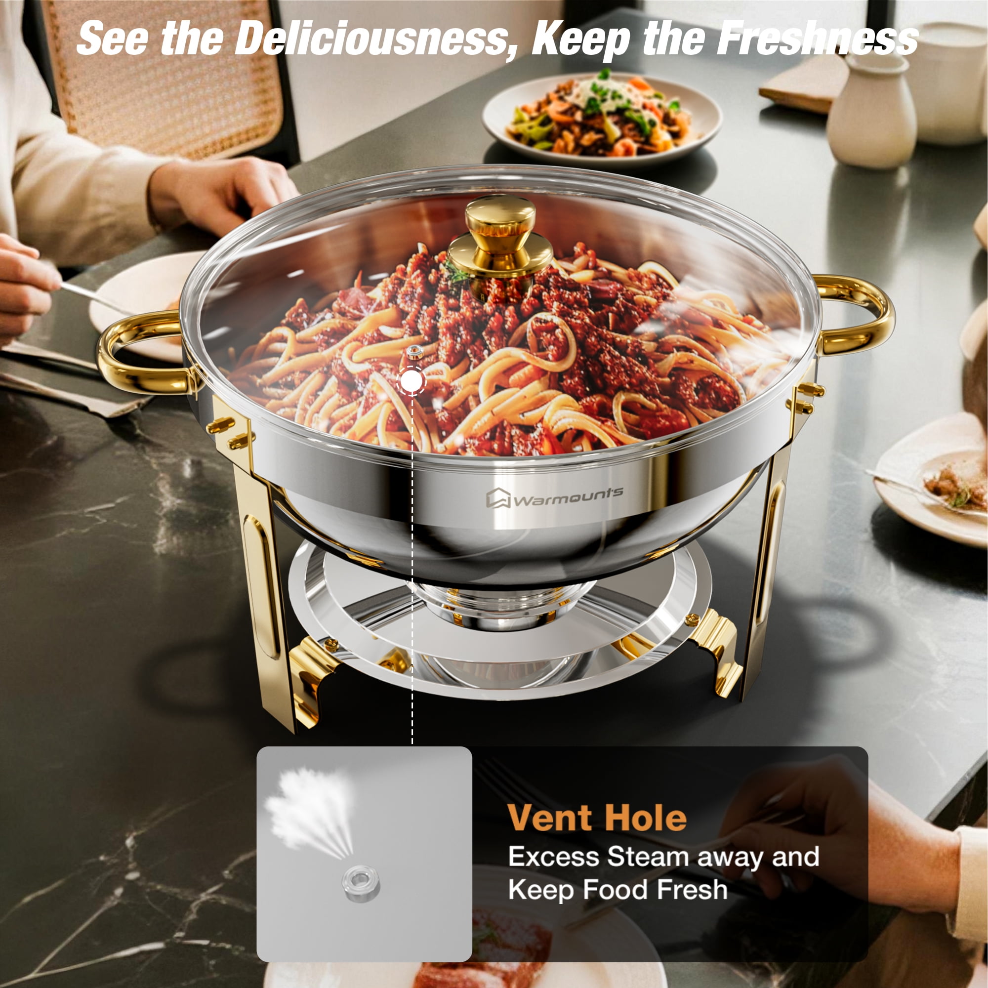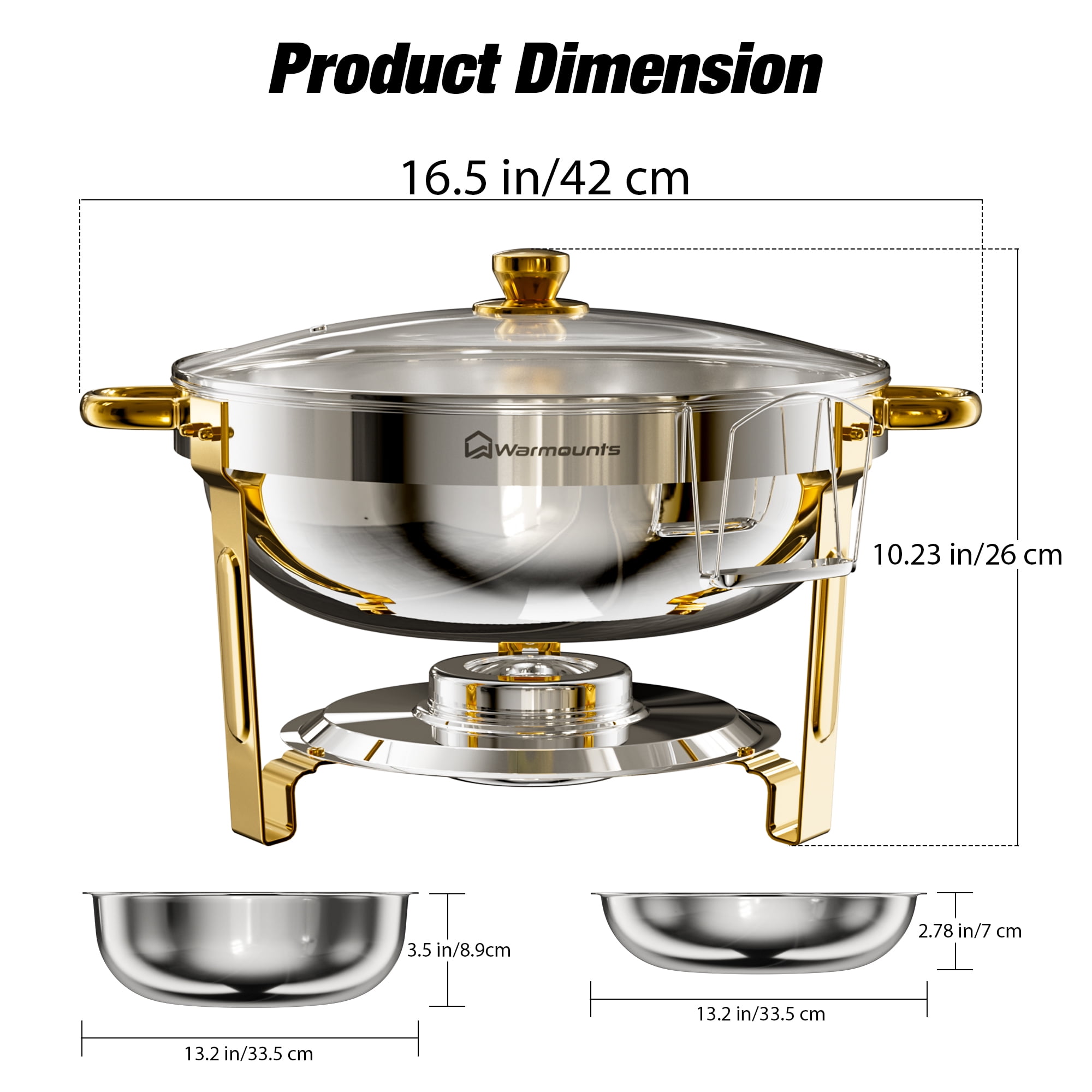 WARMOUNTS Chafing Dish Buffet Set Series 1️⃣Click here for 5 QT-1PCS Silver Glass Lid Chafing Dish 2️⃣Click here for 5 QT-2PCS Silve Glass Lid Chafing Dish 3️⃣Click here for 5 QT-4PCS Silve Glass Lid Chafing Dish 4️⃣Click here for 5 QT-6PCS Silve Glass Lid Chafing Dish WARMOUNTS 5 QT Gold Chafing Dish for Buffet is finished by grade stainless steel. The transparent lid design allows you to distinguish the food more easily, reduce the number of times you open the lid and maintain hygiene. Each chafing dish is tested to ensure safety and longevity. Warmounts chafing dishes are suitable for large parties, events, buffets, hotel breakfast areas, catering, wedding, ect.