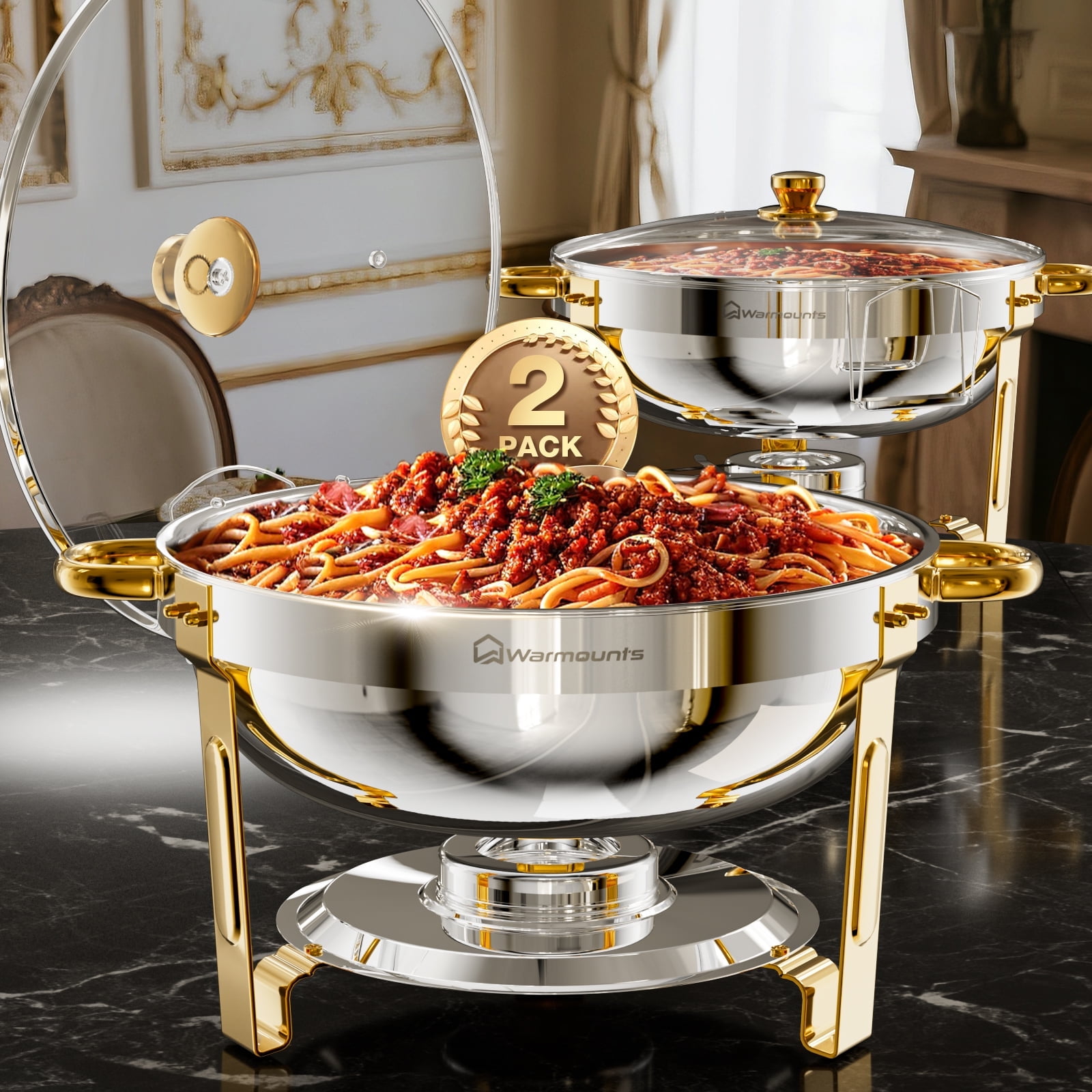 WARMOUNTS Gold Chafing Dish Buffet Set 2 Pack, 5QT Round Stainless Steel Chafers and Buffet Warmers Sets with Glass Lid & Lid Holder for Parties Catering Events, Polished & No Finger Cuts