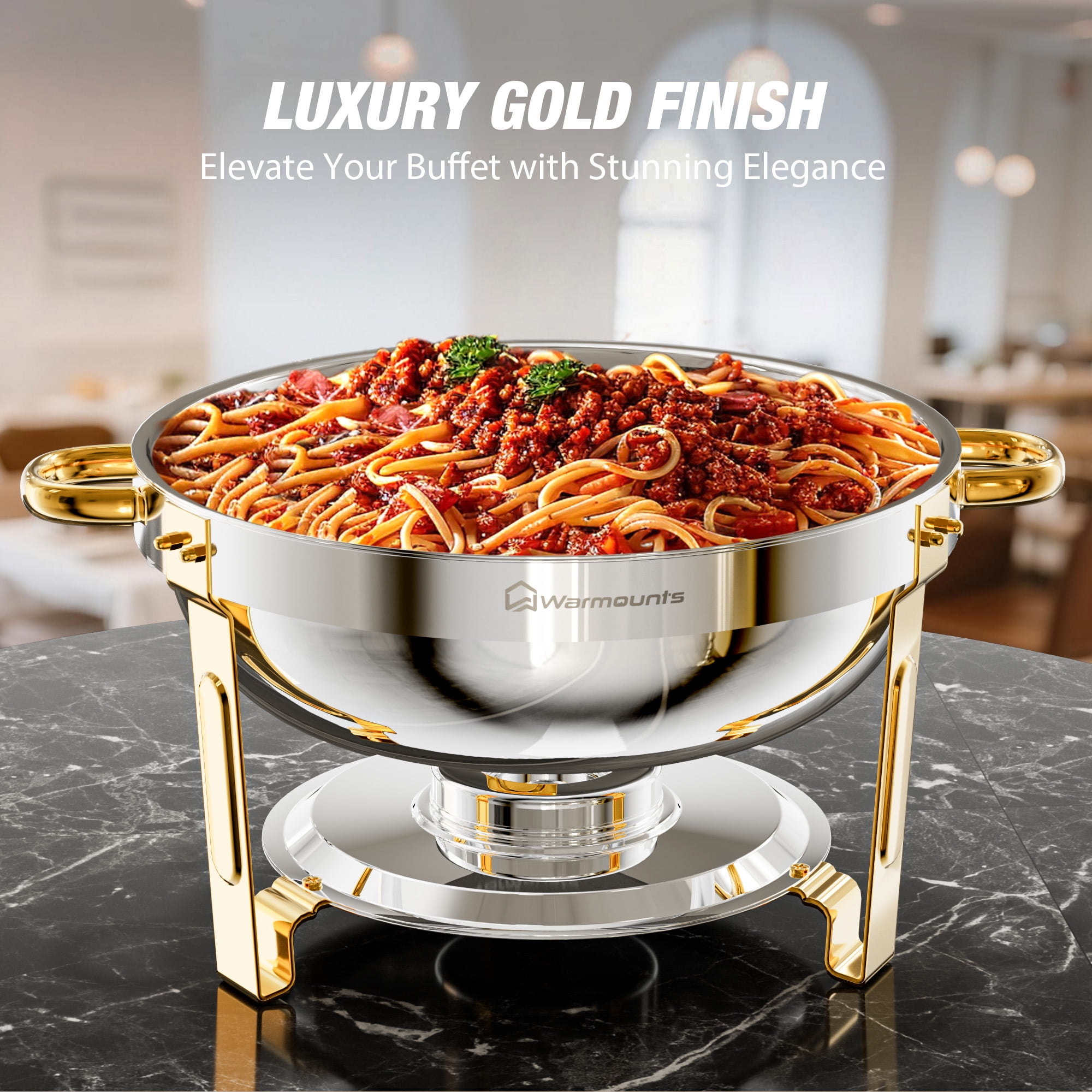 Key Features [CRAFTED FOR STRENGTH, DESIGNED FOR SAFETY] Warmounts Upgrade gold chafing dishes for buffet are made of thickened food-grade stainless steel, which ensures safer use and is less prone to rusting. The edges of both the water pan and food pan are meticulously. [SAVOR THE PARTY, RELISH THE EASE] Gold chafing dish buffet set features lid holder that prevent contact with tables, ensuring cleanliness and convenient access. [MORE SPACE, MORE DELICIOUSNESS] With a 5-quart capacity, the round chafing dish can serve at least 5 people, making it ideal for various gatherings, whether a wedding, banquet, or larger event. You can use it to serve a variety of dishes, such as main courses, side dishes, soups. [EVERY DISH, JUST RIGHT TEMPERATURE] Chafers for catering comprise 1 water pan & 1 food pan, capable of maintaining both hot and cold temperatures consistently. This temperature stability ensures a uniform flavor in the food, enhancing the dining experience for guests. [CLEAN FAST, SHINE ON] The gold chafers and buffet warmers sets undergo a meticulous precision polishing process, rendering them simpler to cleanse. You can easily wipe them down, saving valuable time during post-event cleanup. Specification: -Quantity: 2 -Capacity: 5QT -Product Weight: 12.76 lbs -Material: Food-Grade Stainless Steel -Heating Method: Fuel -Food Pan Size: 13.2″ x 2.78” -Water Pan Size: 13.2″ x 3.5″ Package Included: 2 x Chafing Dish Frame 2 x Food Pan 2 x Water Pan 2 x Fuel Can 2 x Lid Holder 2 x Glass Lid