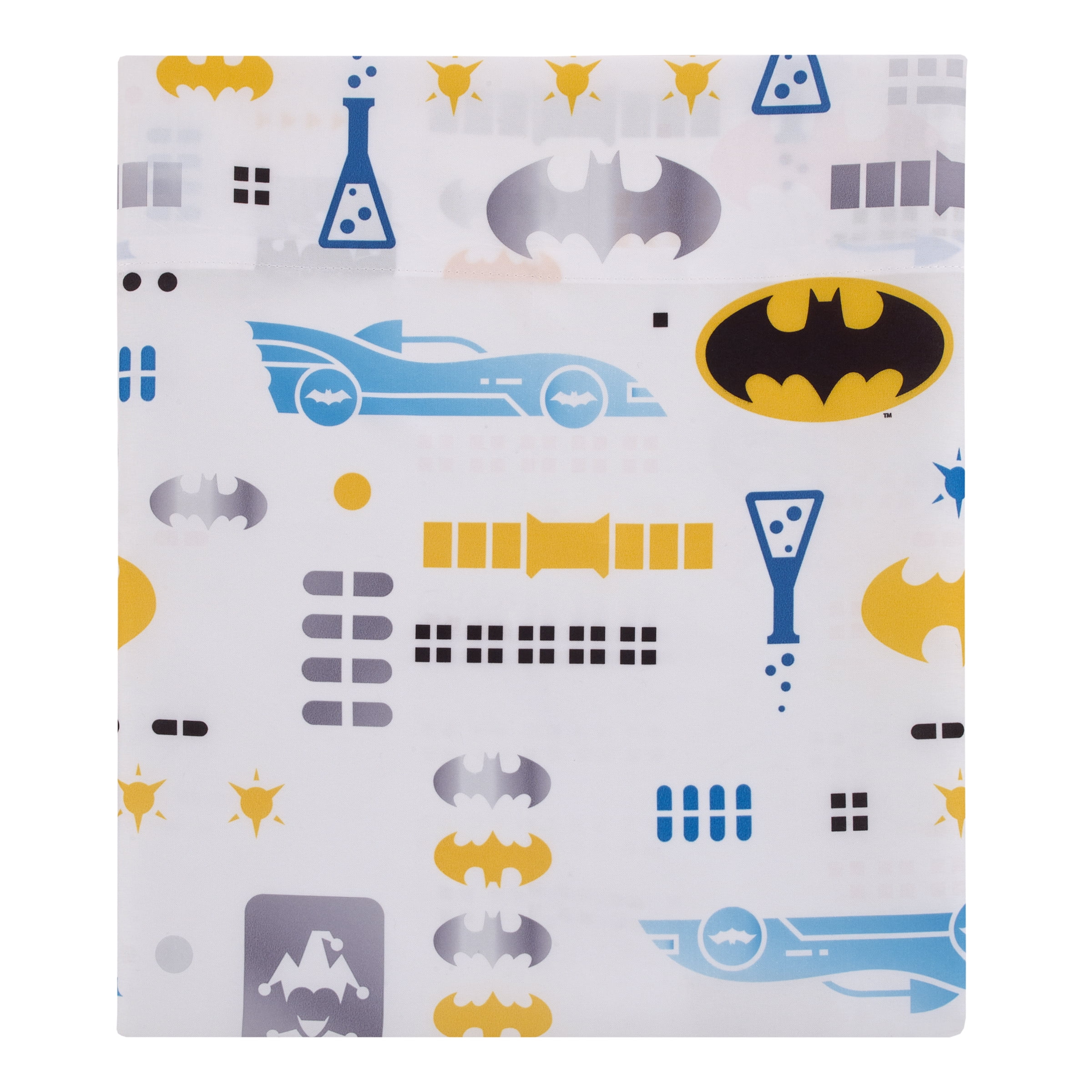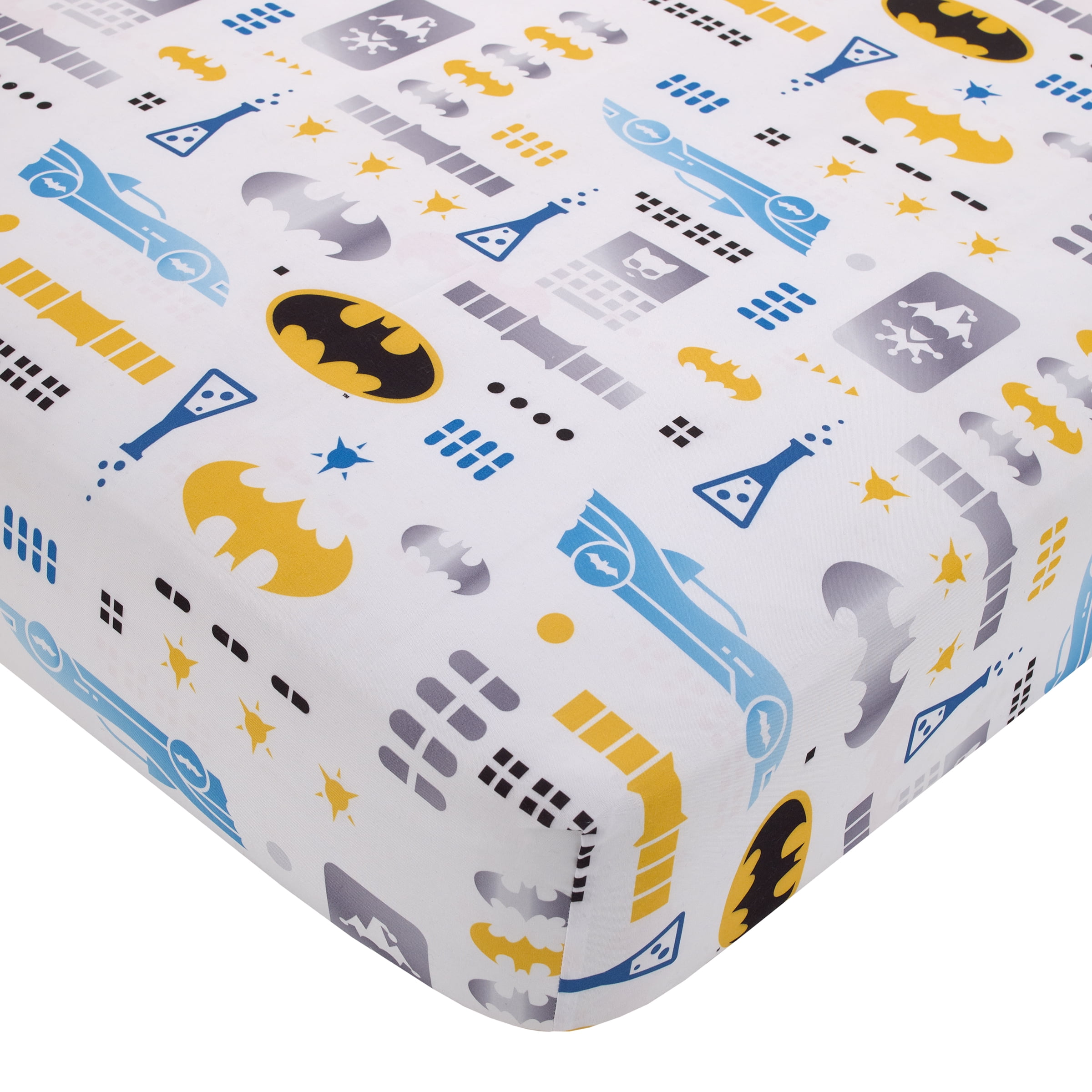 This exciting 4-piece toddler set Includes a comforter, fitted bottom sheet, flat top sheet, and reversible pillowcase Features Batman and the Bat-Signal ready for action in bold colors of blue, gray, navy, yellow, and white Includes everything you’ll need for a coordinated look